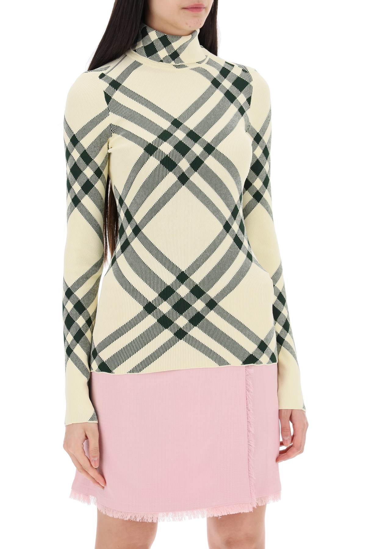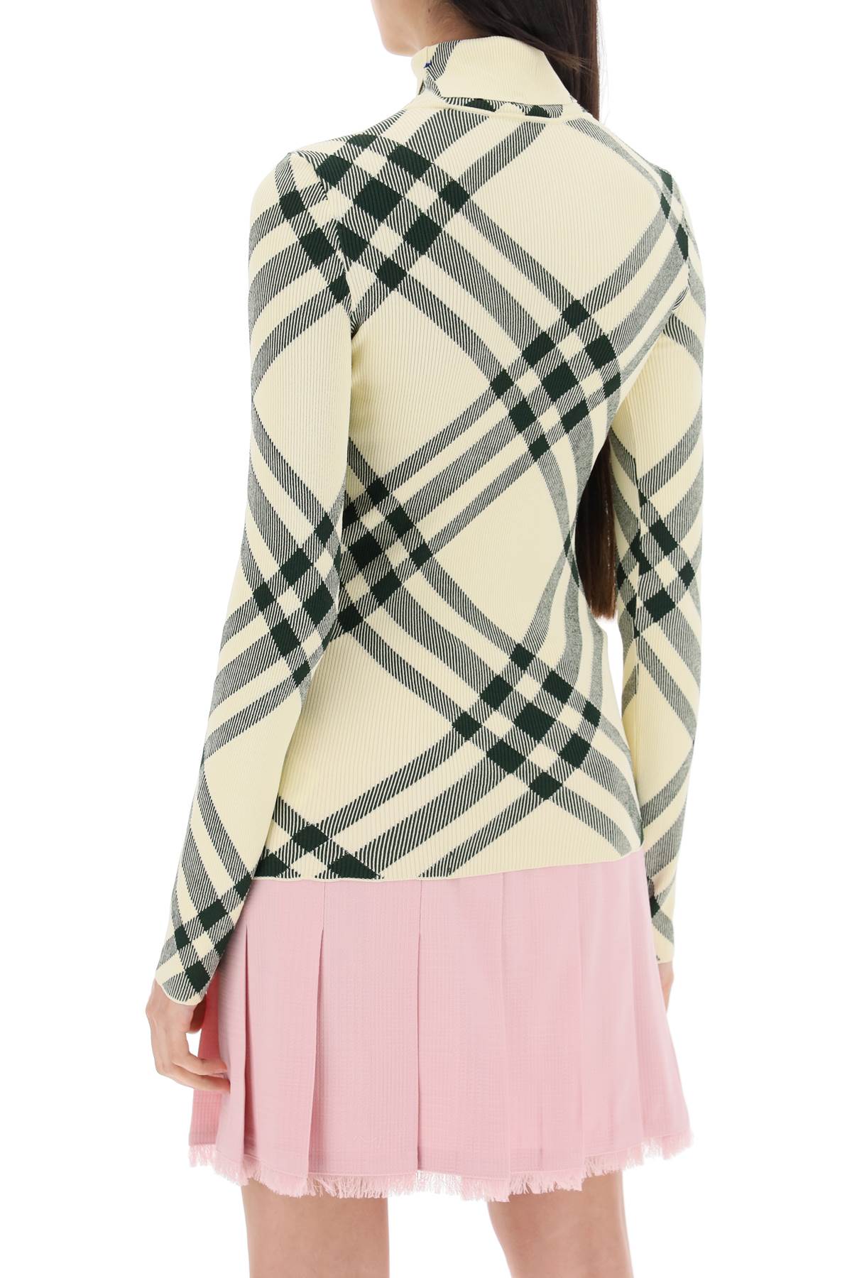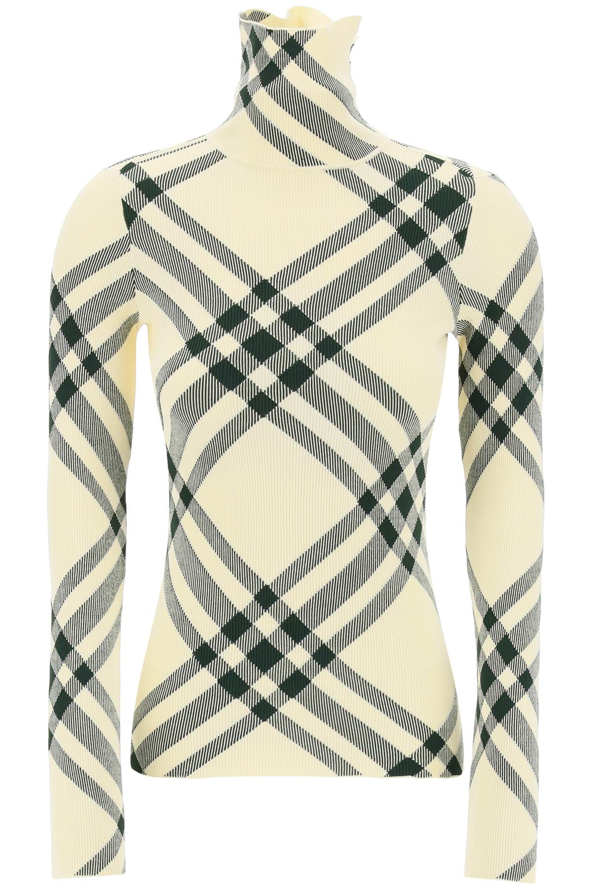 This Burberry pullover is made of a thin ribbed viscose blend knit with an all-over Check pattern. It features a high collar and stands out for its fitted silhouette. The model is 177 cm tall and wears a size S.