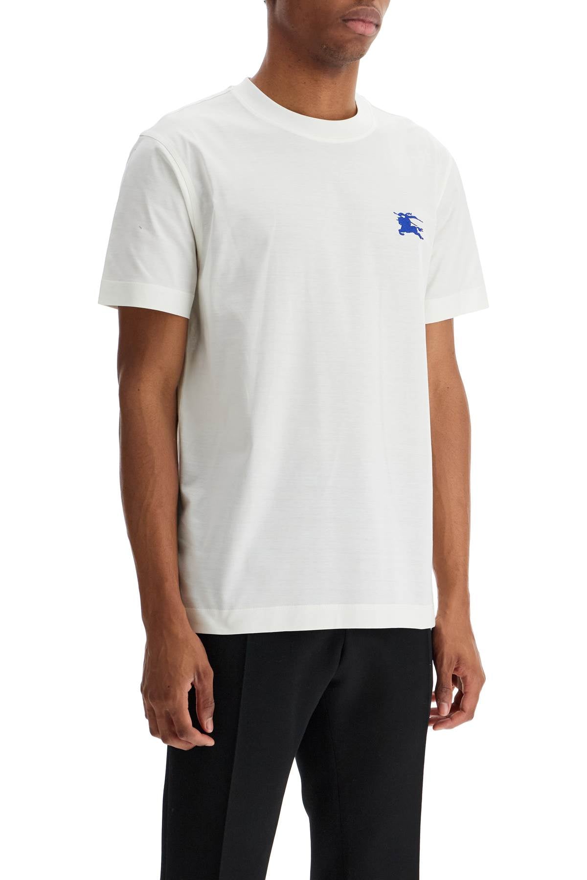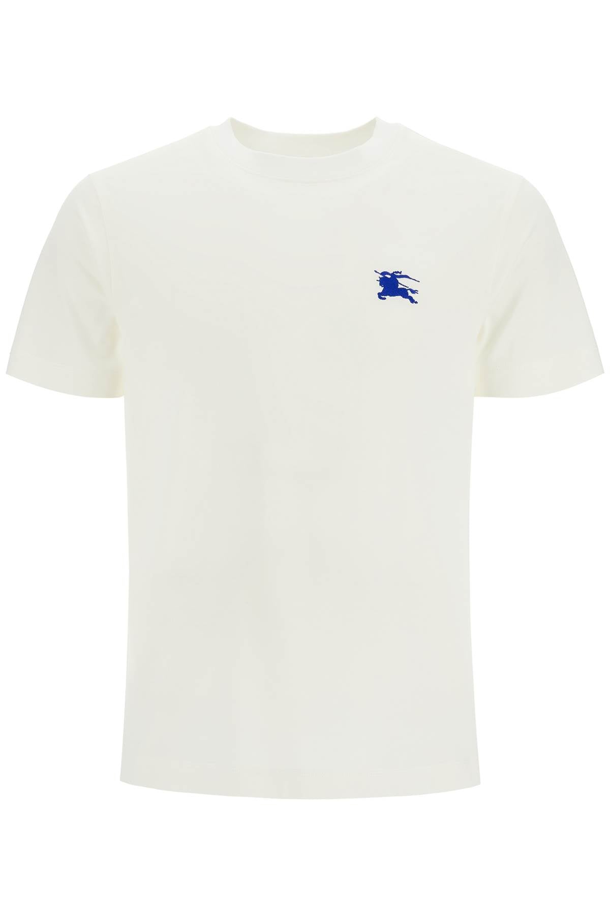 This Burberry crew neck t-shirt is made of pure cotton jersey and features a contrasting Equestrian Knight Design embroidery on the chest. It has a regular fit and the model is 182 cm tall, wearing size M.
