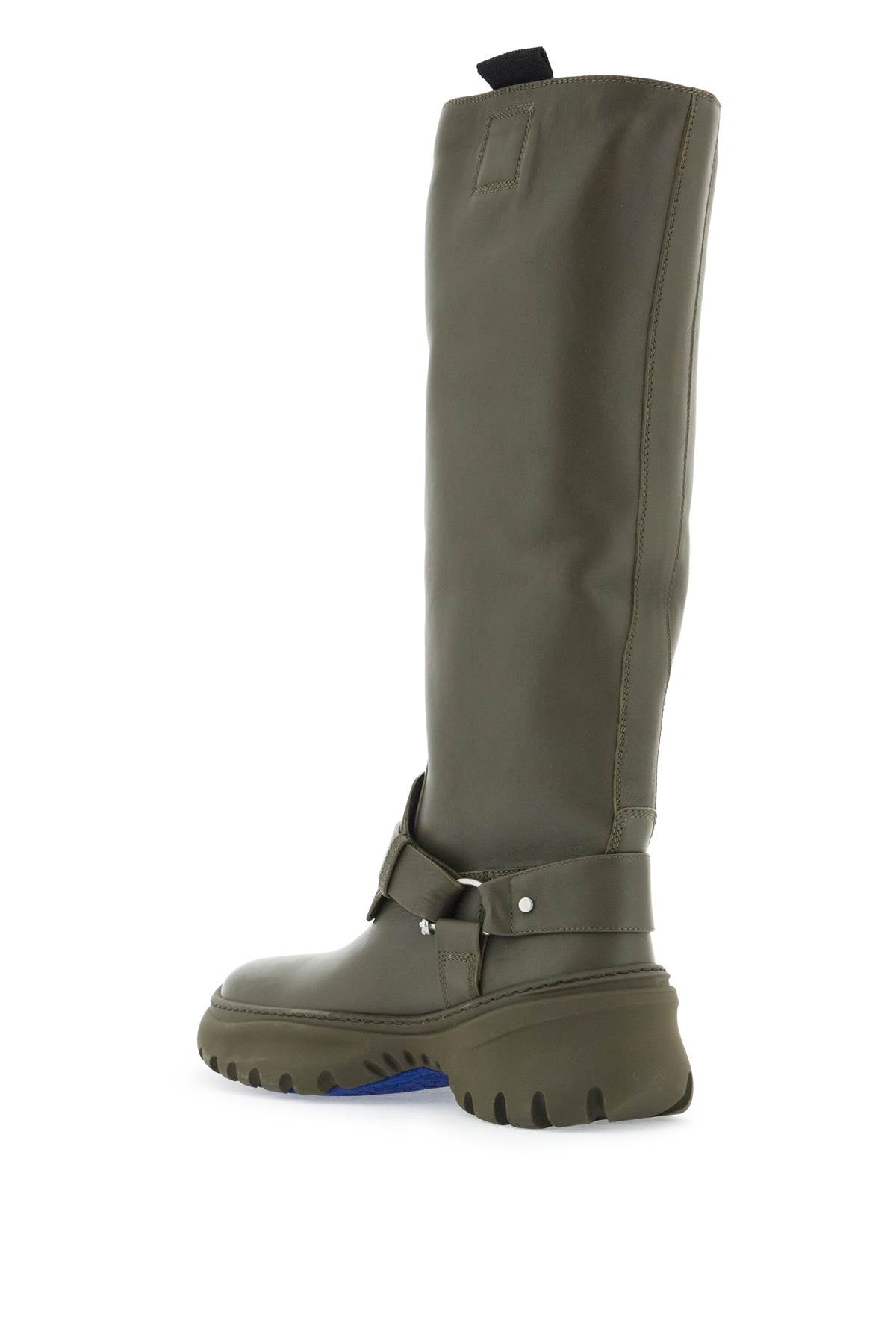 Burberry equestrian-inspired boots made of soft smooth leather and featuring an adjustable strap with a B-shaped antique metal buckle and reinforced front insert. Double top straps, leather interior, and rubber sole with grooves and embossed Equestrian Knight Design. Size and Fit - Heel Height = 6 cm,