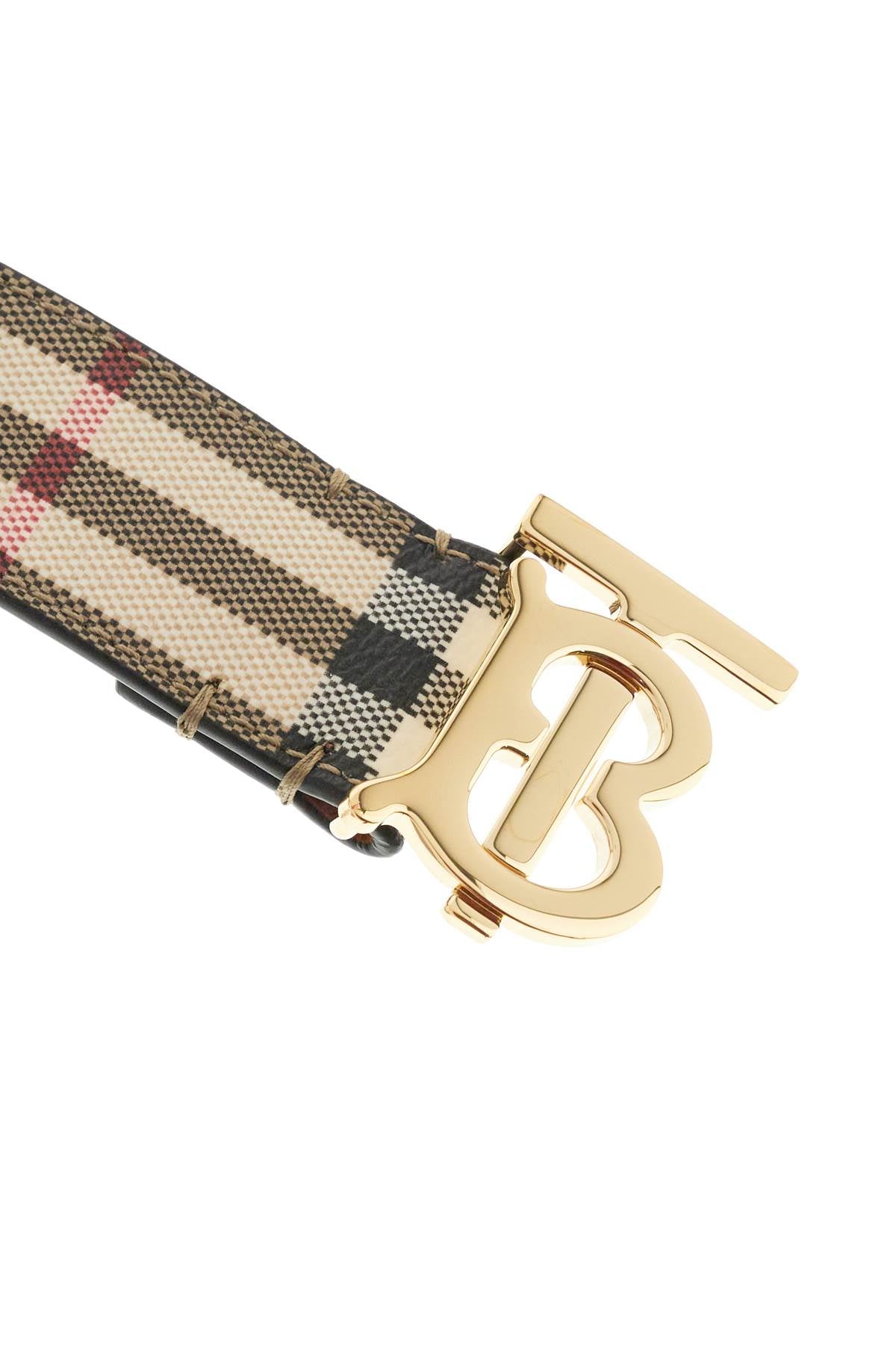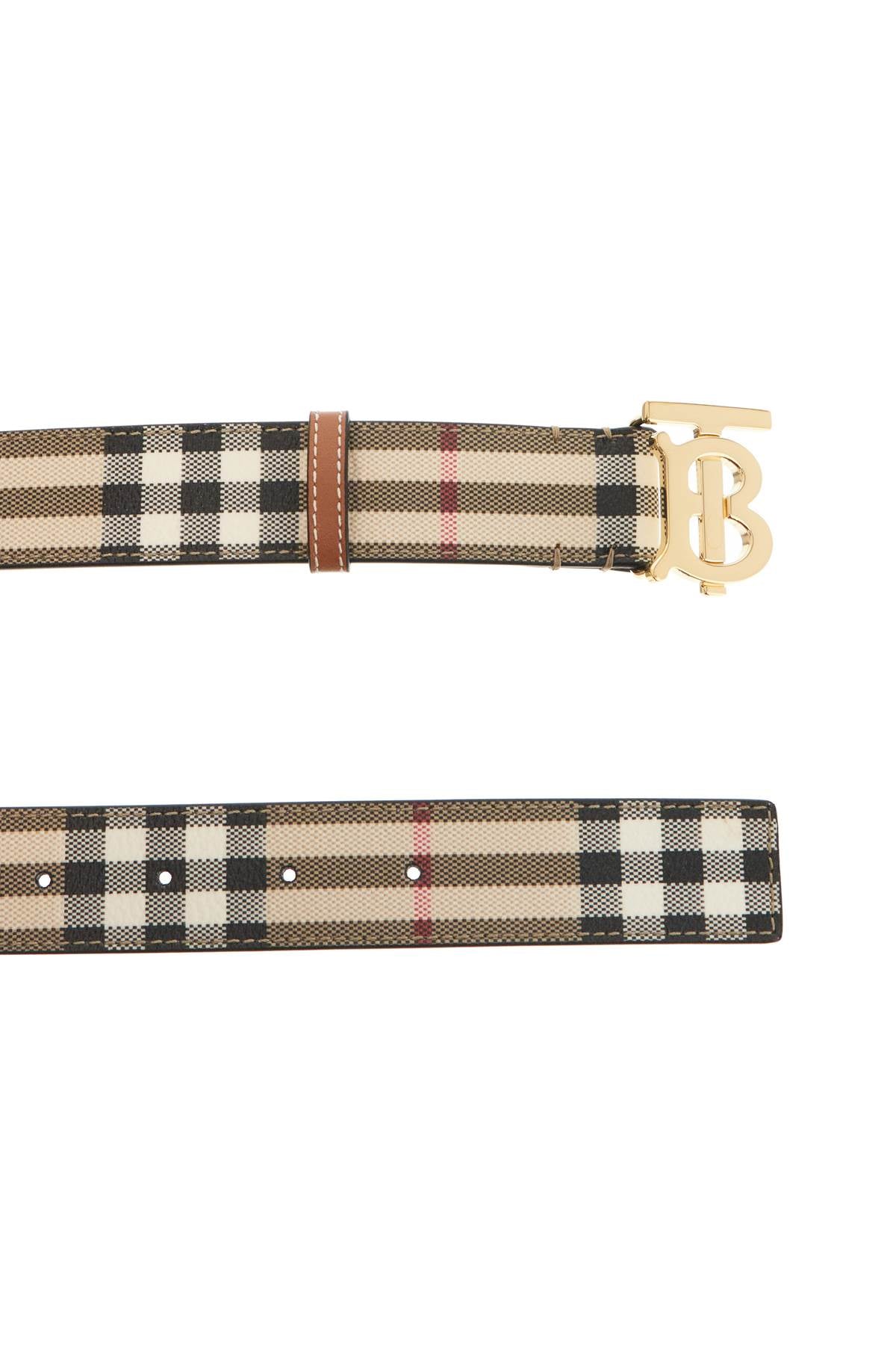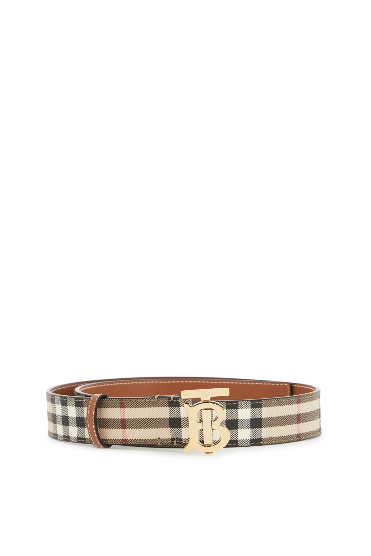 This Burberry belt is made of coated canvas with the iconic Check pattern and features a customized TB buckle in shiny gold metal. The inside is lined with smooth leather. The item shown in the photo corresponds to size S.