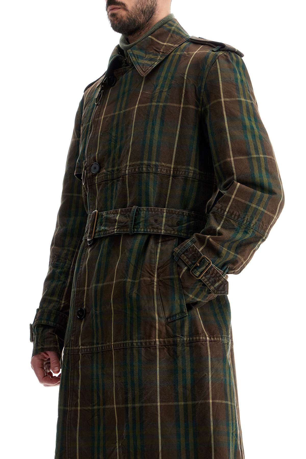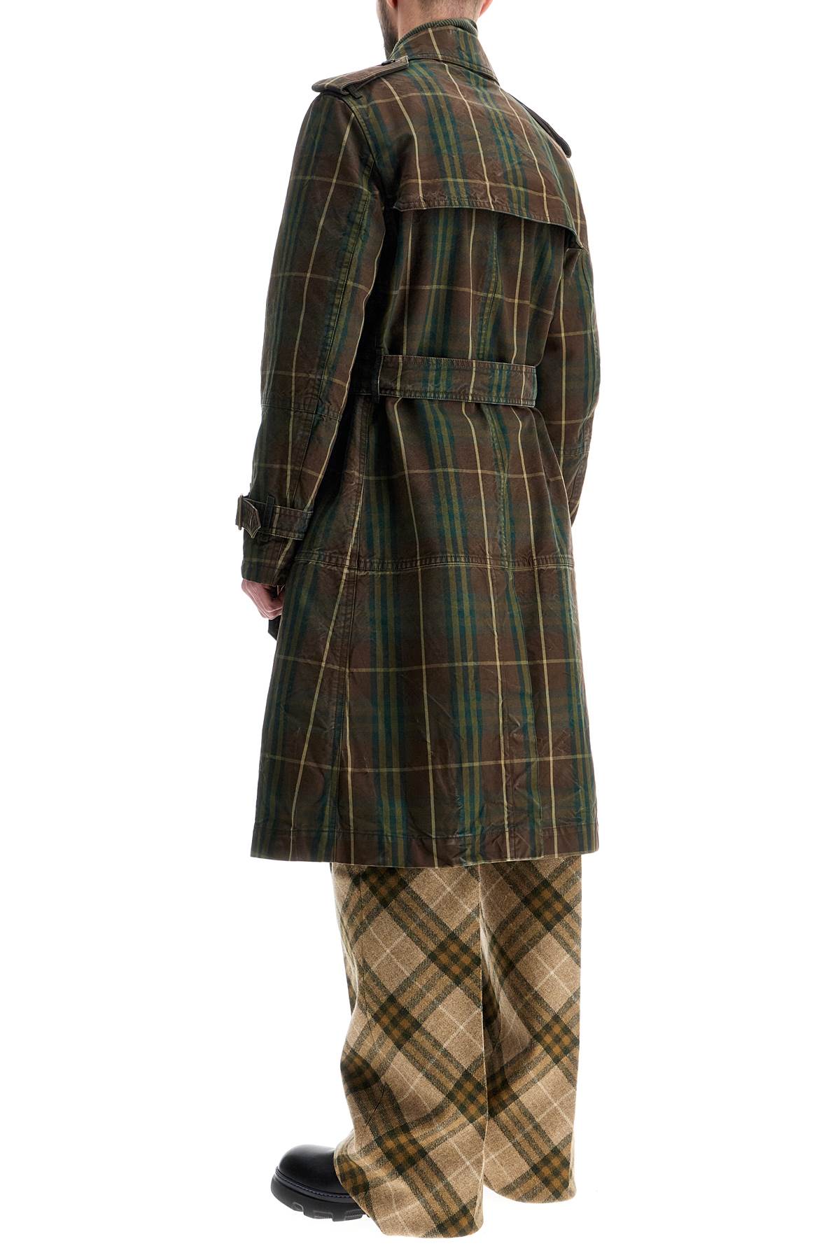 Long double-breasted trench coat made of Burberry Check cotton canvas with a vintage wash. It features a matching belt with a B buckle and a single row of exposed buttons, classic collar with hook closure, shoulder epaulettes, wrist straps, back center slit, and side flap pockets. The windproof zippered panel on the chest and the traditional flap on the back complete the design. Semi-lined interior, regular fit. The model is 187 cm tall and wears size IT 48