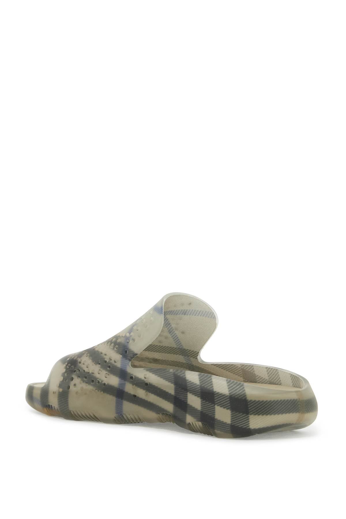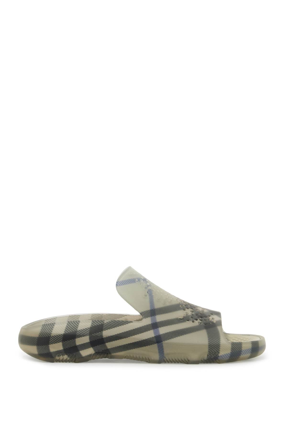 The Stingray slides are made of transparent rubber with a Burberry Check interior and a molded sole featuring a large logo lettering imprinted on the bottom. The left foot is decorated with a removable Equestrian Knight Design patch in rubber, while the textured insole showcases an embossed EKD design. Size and Fit - Heel Height = 3,5 cm,