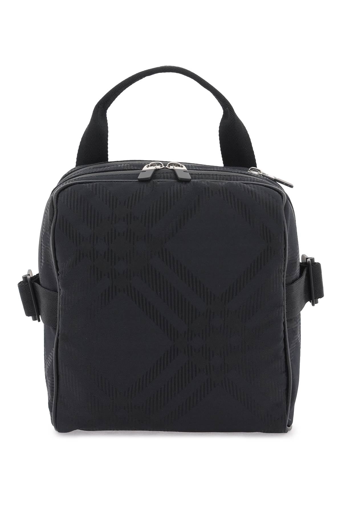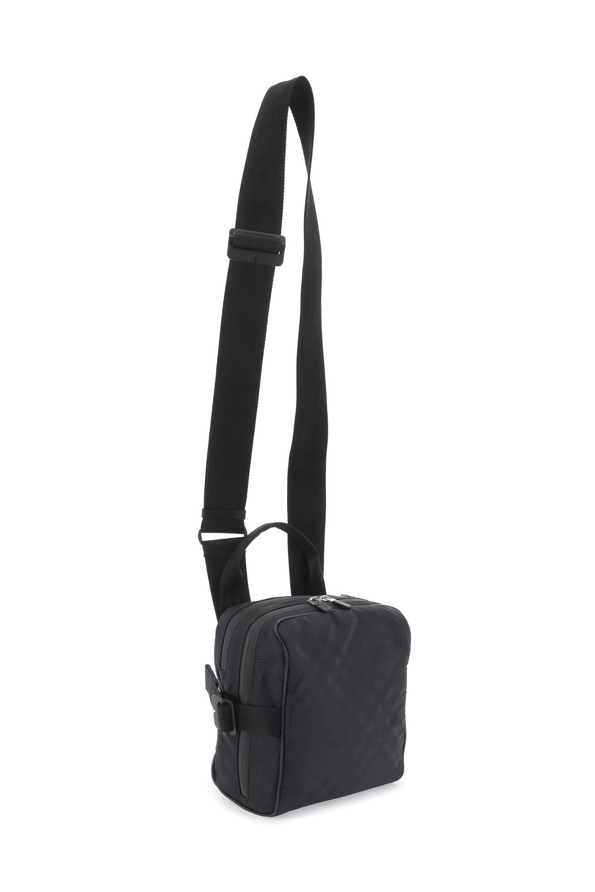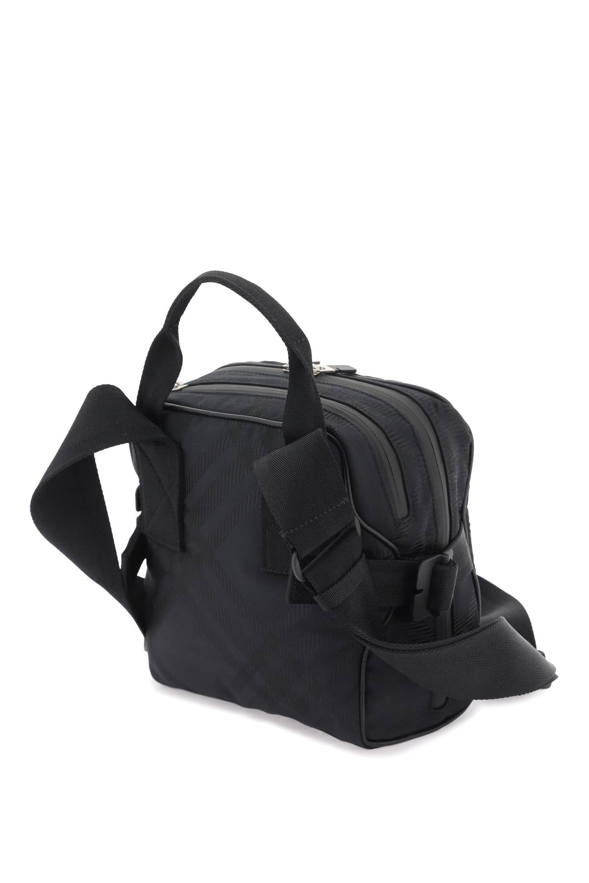 This Burberry crossbody bag is made of nylon with a jacquard Check pattern and features a boxy shape. It has two compartments with hidden zip closures, one of which has an internal pocket. The sides have adjustable straps and the shoulder strap can be adjusted with a ribbon. The metal hardware matches the tone of the bag. Size and Fit - Bag Length = 20,5 cm, Bag Height = 21,5 cm, Bag Weight = 11,5 cm, Shoulder Bag Length = 120 cm,