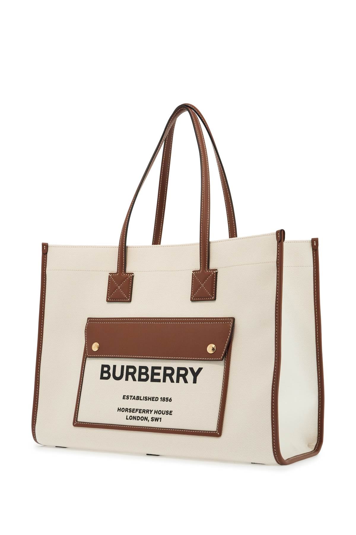 Medium Freya cotton canvas tote bag with contrasting leather trim and handles and iconic Horseferry print on front pocket. Snap-button closure, lined interior with one zippered pocket, and gold-finished metalware. Size and Fit - Bag Length = 40 cm, Bag Height = 30 cm, Bag Weight = 15 cm, Handle Height = 20,5 cm,