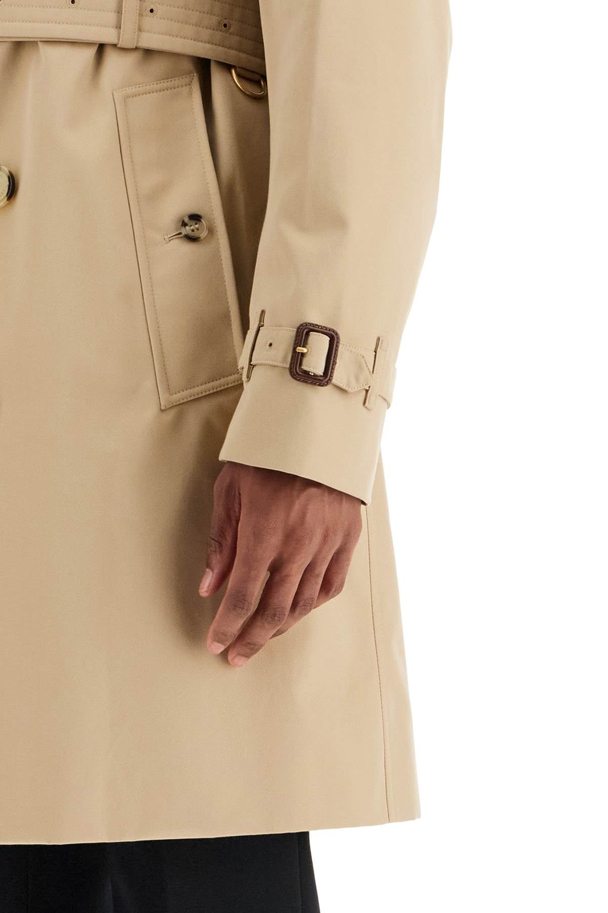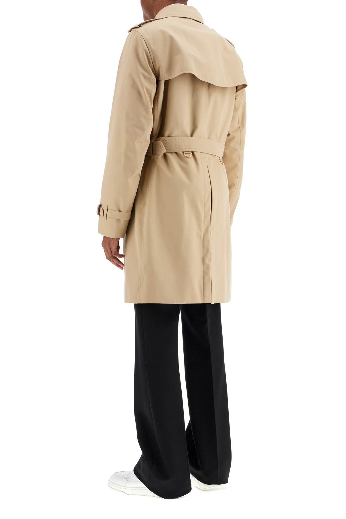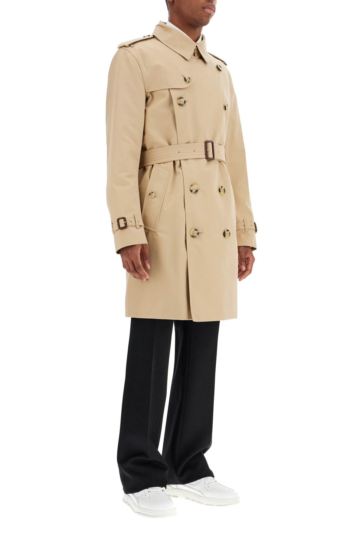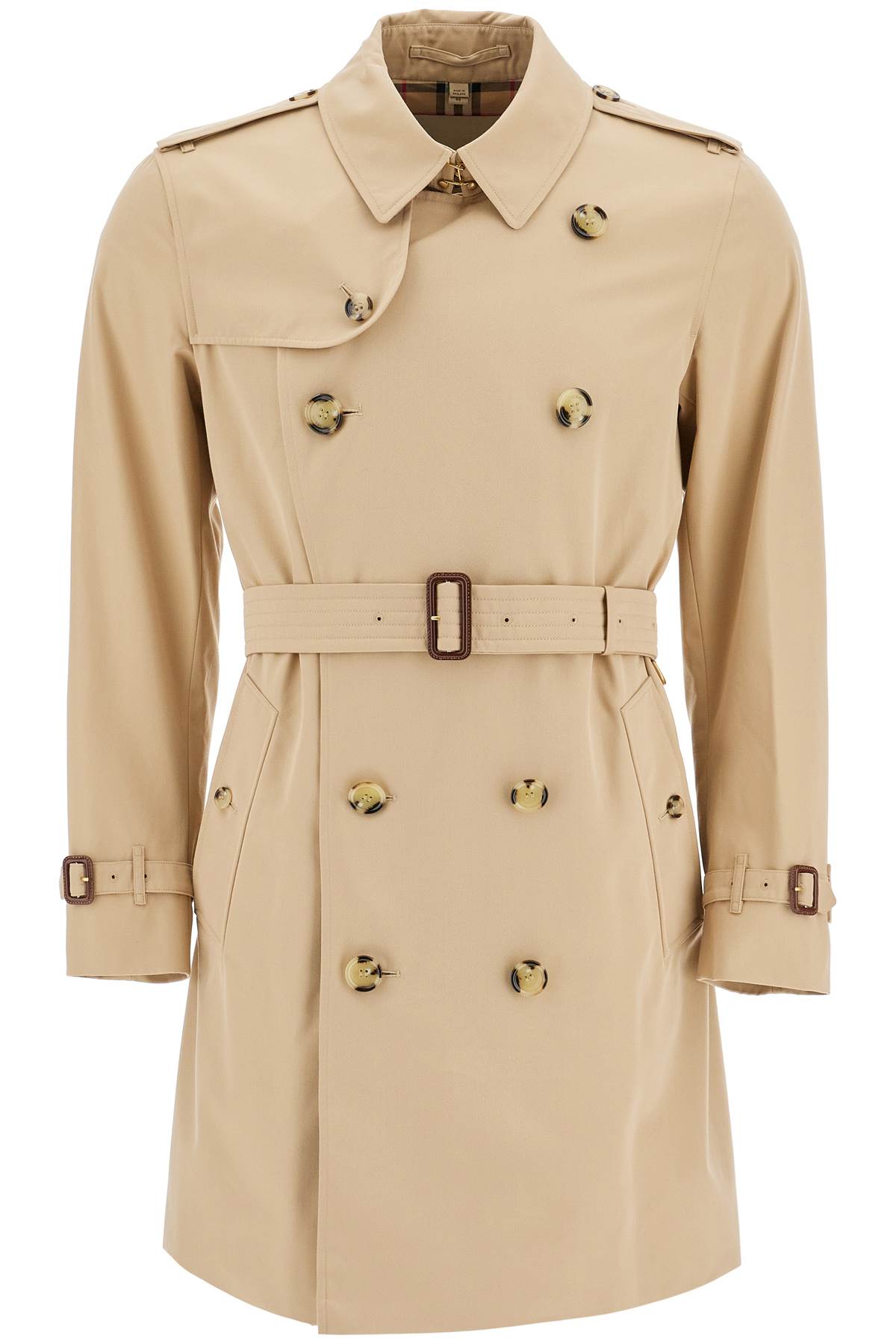 The iconic Kensington trench coat by Burberry in a medium size, made of water-repellent organic cotton gabardine. It features a double-breasted closure with buttons, a hook collar and hidden throat latch at the back, shoulder epaulettes, welt pockets on the sides, and adjustable straps at the wrists. The classic wind flap, back storm shield, and center back vent complete the outerwear, which is finished with a undercollar and lining in Burberry Check cotton and