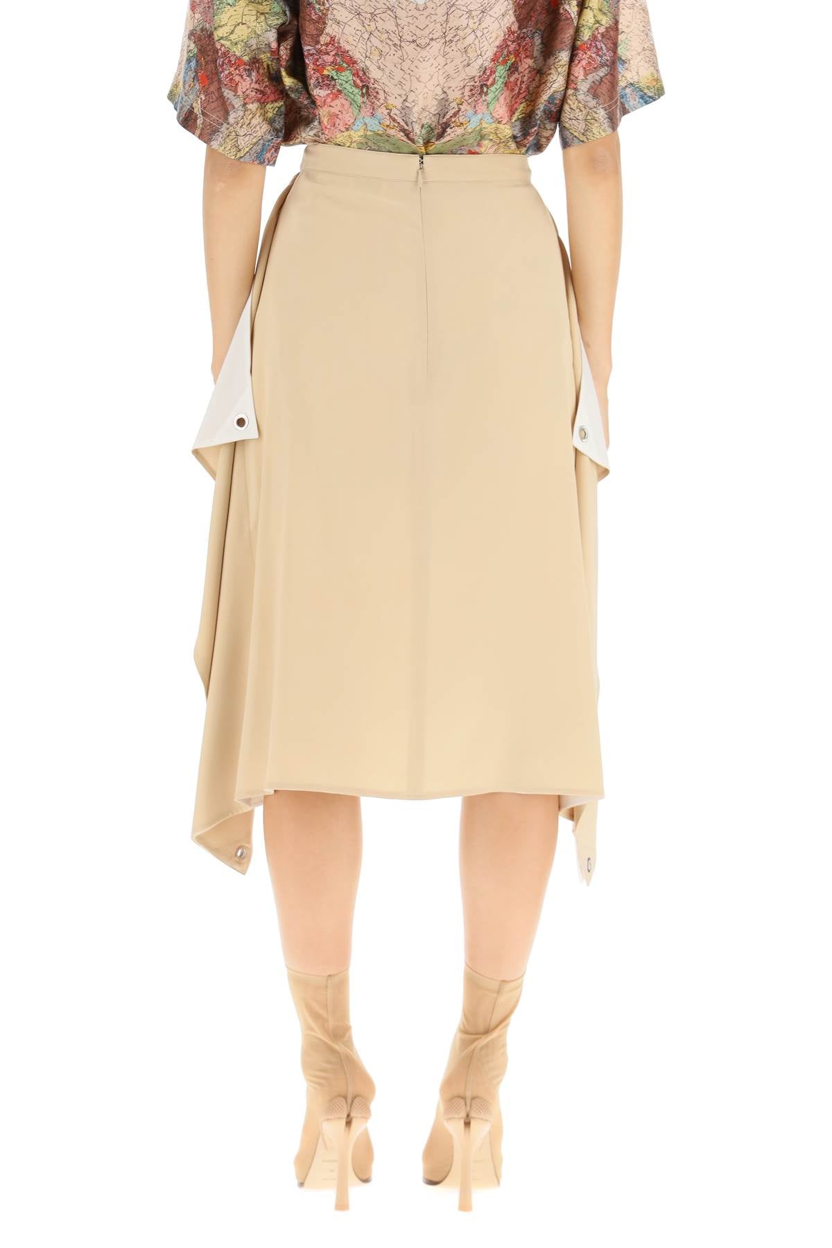 Burberry midi skirt in double pure silk crepe with contrast interior, embellished with draped panels on the sides and finished with metal eyelets. Back invisible zip closure. The model is 177 cm tall and wears a size UK 6.