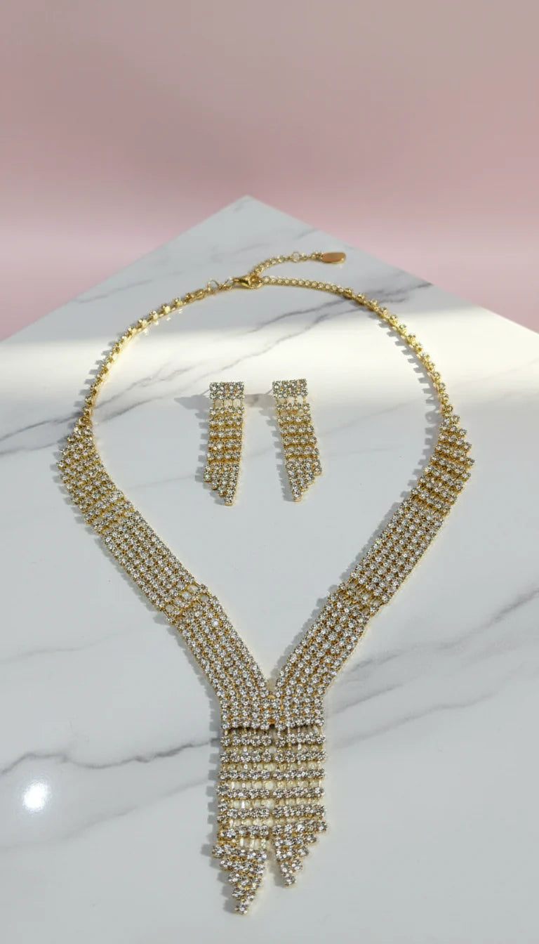 Crystal V Fringe Statement Necklace & Earrings Set