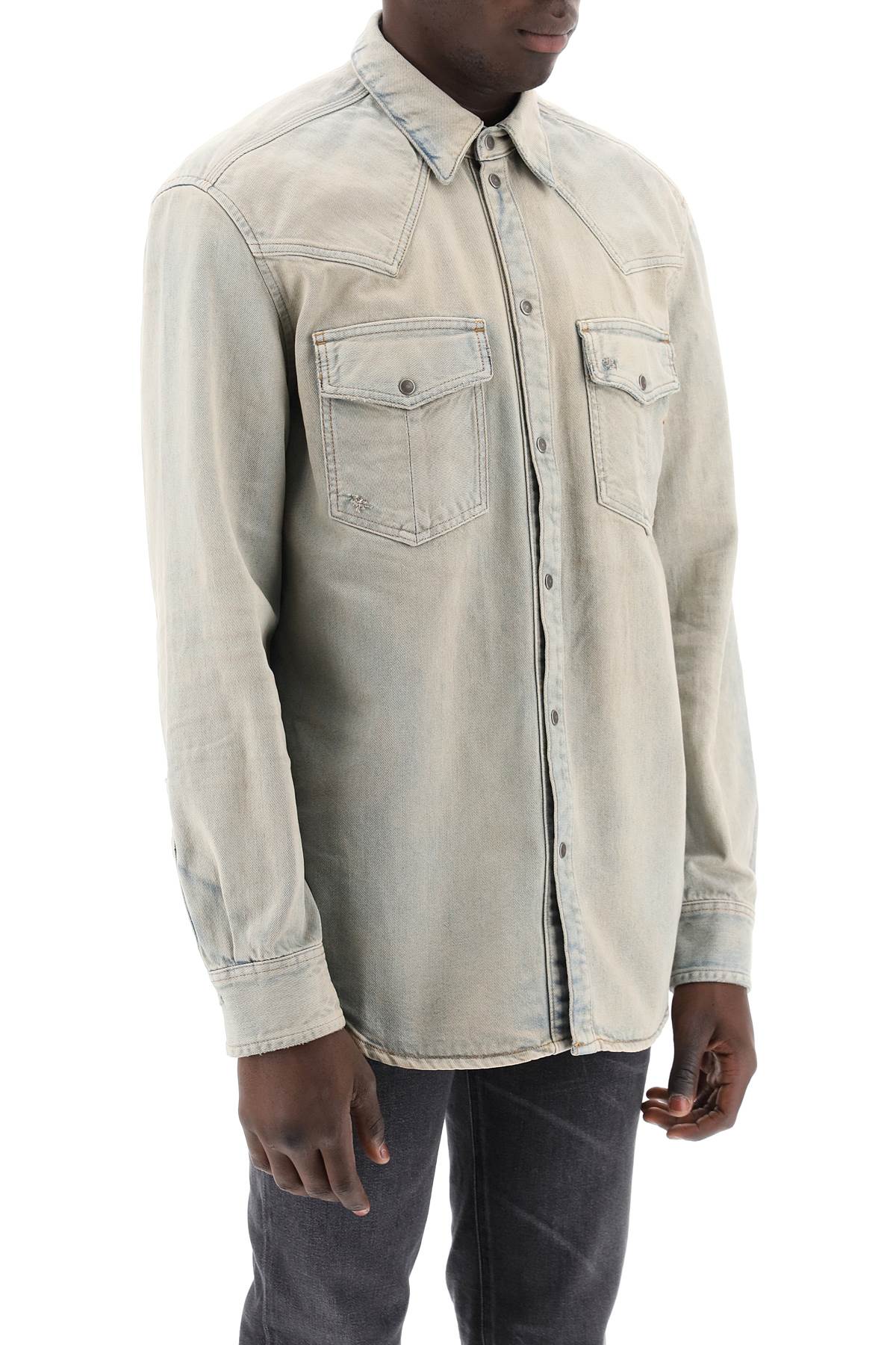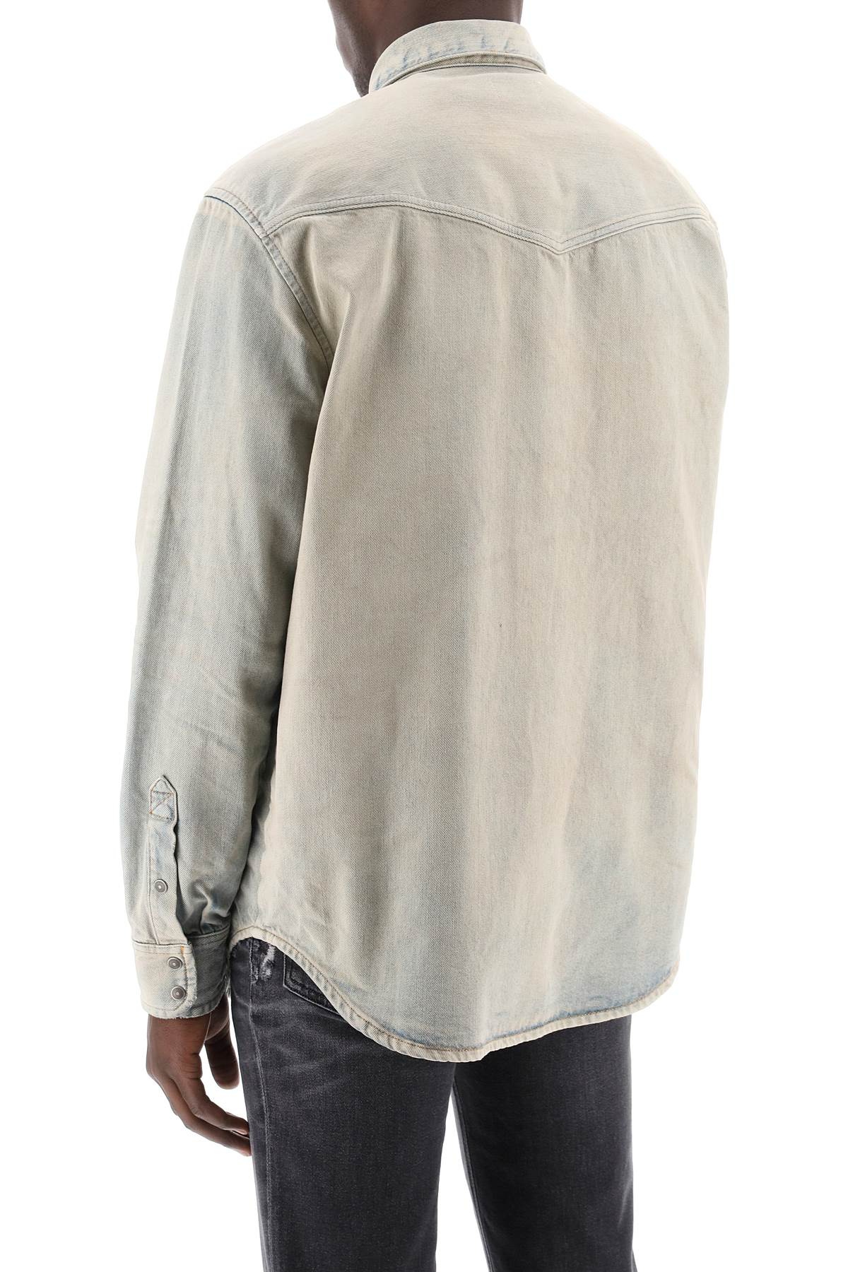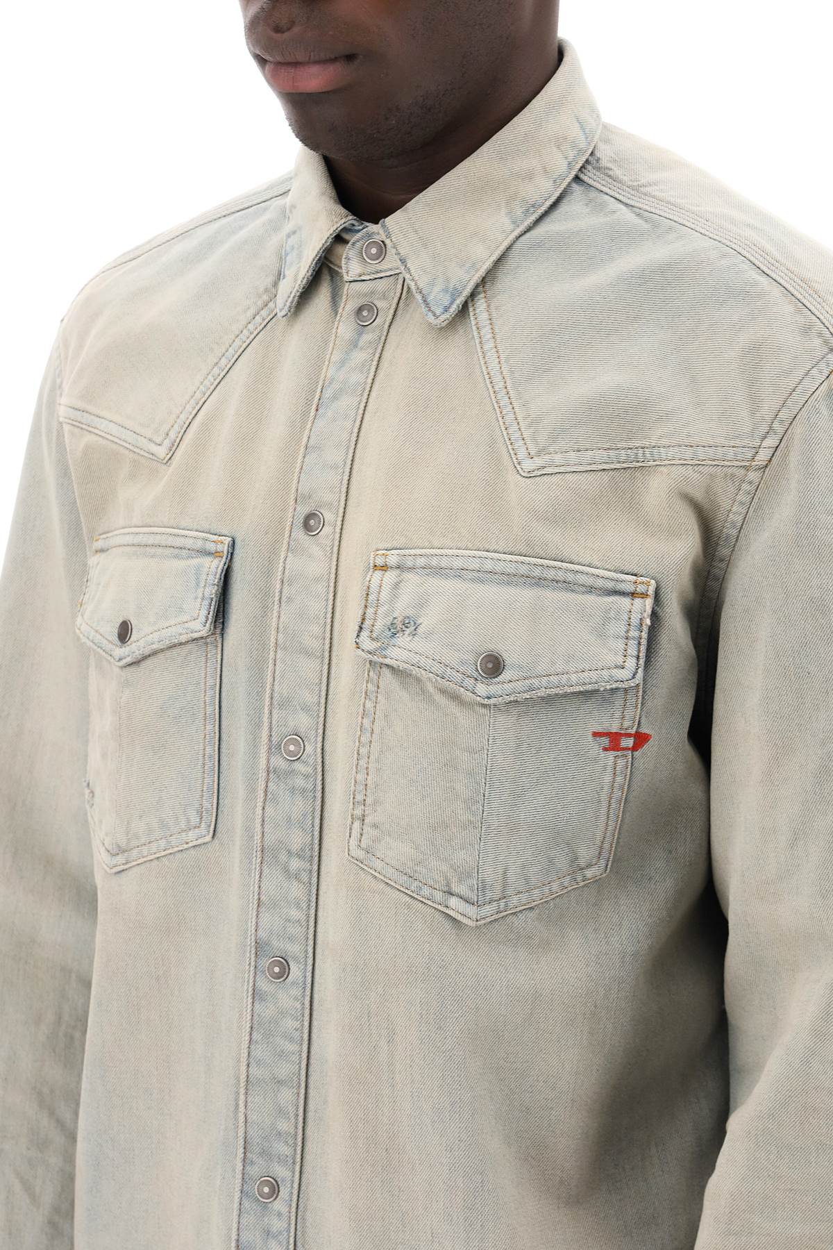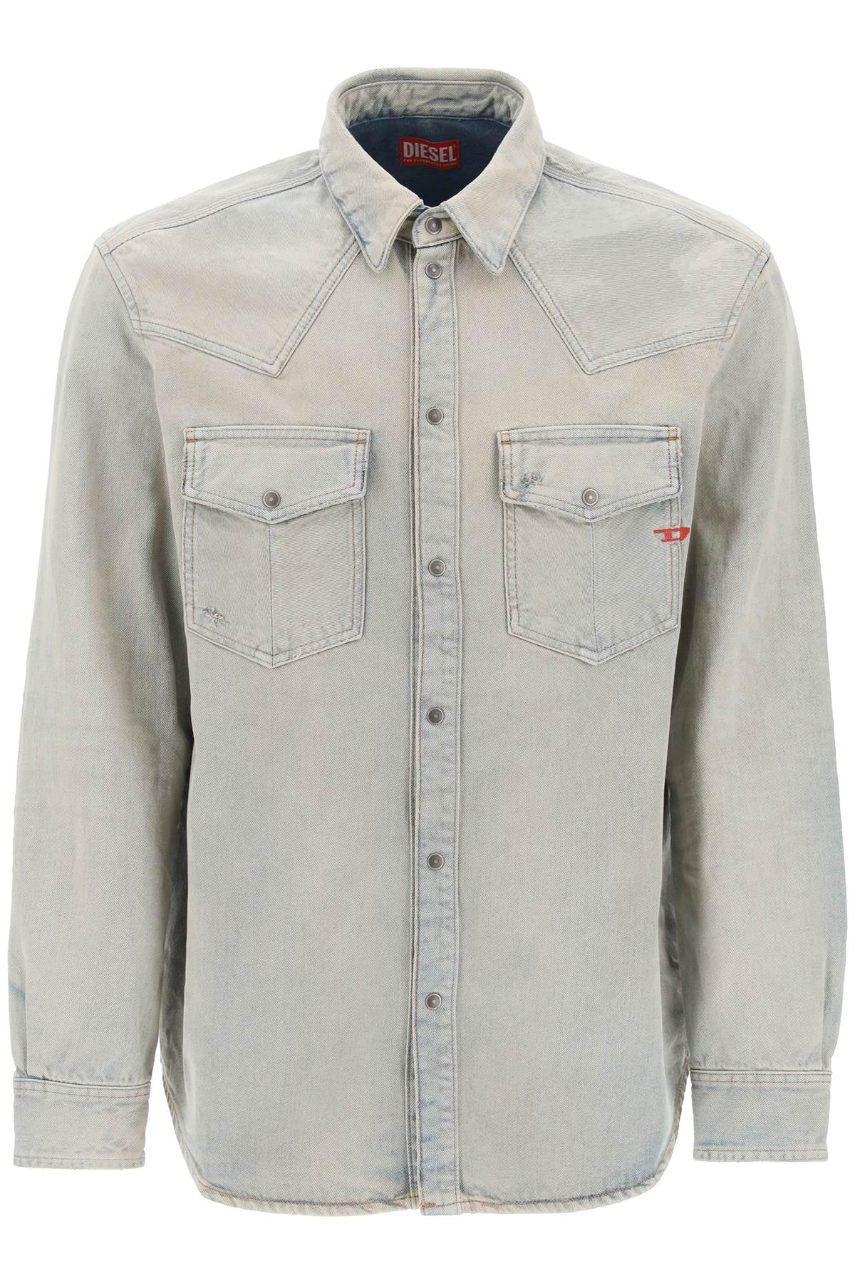 The Diesel Overshirt is made of pure cotton denim with a worn effect, distressed details and a contrasting embroidered D logo on the front. It features a classic collar, snap button closure, front pockets with snap flaps, rounded hemline, and back yoke. Regular fit. The model is 187 cm tall and wears size L.