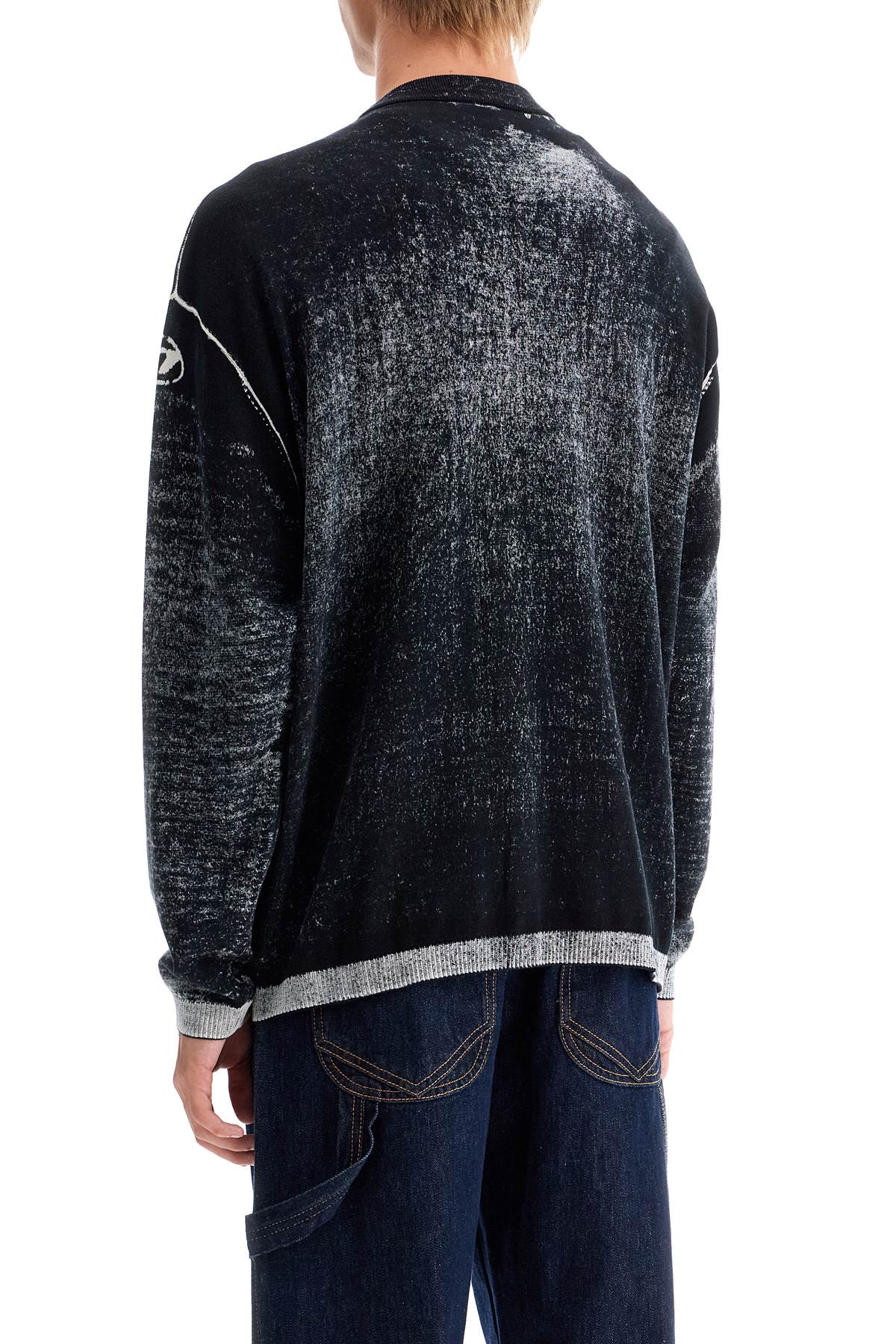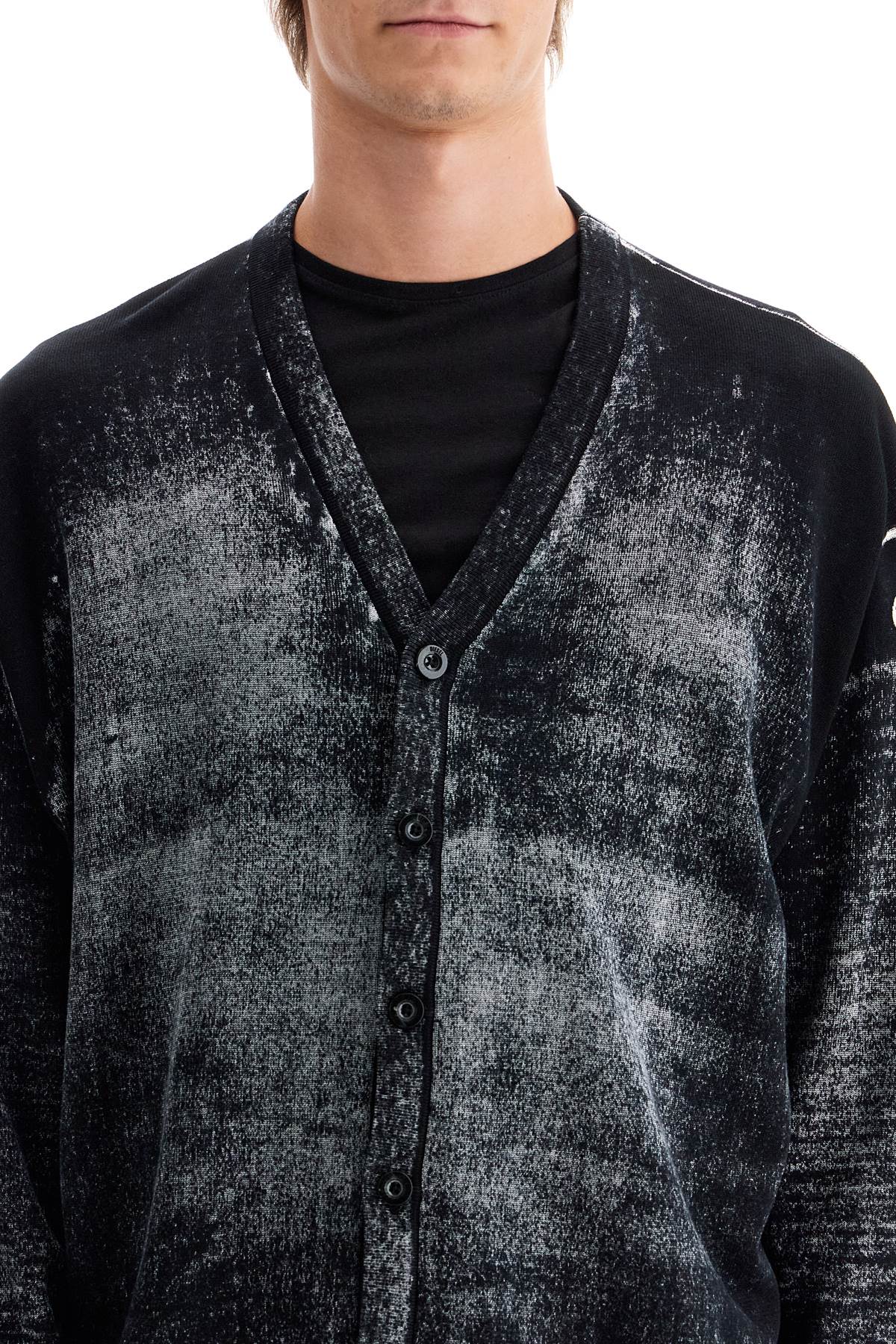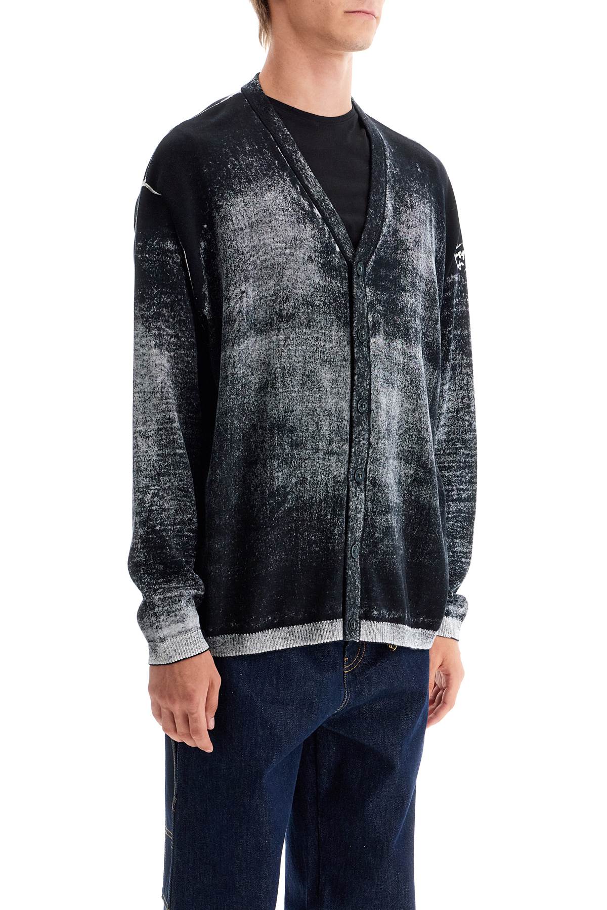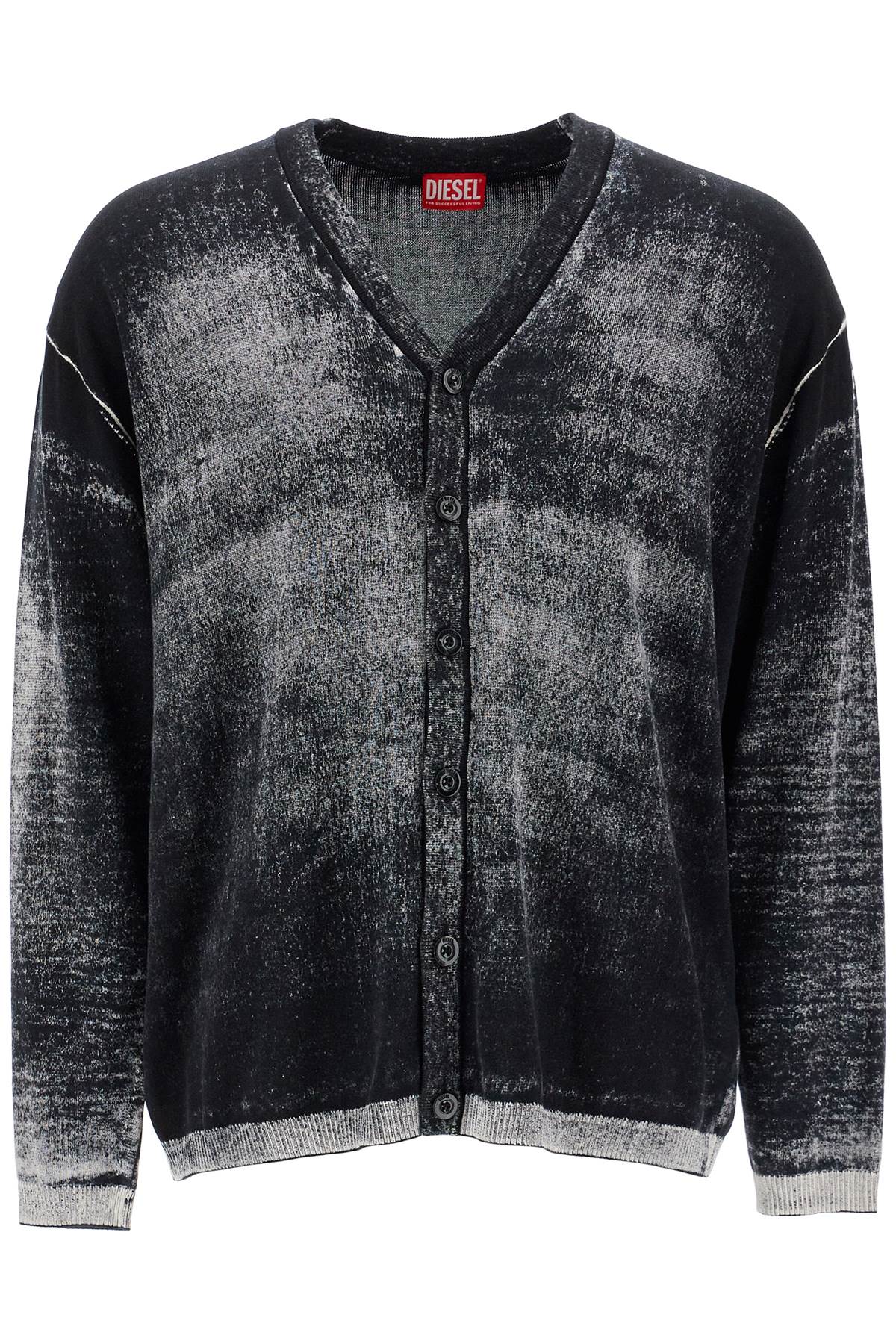 The K-Larence cardigan by Diesel is made of soft gassed cotton yarn and features a print on the inside, creating a faded and non-uniform coloration. The effect of this technique is particularly visible on the edges where the shade is much lighter. Classic V-neckline, button closure, relaxed fit. The model is 187 cm tall and wears size L.