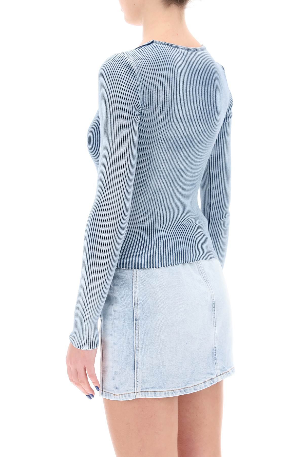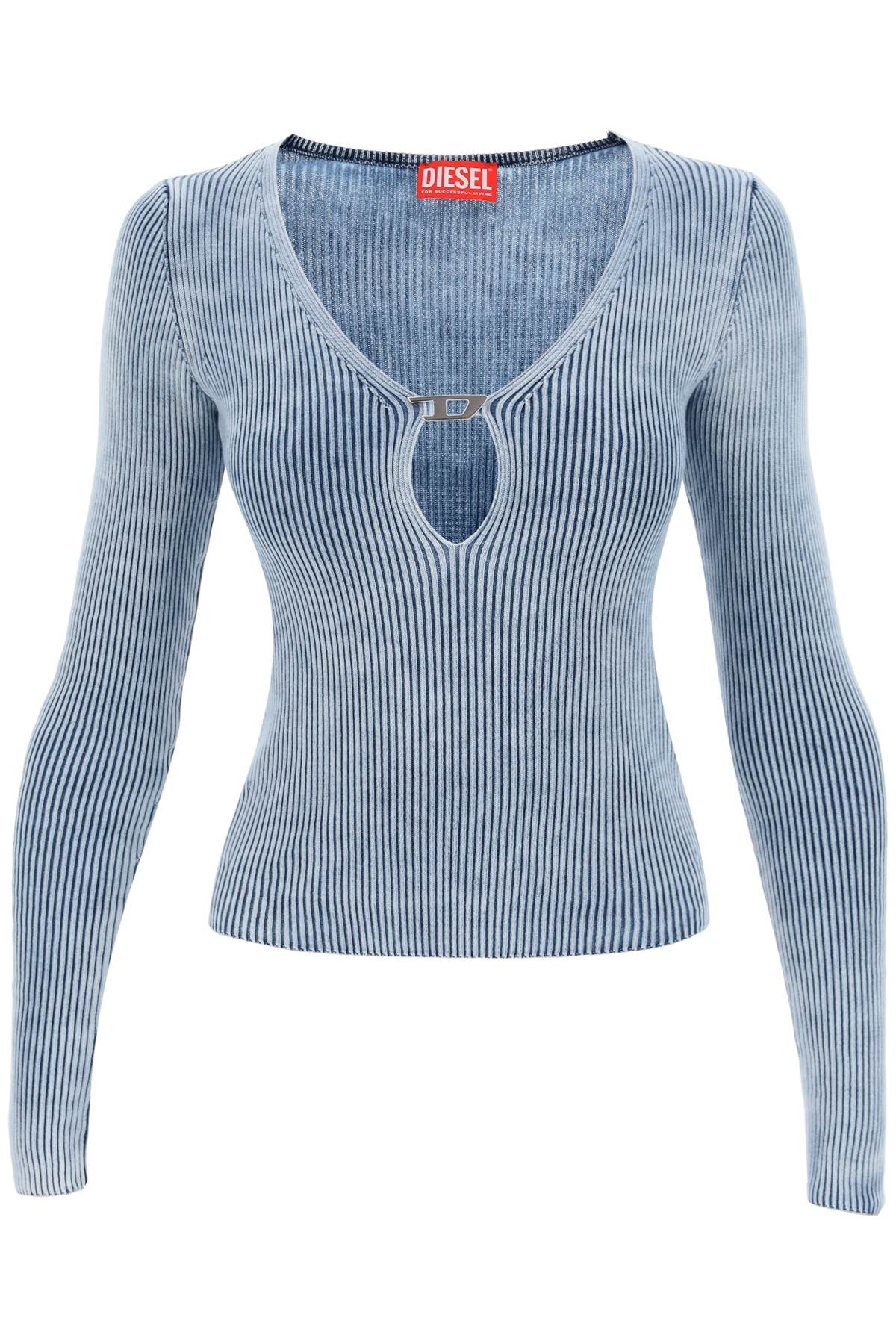 Diesel sweater crafted in bleached-effect ribbed cotton knit, with V neck enriched by cut out and metal D plaque on the chest. Fitted. The model is 177 cm tall and wears size XS.