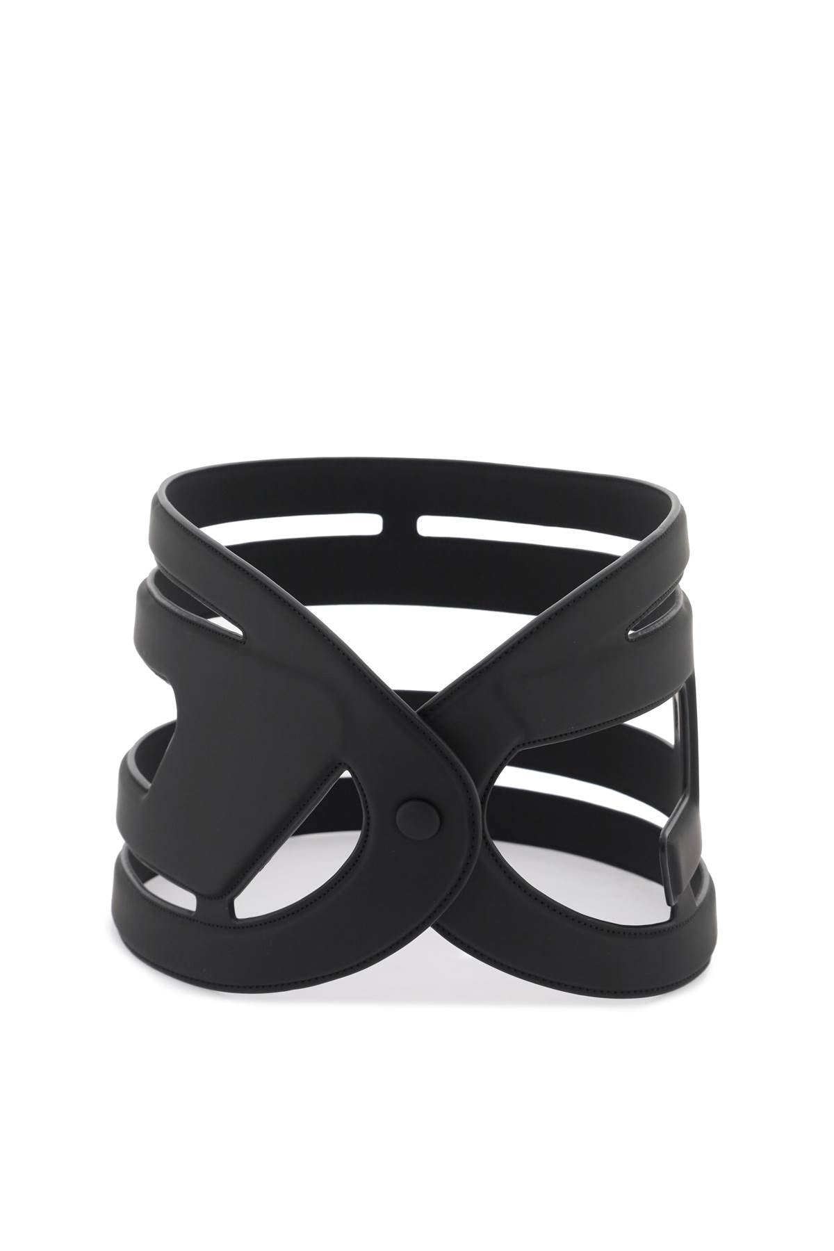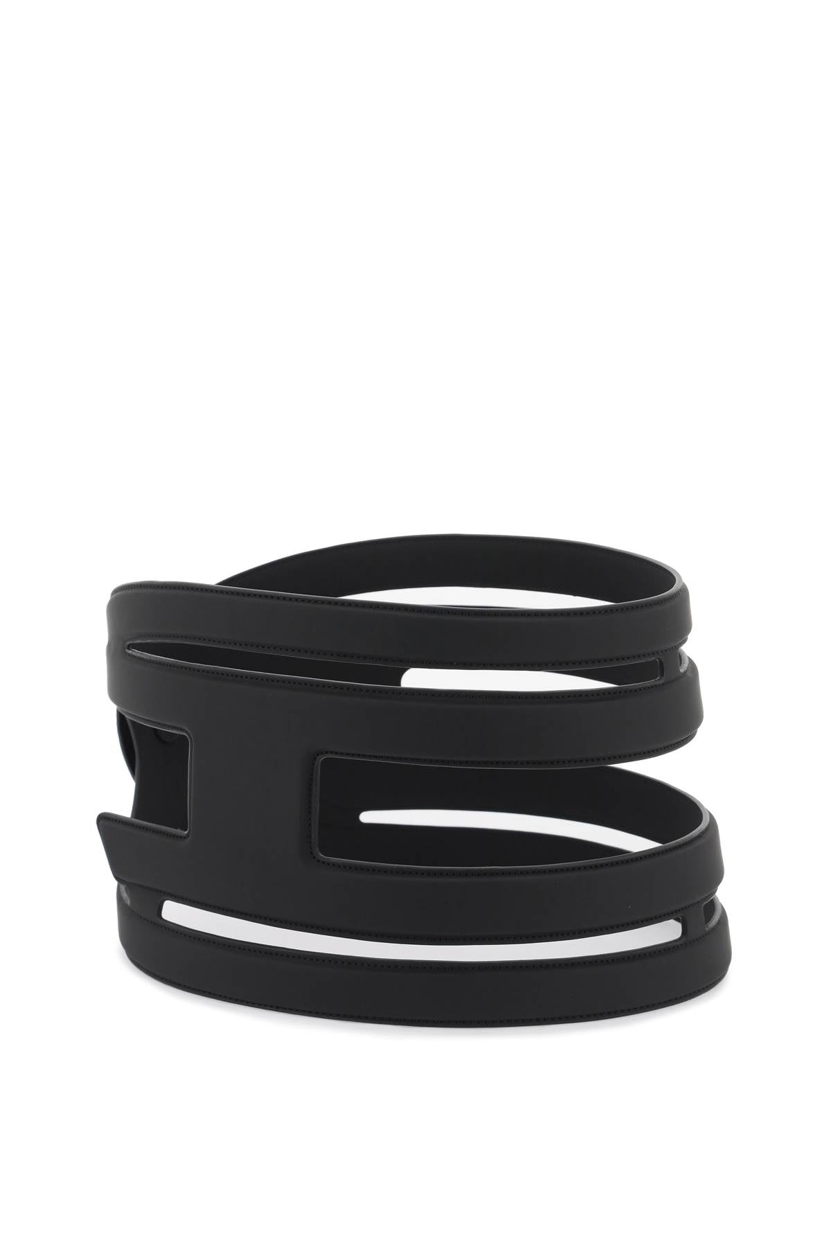 This Diesel maxi belt, made of faux leather, features the "Oval D" logo with cut-out details. Its generous size allows for a dual use as a micro-skirt. It closes with a snap button.