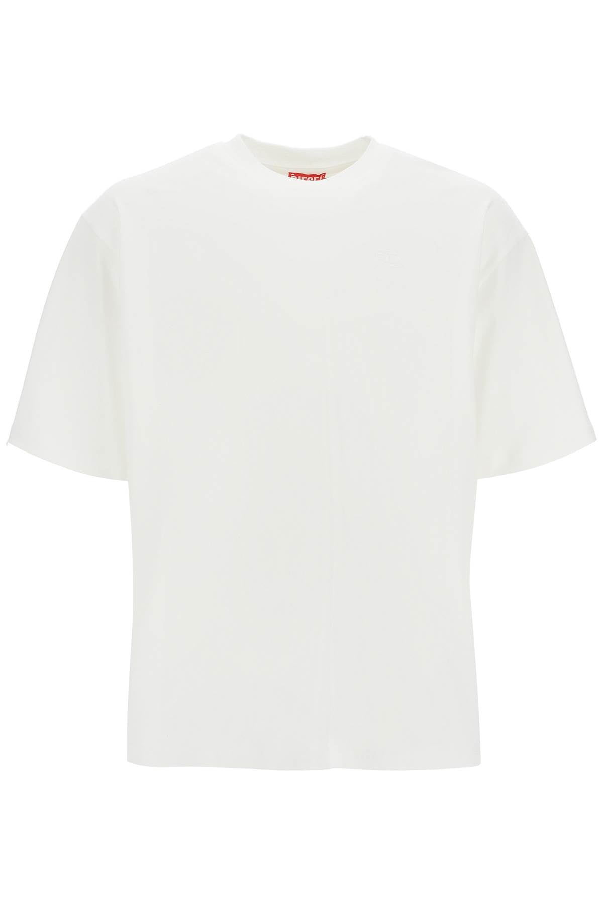 Diesel T-shirt crafted in pure cotton jersey with contrasting maxi Oval D logo embroidery on the back. It features ribbed crew neck. Oversized fit enhanced by dropped shoulders. The model is 187 cm tall and wears size L.