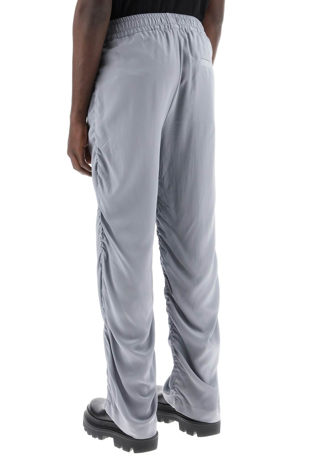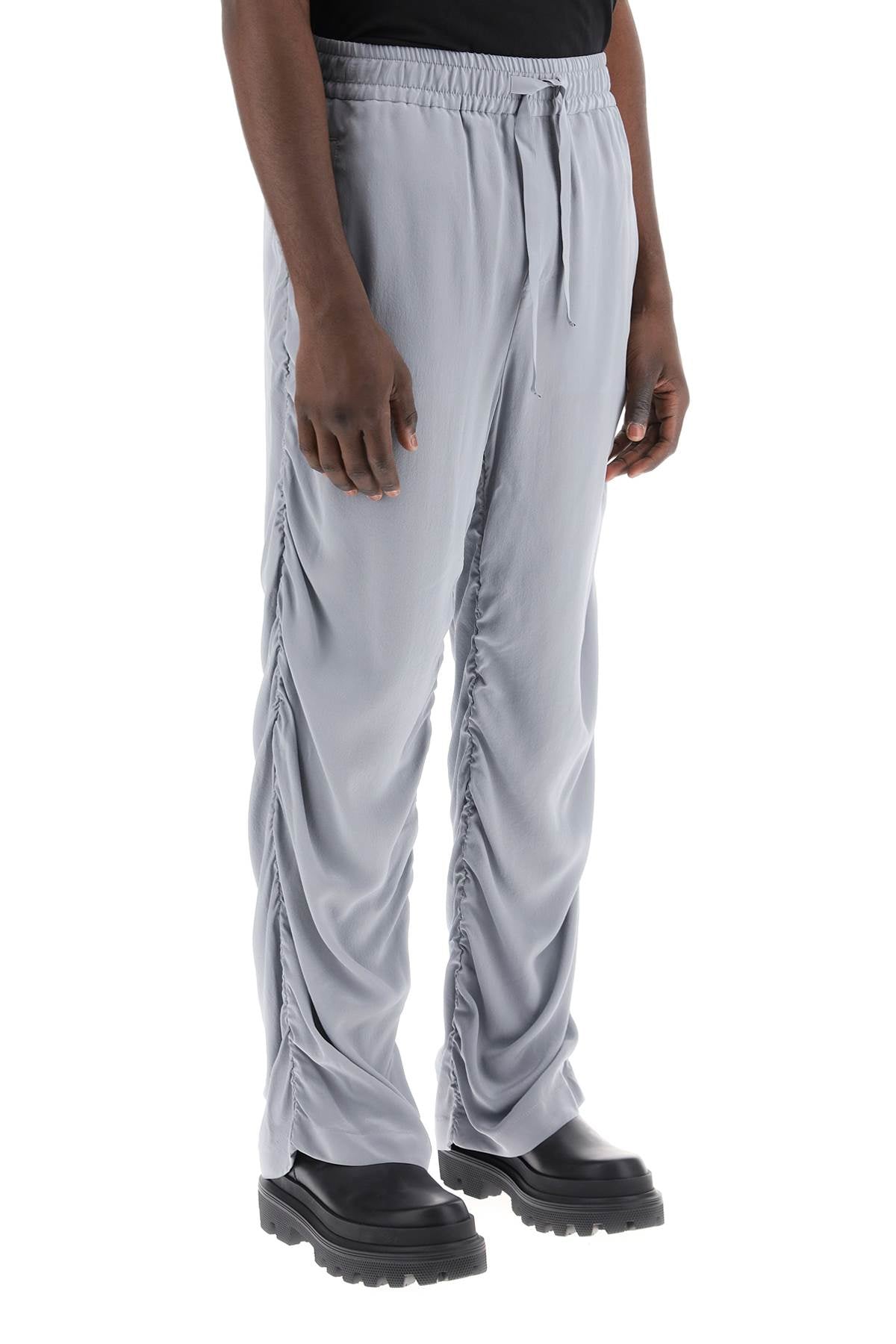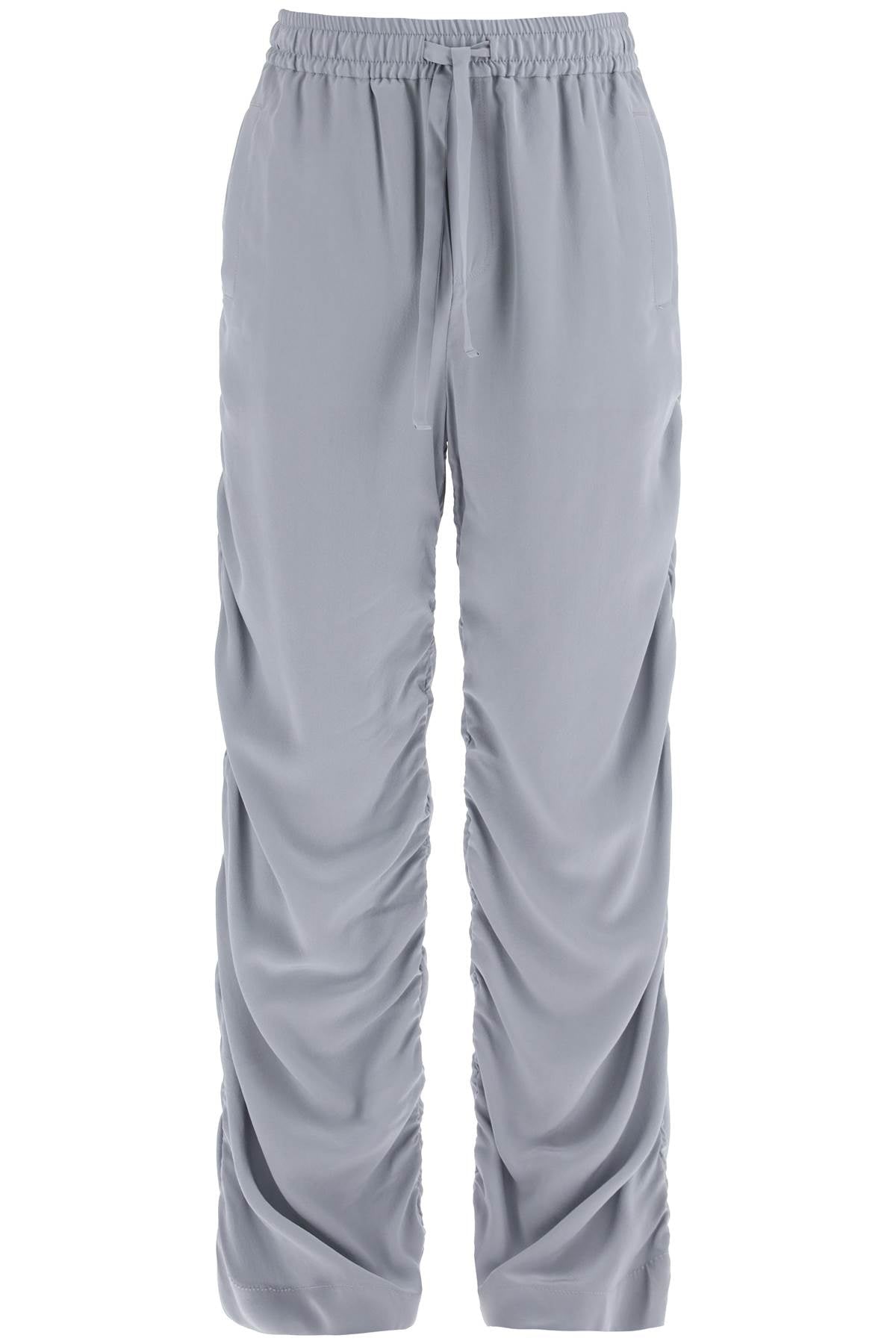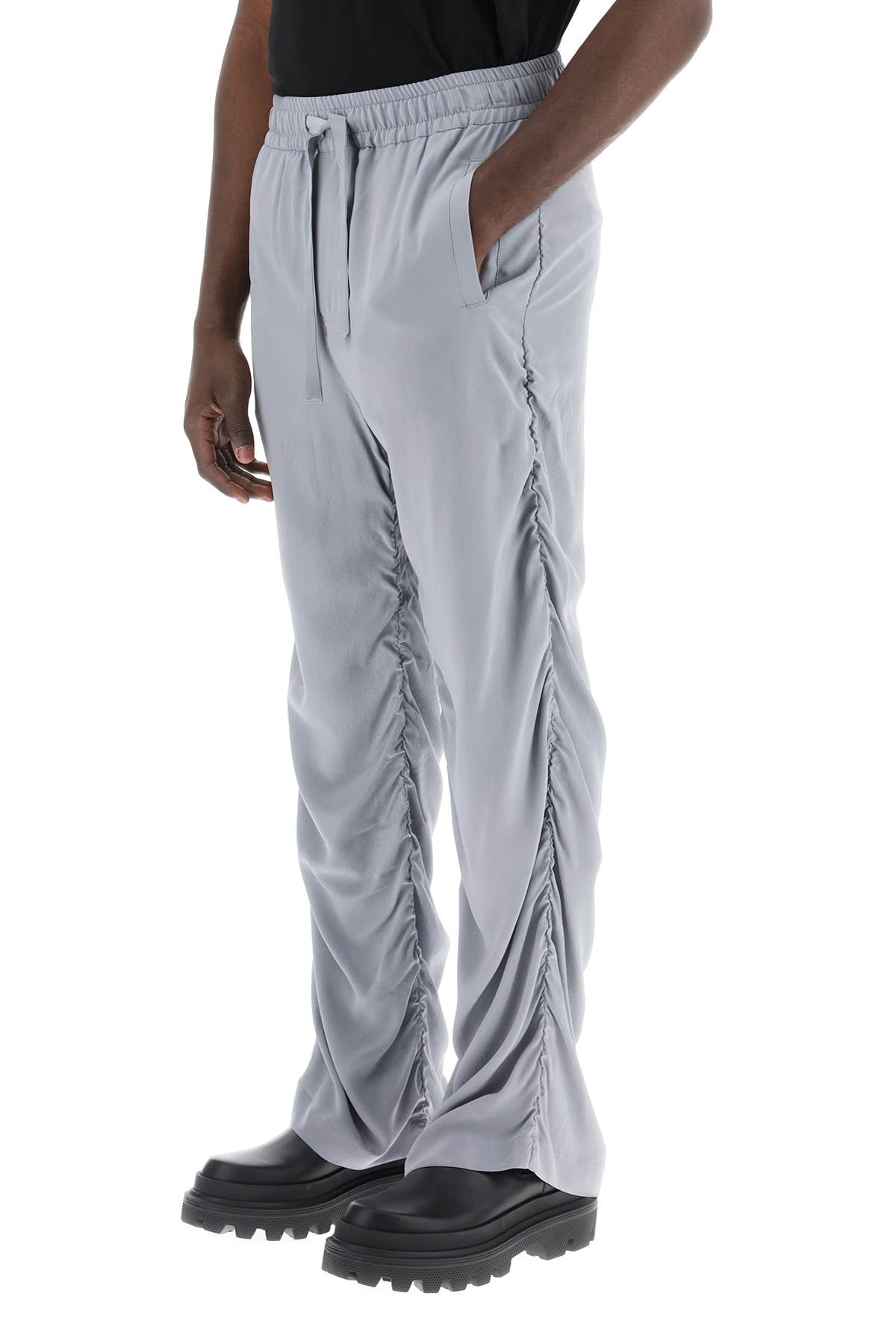 Dolce & Gabbana pants made of pure silk satin crêpe and featuring a draped design. They have an adjustable drawstring waist, front pockets, and one back pocket with button closure. The fit is relaxed. The model is 187 cm tall and wears size IT 48.