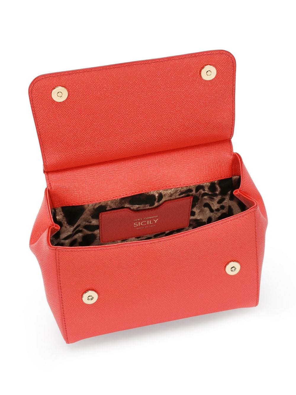 coral red leather gold-tone logo plaque single rolled top handle detachable shoulder strap foldover top with magnetic fastening main compartment internal card slot internal logo stamp leopard print lining Size and Fit - Width 7,87 in / 20 cm