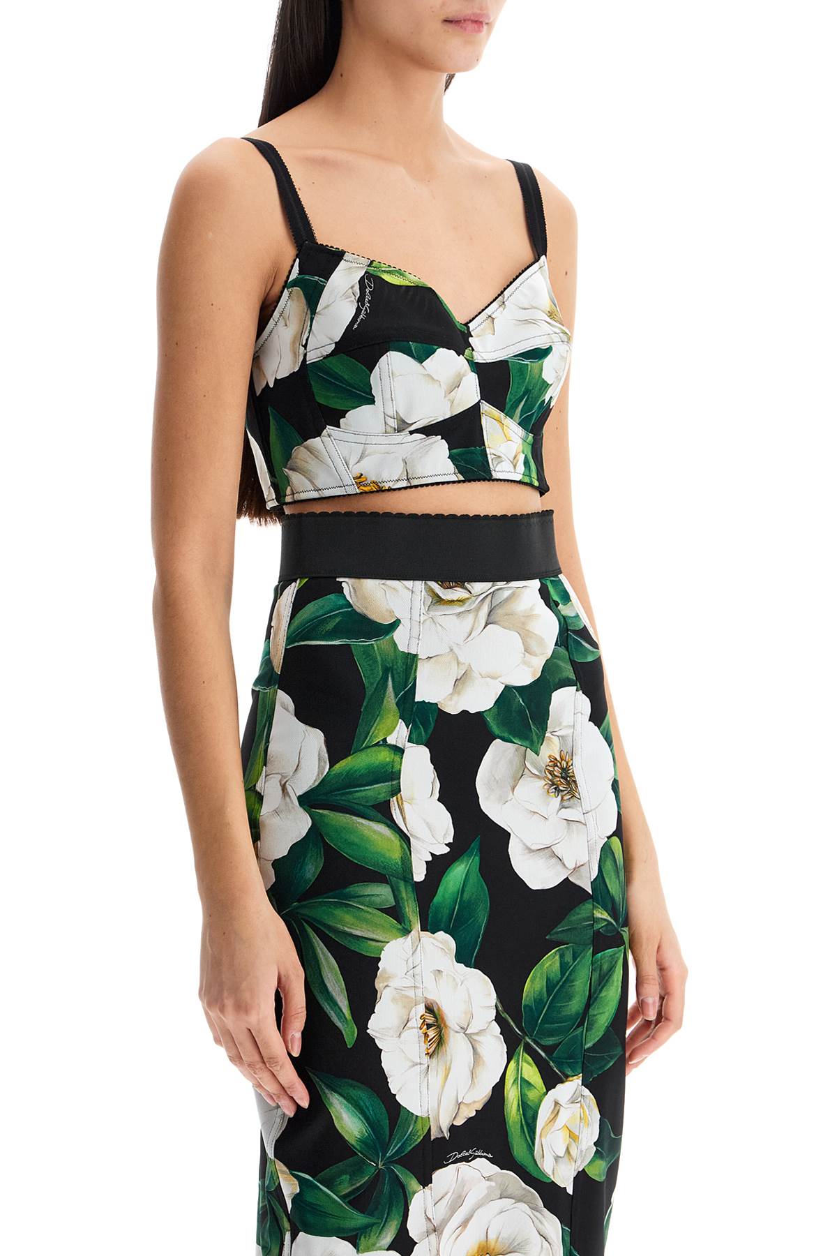 The Dolce & Gabbana bra embodies Italian elegance. Floral pattern on a black background with deep neckline. Comfort and sensuality in luxury lingerie. Made in Italy for the modern woman.