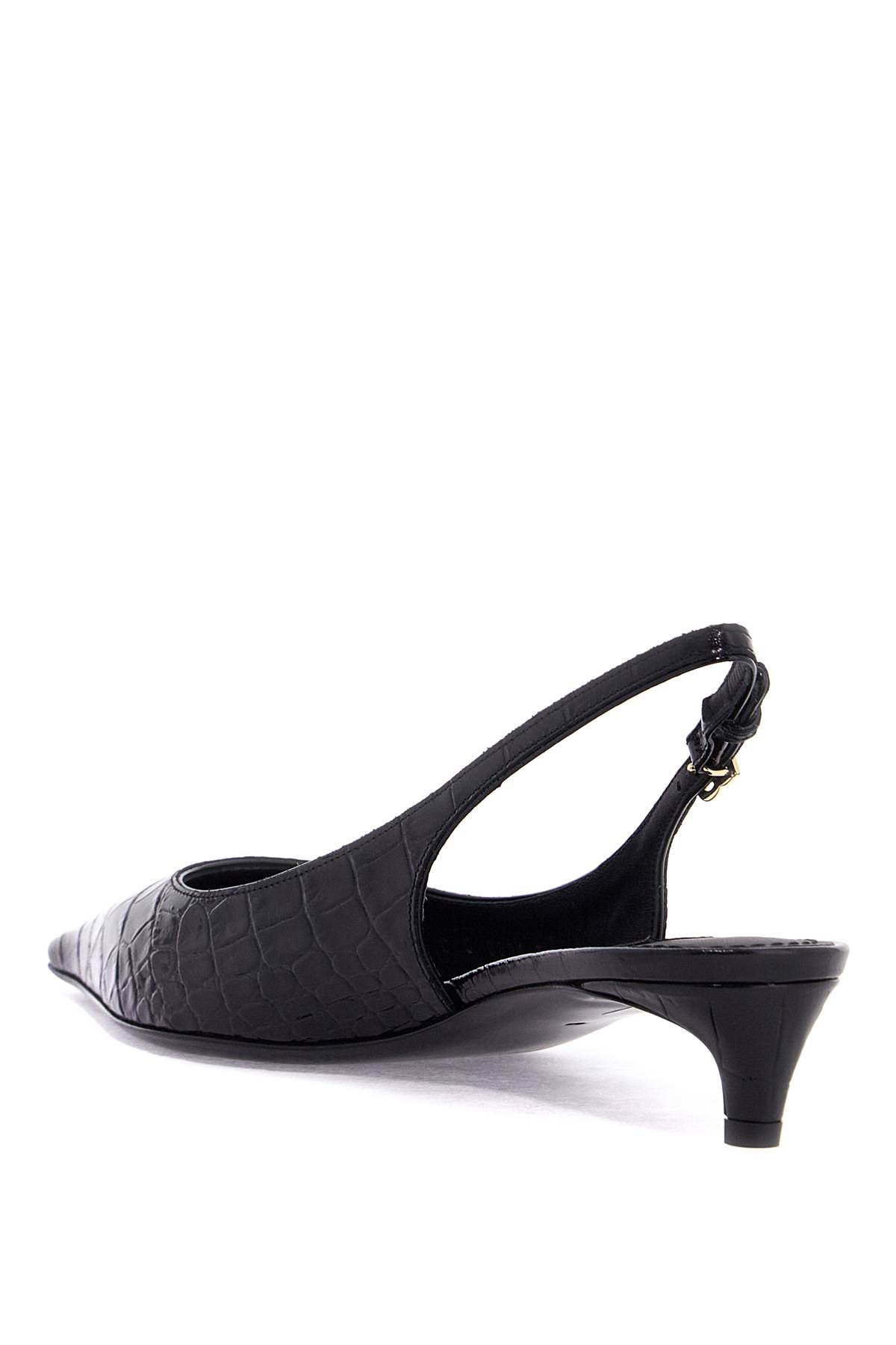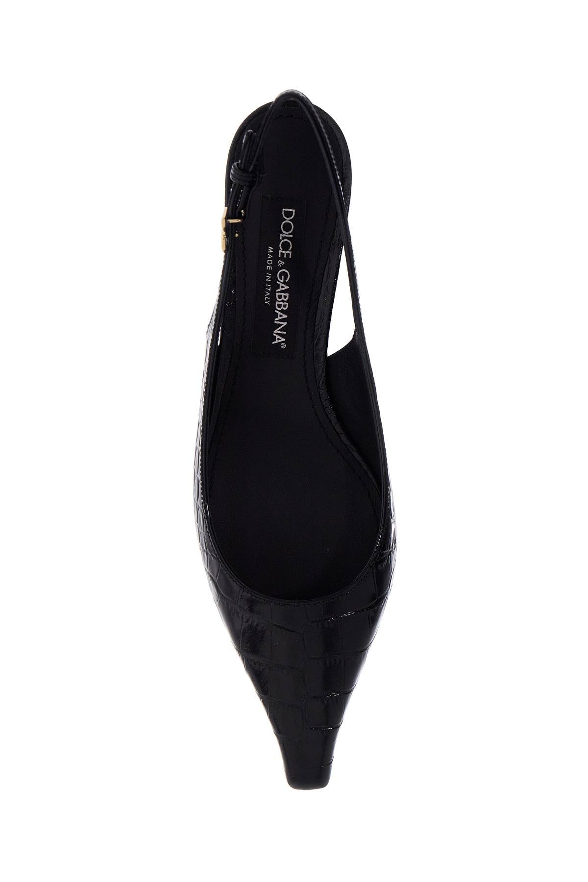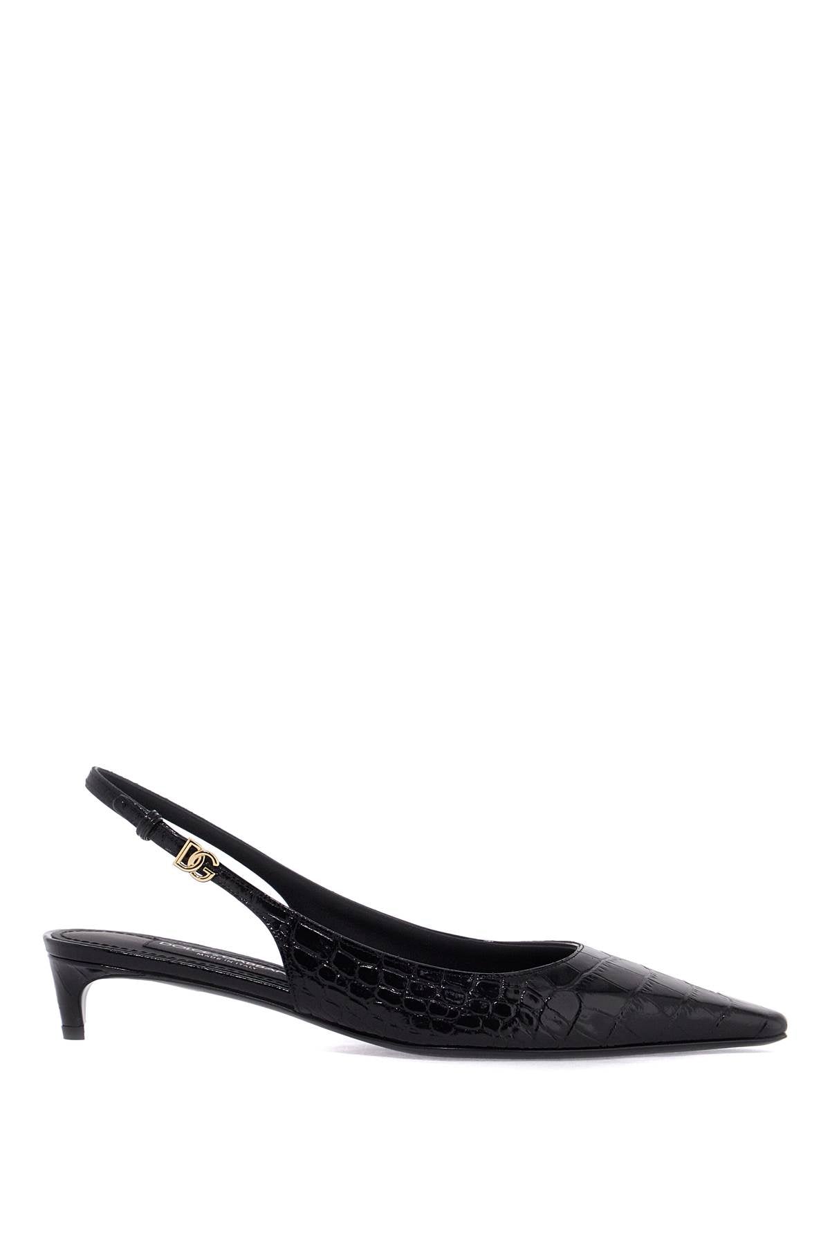 These Dolce & Gabbana slingback pumps are made of glossy crocodile-printed leather and feature a DG logo in gold metal on the adjustable back strap. The design is characterized by a pointed and squared toe and a covered kitten heel. The lining and insole are made of leather, while the sole is made of leather as well. Size and Fit - Heel Height = 3,5 cm,