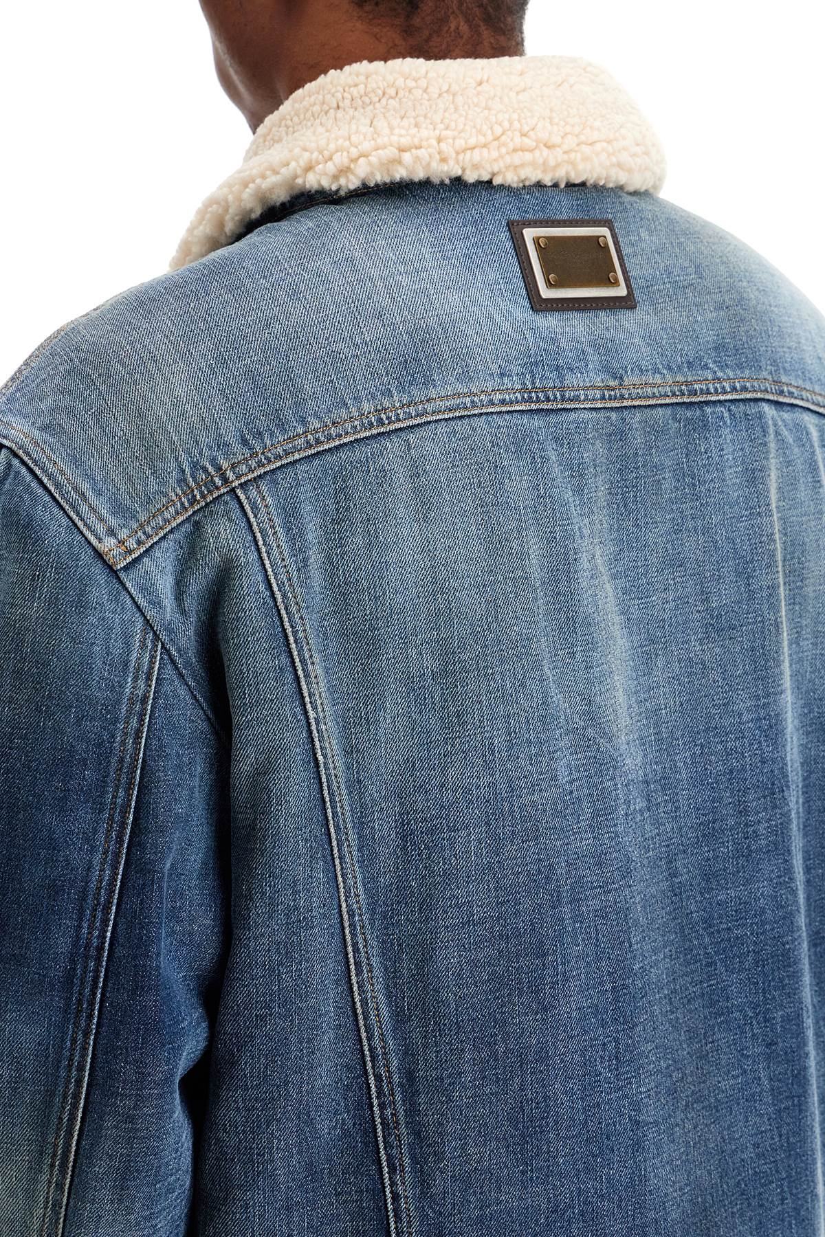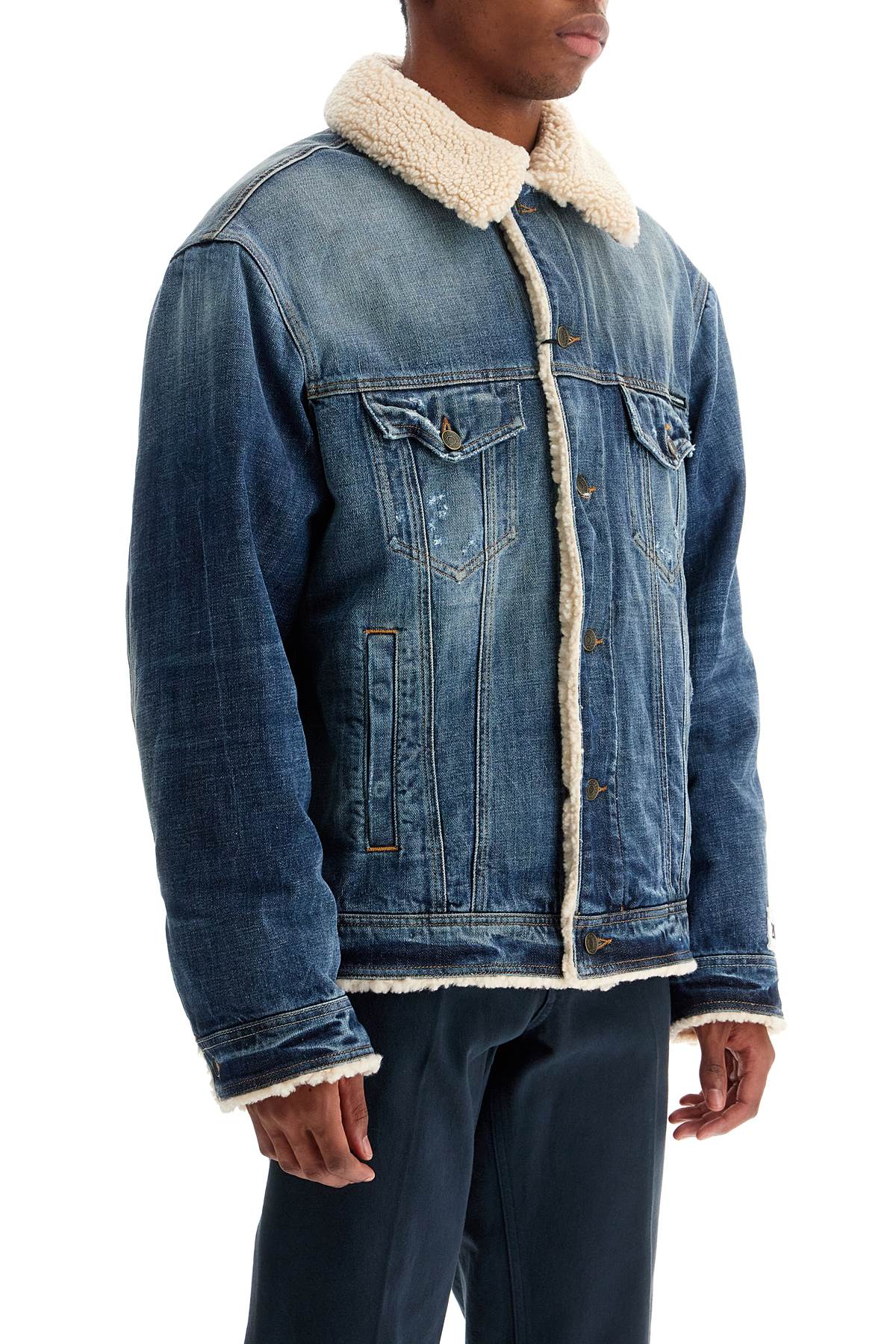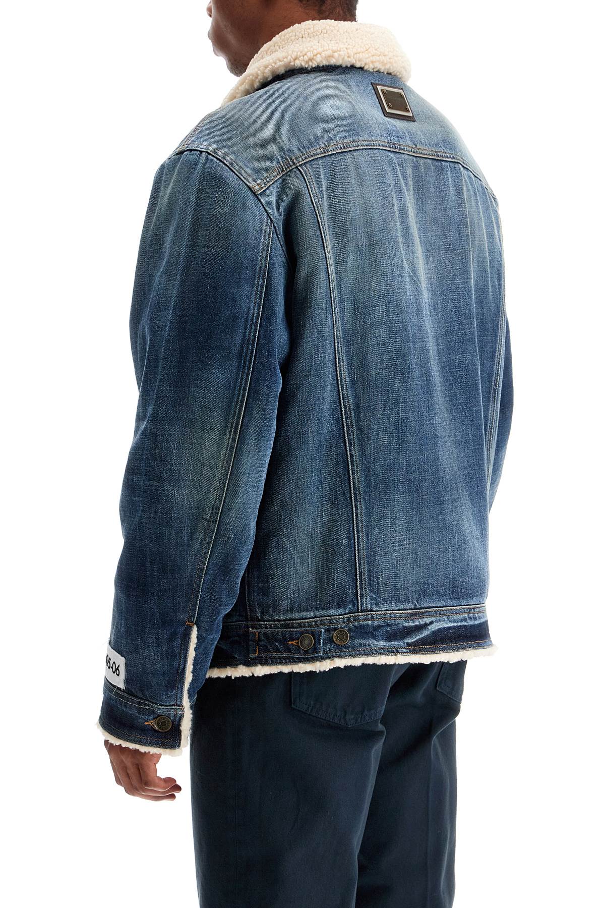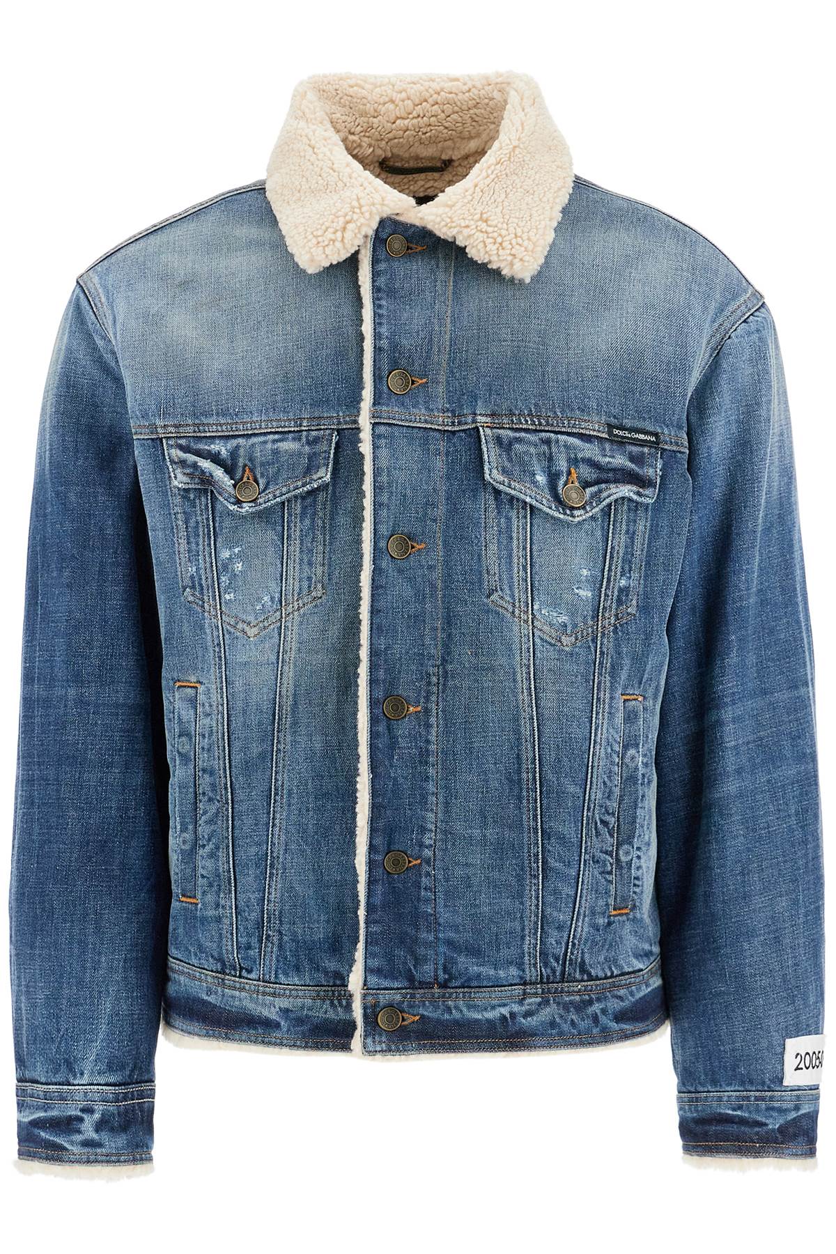 Dolce & Gabbana denim jacket featuring a shearling effect teddy lining. The design includes a classic button closure, side slit pockets, two flap chest pockets, one button at the cuffs, and adjustable tabs at the hem. Equipped with two convenient inner pockets, the jacket is personalized with a metal logo plaque on the back and a removable Re-Edition label at the bottom of the sleeve. Distressed finishes on the outer surface give the garment a lived-in look. Regular fit
