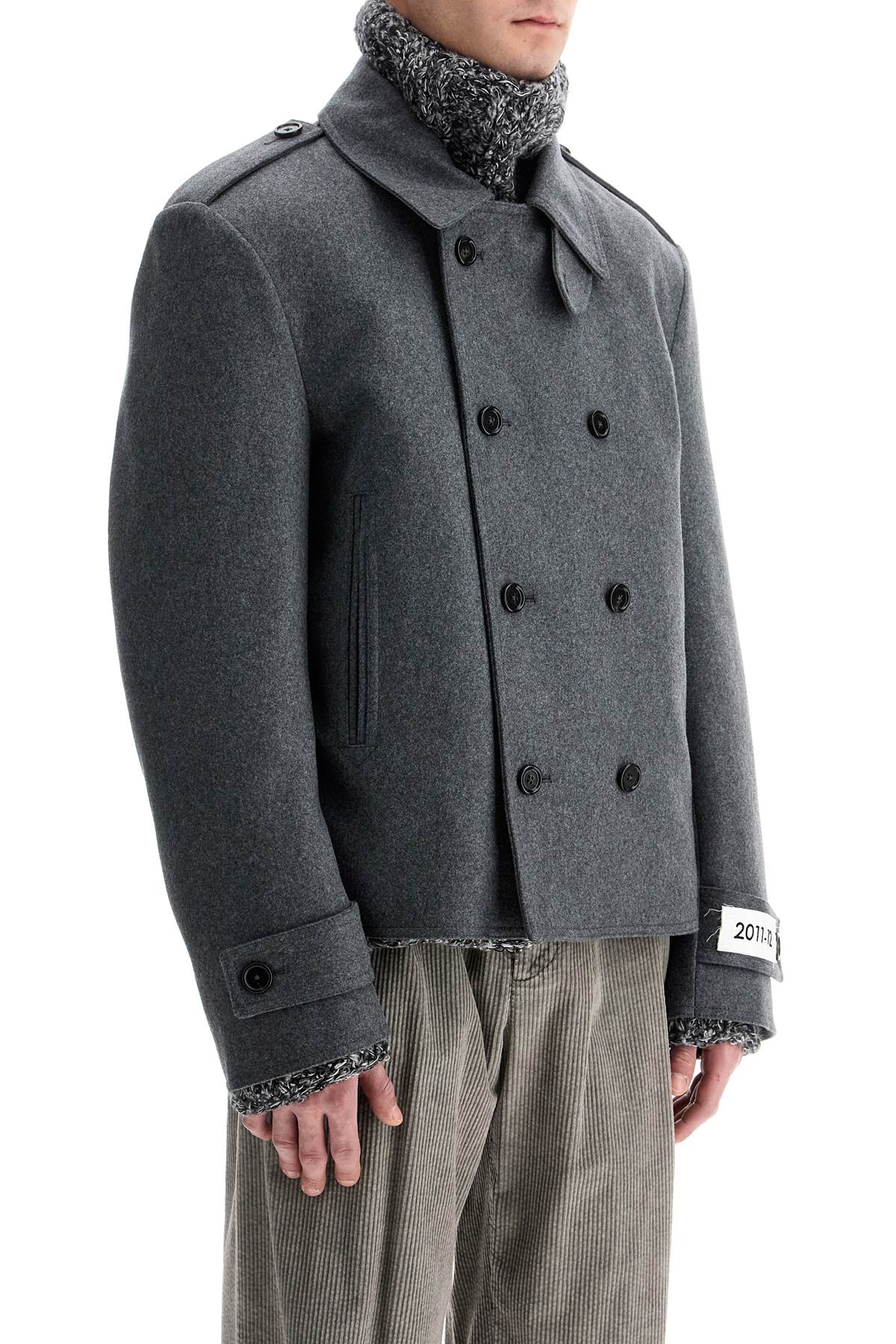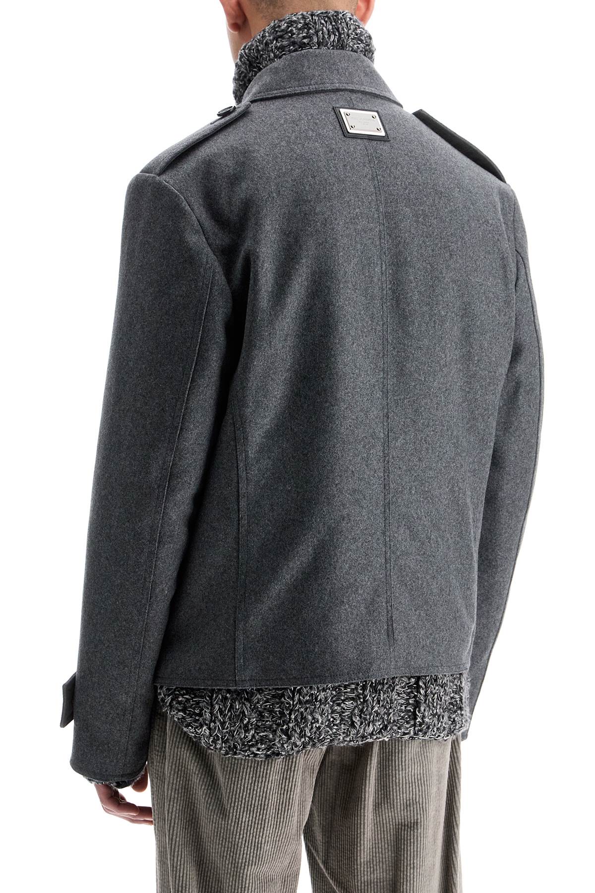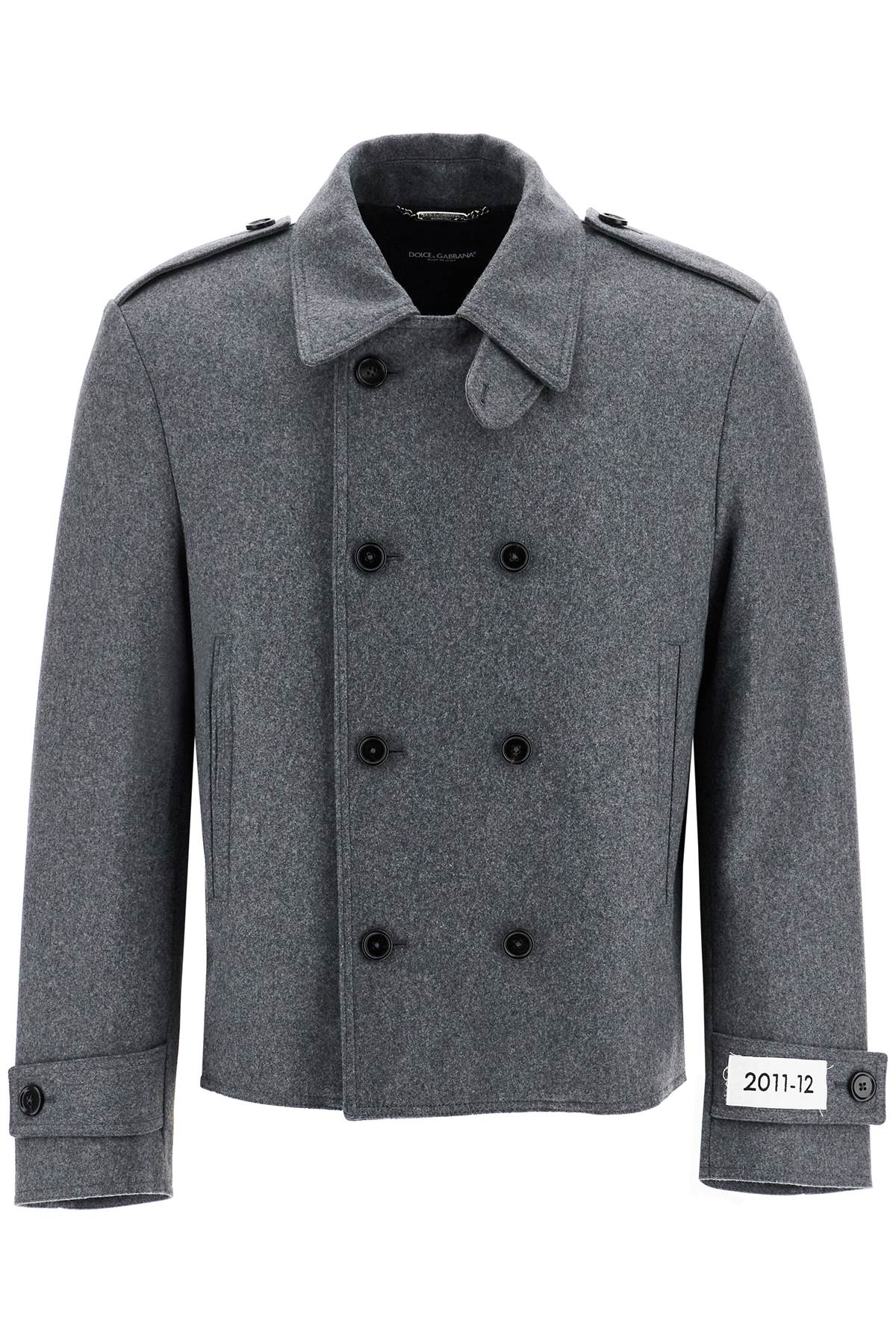 This Dolce & Gabbana double-breasted caban has a straight and short cut with a collar and epaulettes, made from a fine wool blend felt. Enriched with wrist tabs and a chin strap, the garment features profiled vertical pockets, button closure, Re-Edition label on the left sleeve hem and iconic metal logo plaque on the back. Quilted interior with two pockets. Regular fit. The model is 182 cm tall and wears size IT 48