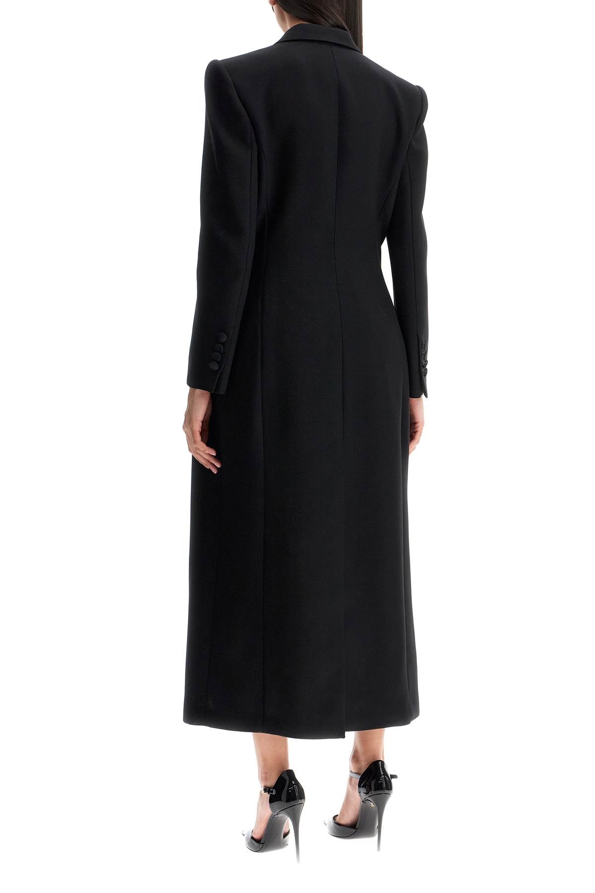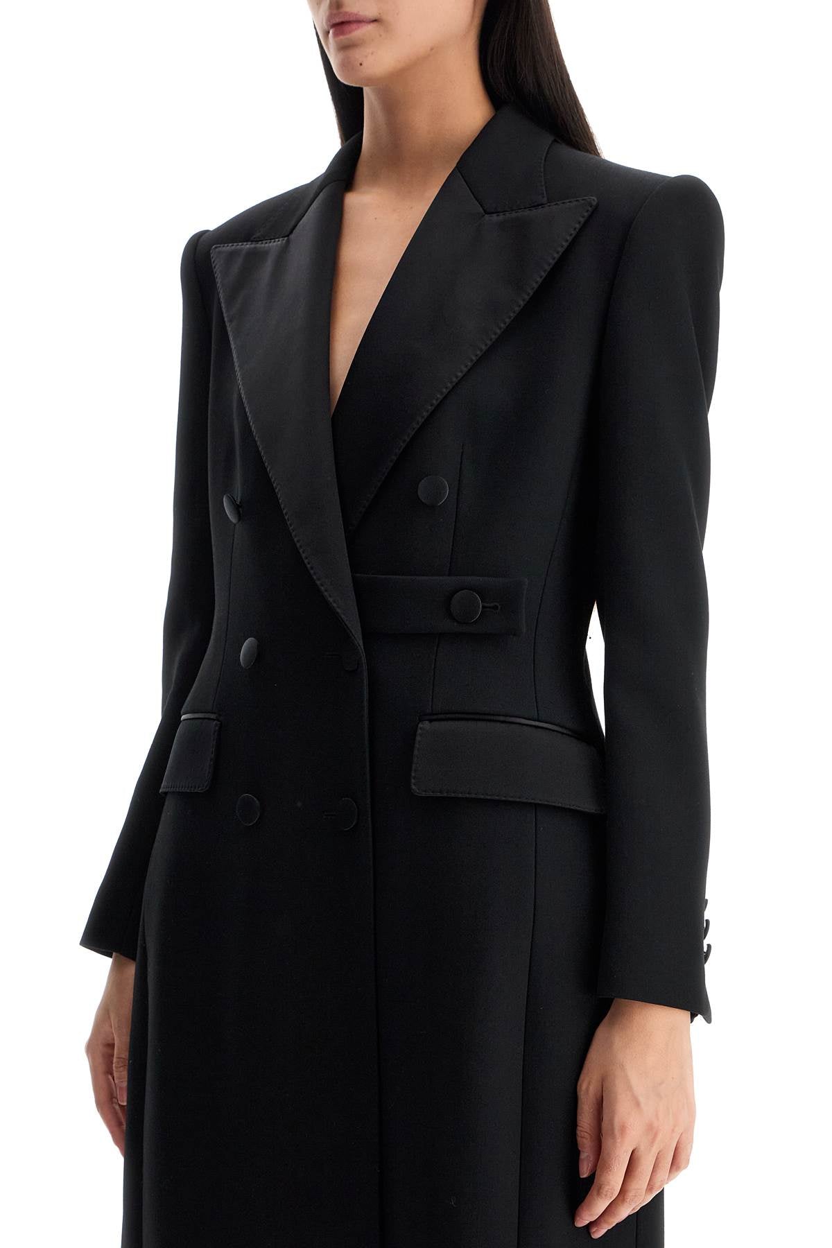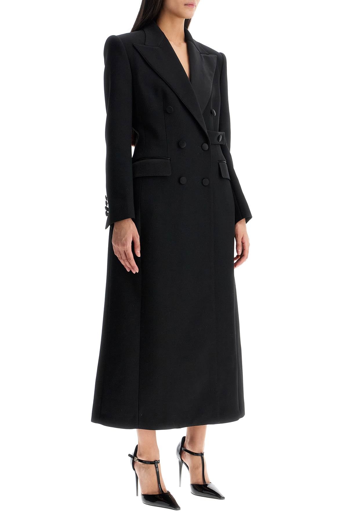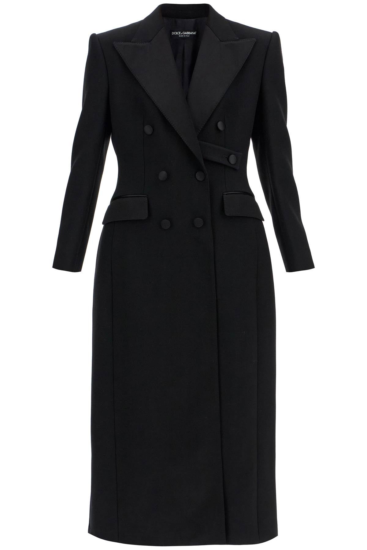 This long coat by Dolce & Gabbana is made of virgin wool gabardine with matching silk satin finishes for a tuxedo-style design. It features a fitted feminine silhouette at the waist, enhanced by padding on the hips and structured, padded shoulders. The outerwear has a double-breasted construction with six buttons, an internal belt, wide peak lapels, a central slit at the back, and two flap pockets on the hips. Fully lined in silk satin.