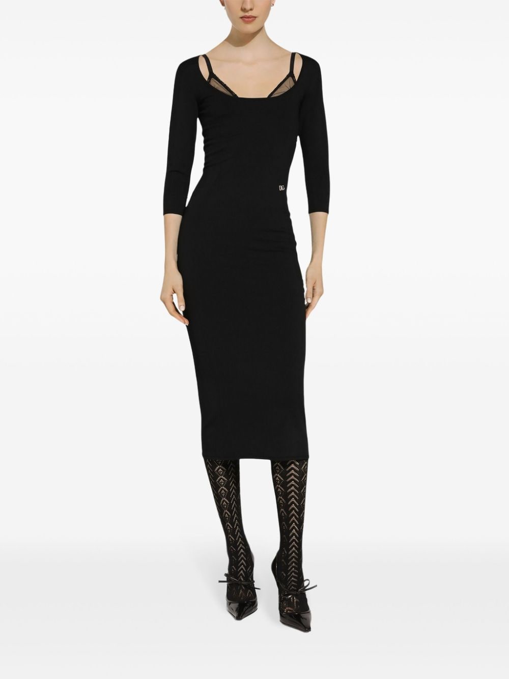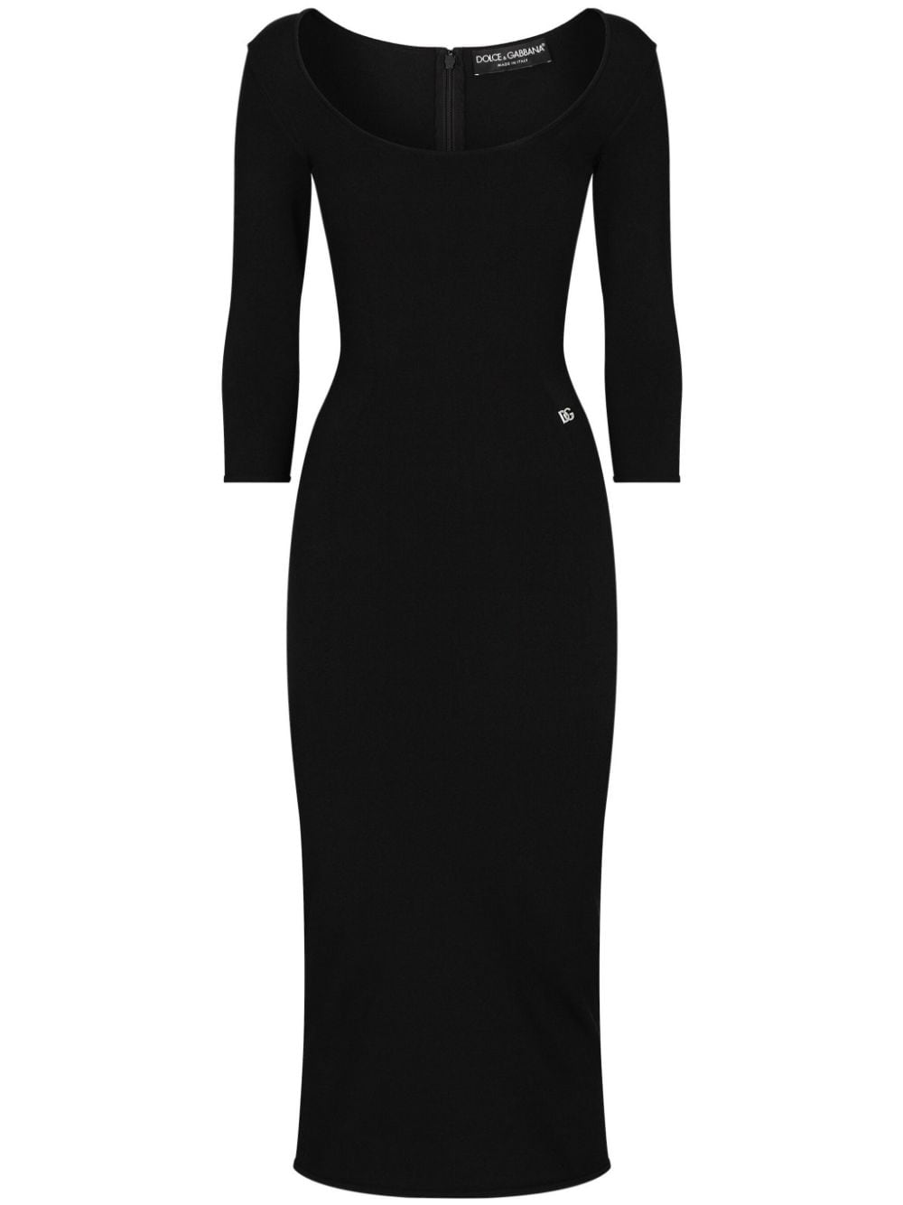 black stretch-design logo plaque at the hip scoop neck three-quarter length sleeves rear zip fastening fitted waistline pencil skirt mid-length straight hem Size and Fit - This piece fits true to size. We recommend you get your regular size. Model is 1,75m / 5ft 8in wearing size 40 (IT)
