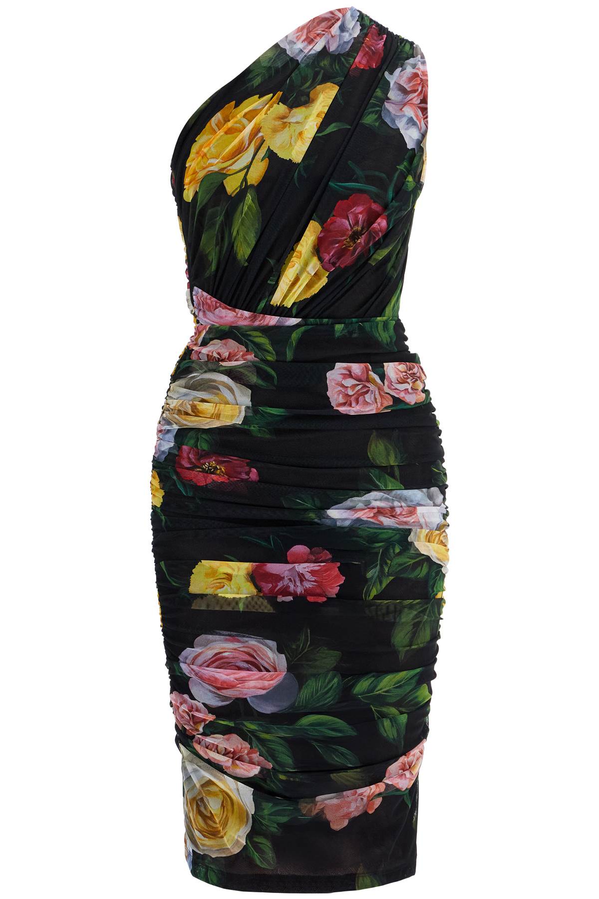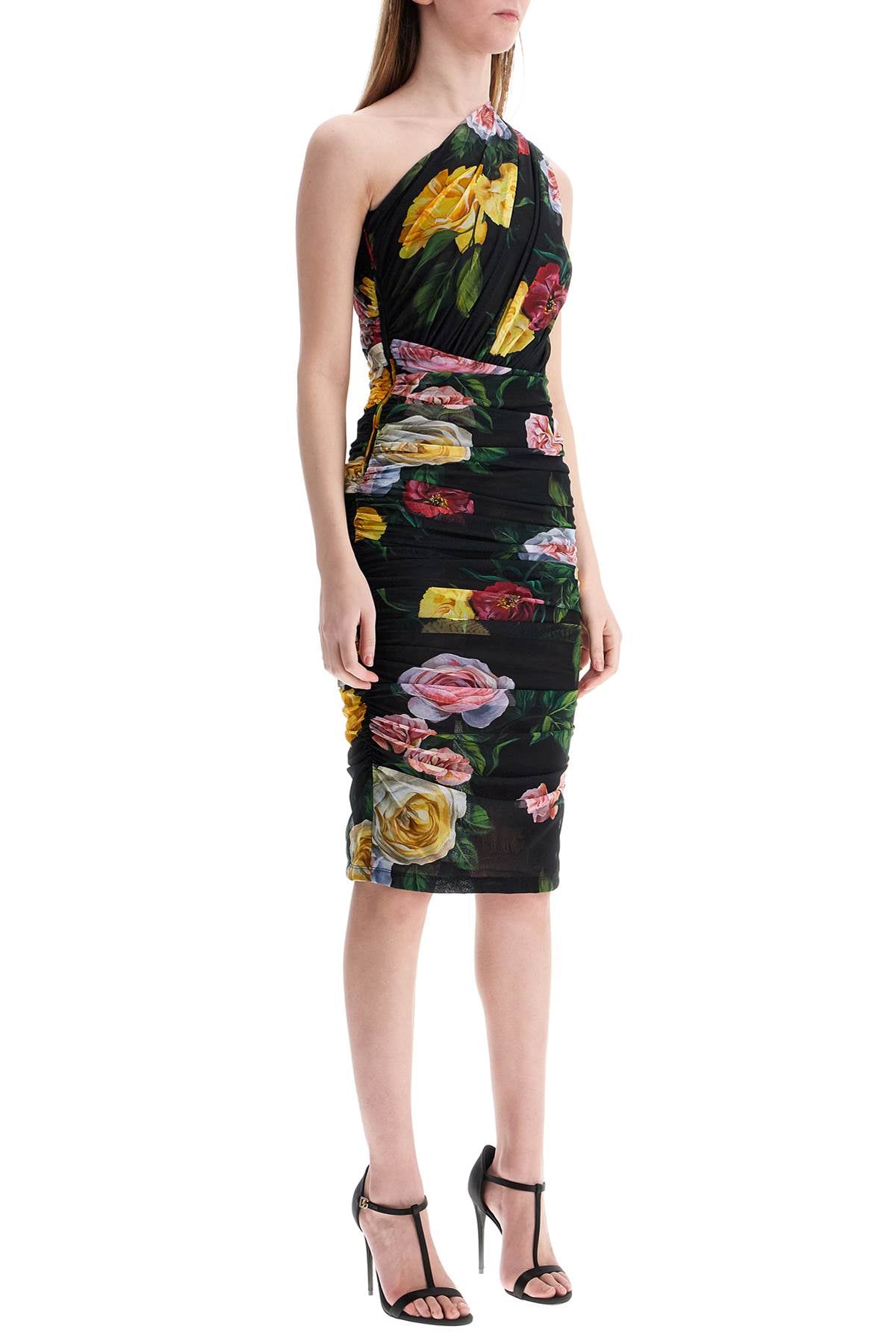 Elegant dress by Dolce & Gabbana embodies sophistication and sensuality. Fitted silhouette with off-shoulder design and floral pattern on a black background. Stretch fabric for comfort and impeccable style