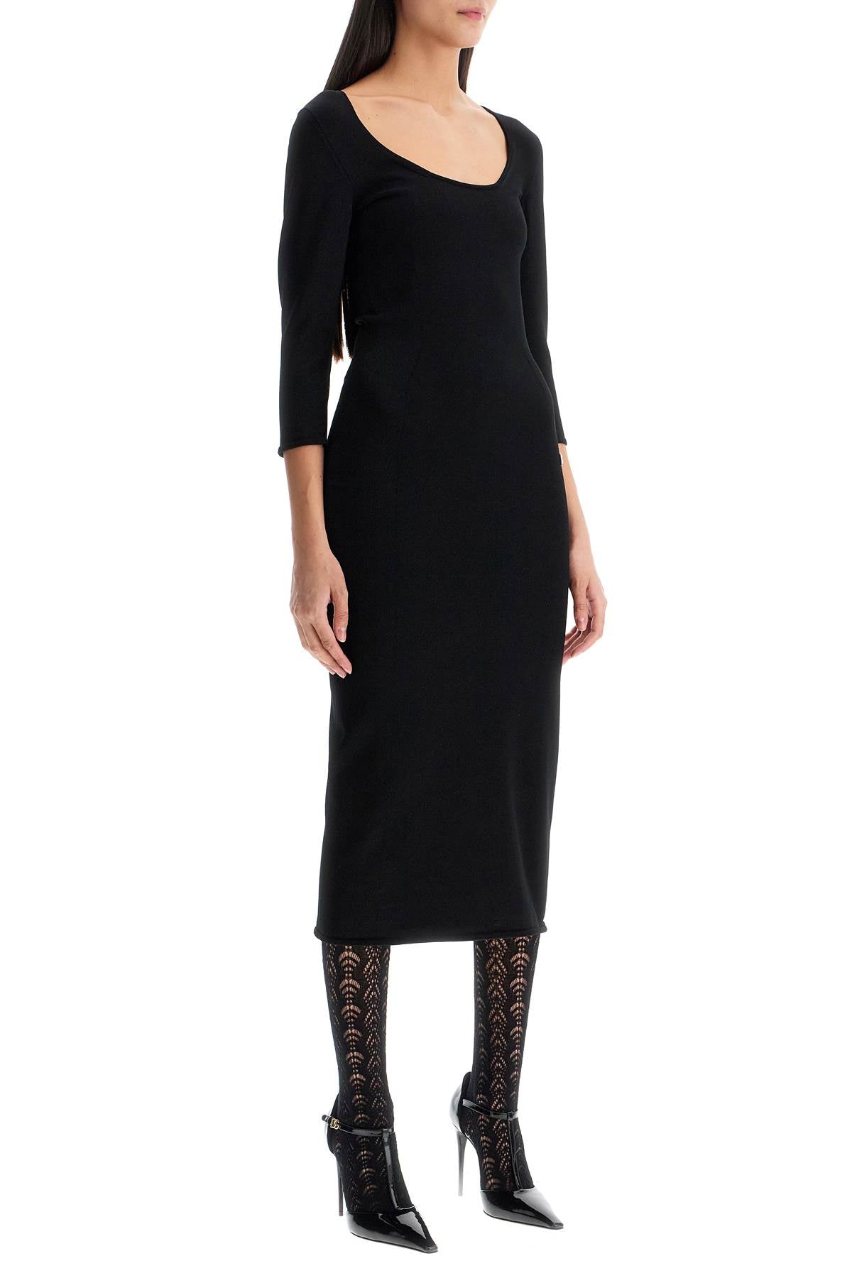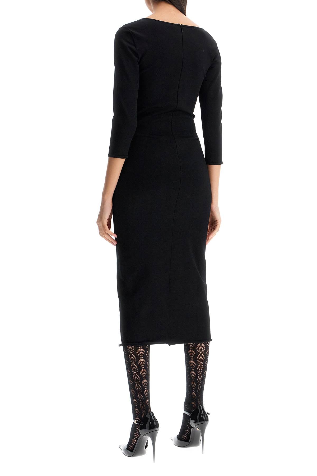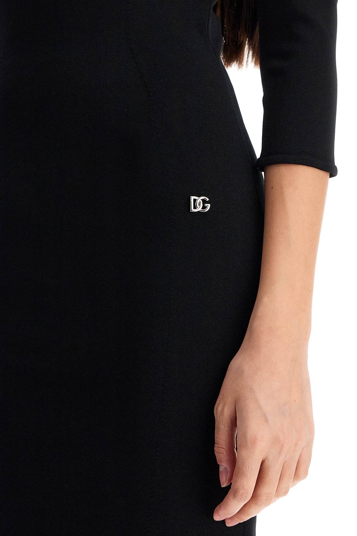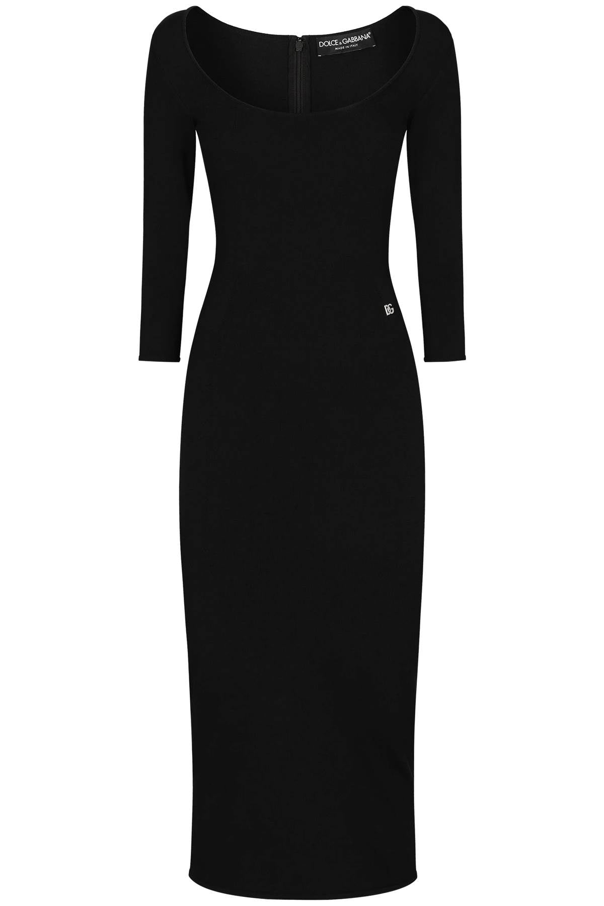 This Dolce & Gabbana midi dress features a fitted silhouette with a wide round neckline and three-quarter sleeves. Made from stretch viscose knit, it showcases a metal DG logo detail on the front. The back closure is an invisible zip.