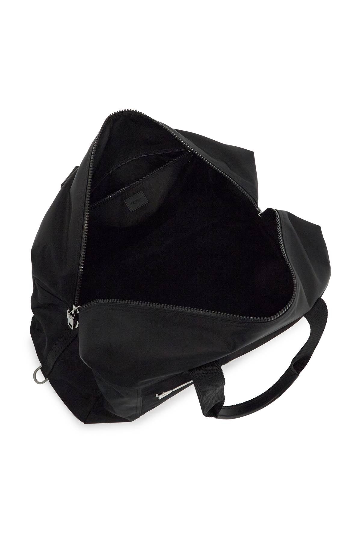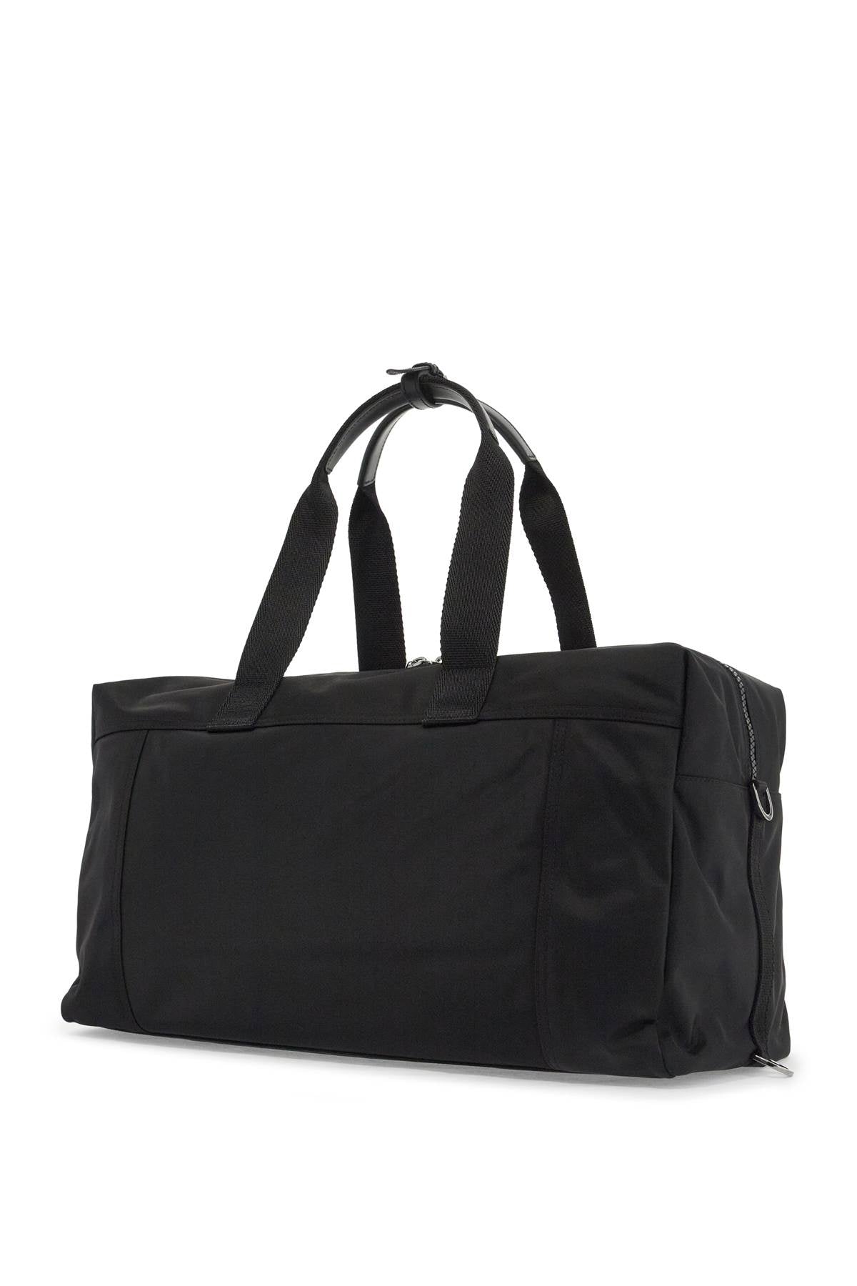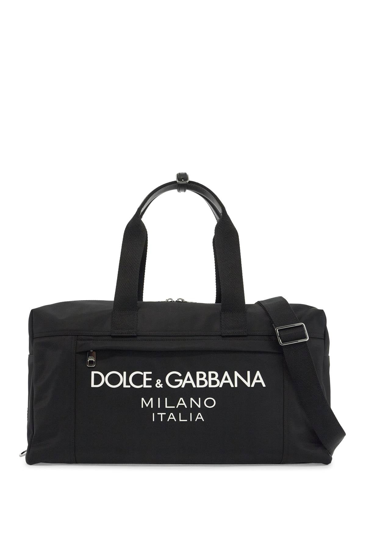 This Dolce & Gabbana travel duffle bag is made of nylon with a contrasting rubber logo applied on the front pocket. The main compartment has a double zip closure and the interior is lined with one zip pocket and two open pockets. The handles are made of ribbon with a leather insert and there are metallic accessories in ruthenium finish. It also comes with an adjustable and removable shoulder strap. Size and Fit - Bag Length = 50 cm, Bag Height = 24 cm, Bag Weight = 23 cm,