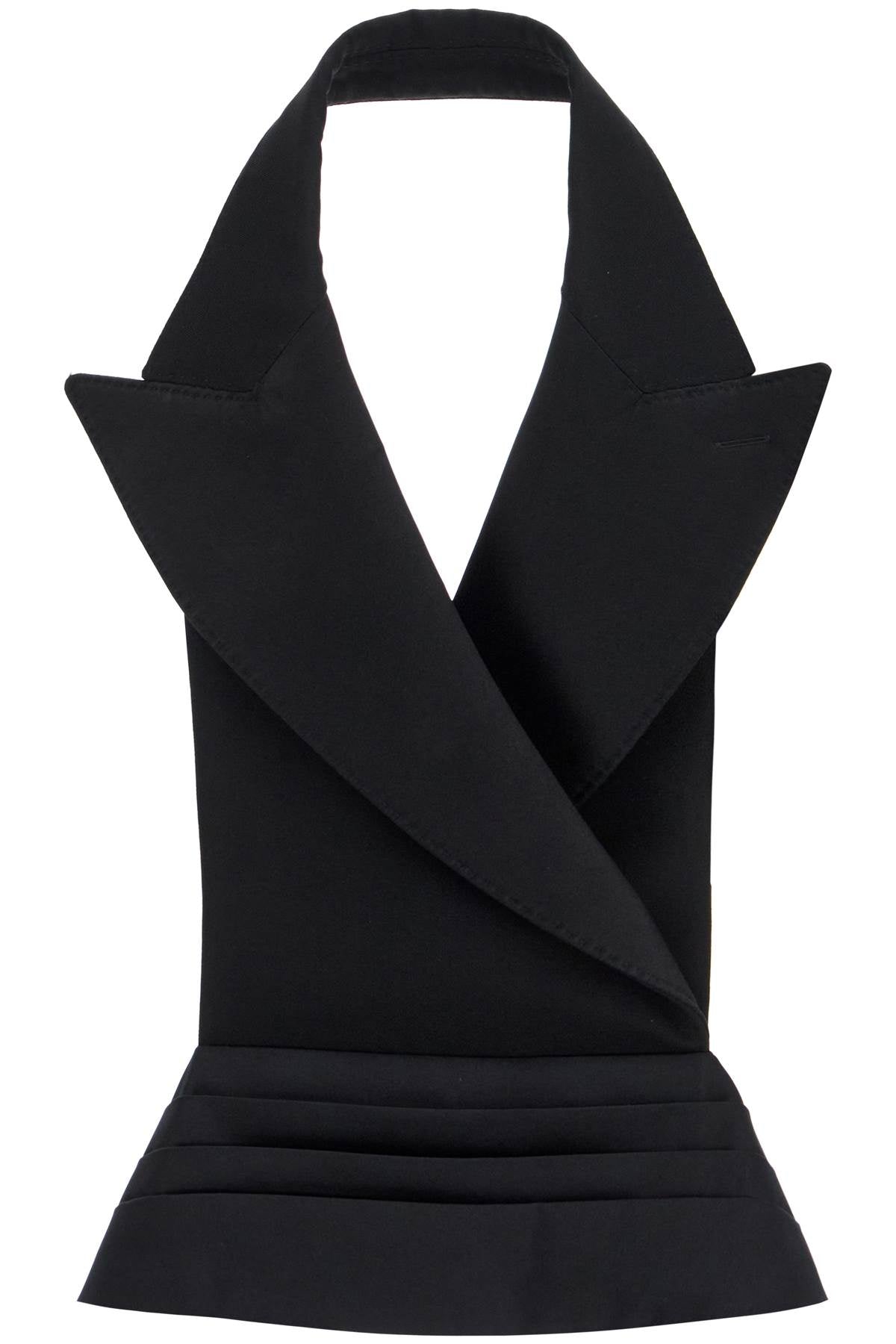 This Dolce & Gabbana double-breasted vest is characterized by an open back design. Made of virgin wool gabardine and silk satin, it features a halter neckline with wide peak lapels and a pleated waistband. The elastic adjustable strap on the back has a buckle closure. The model is 177 cm tall and wears size IT 40.
