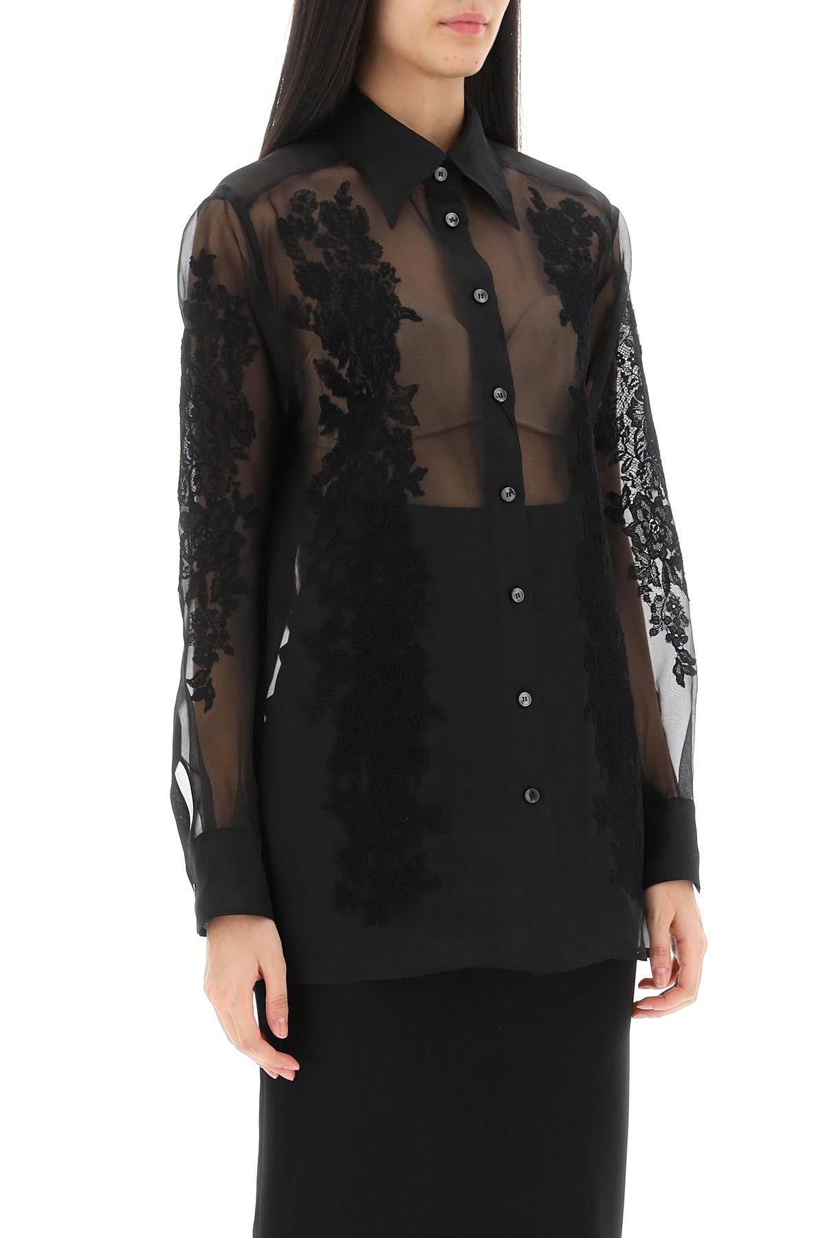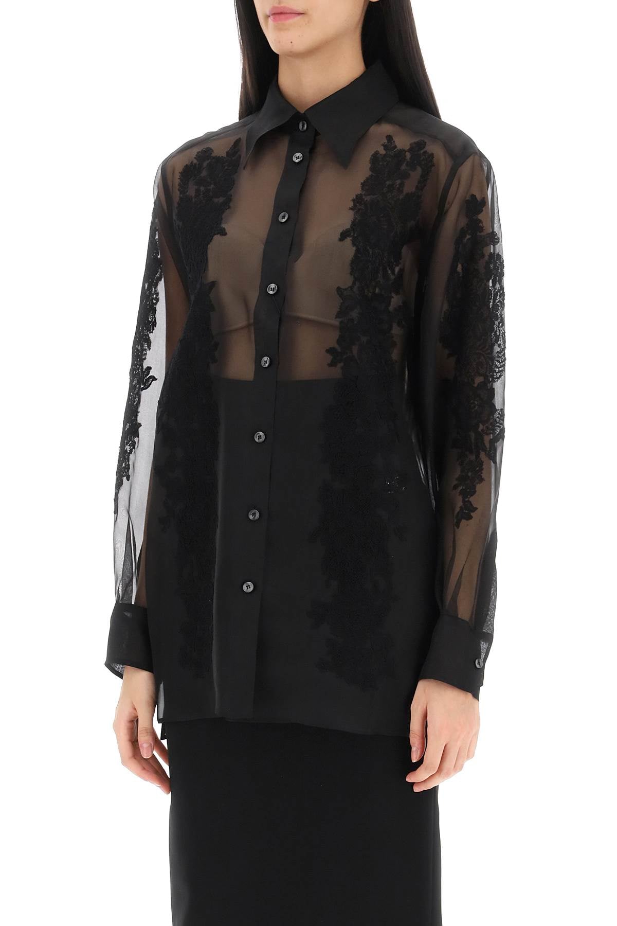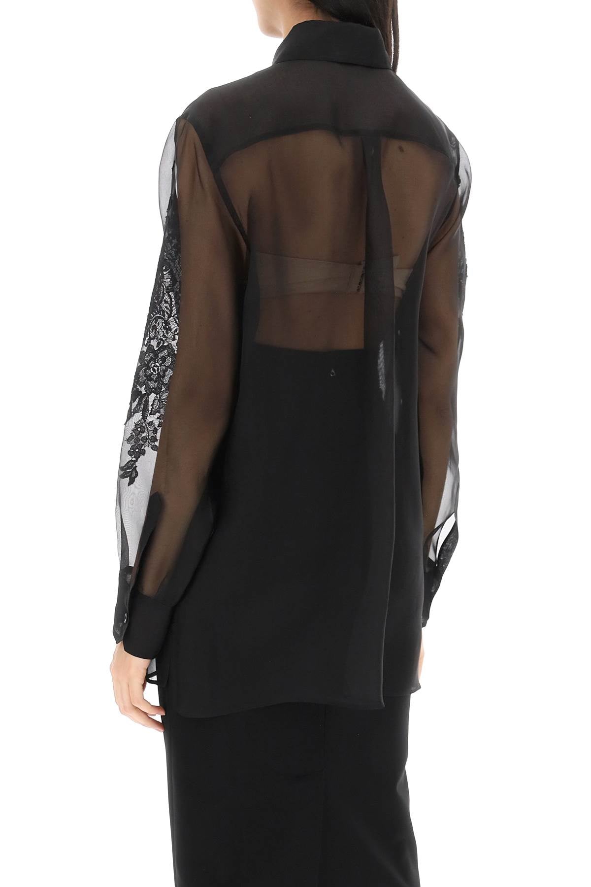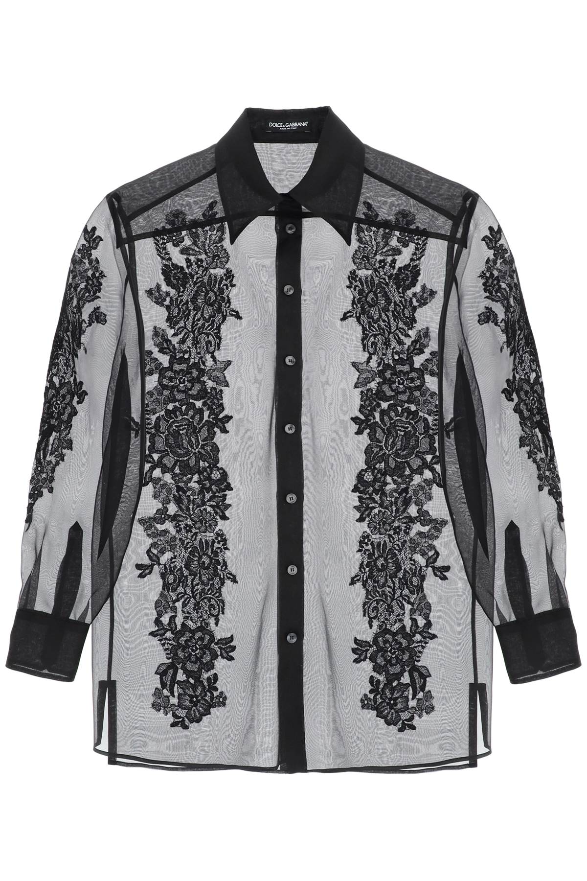 Dolce&Gabbana shirt crafted in silk and cotton-blend organza, enriched by tonal lace inserts. It features italian collar, front button placket, single-button angled cuffs, side slits and back yoke with box pleat. Loose fit. The model is 177 cm tall.