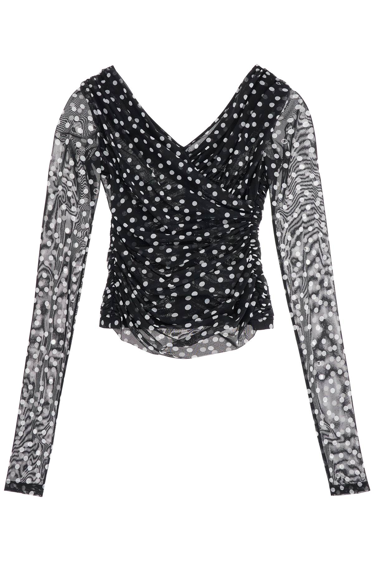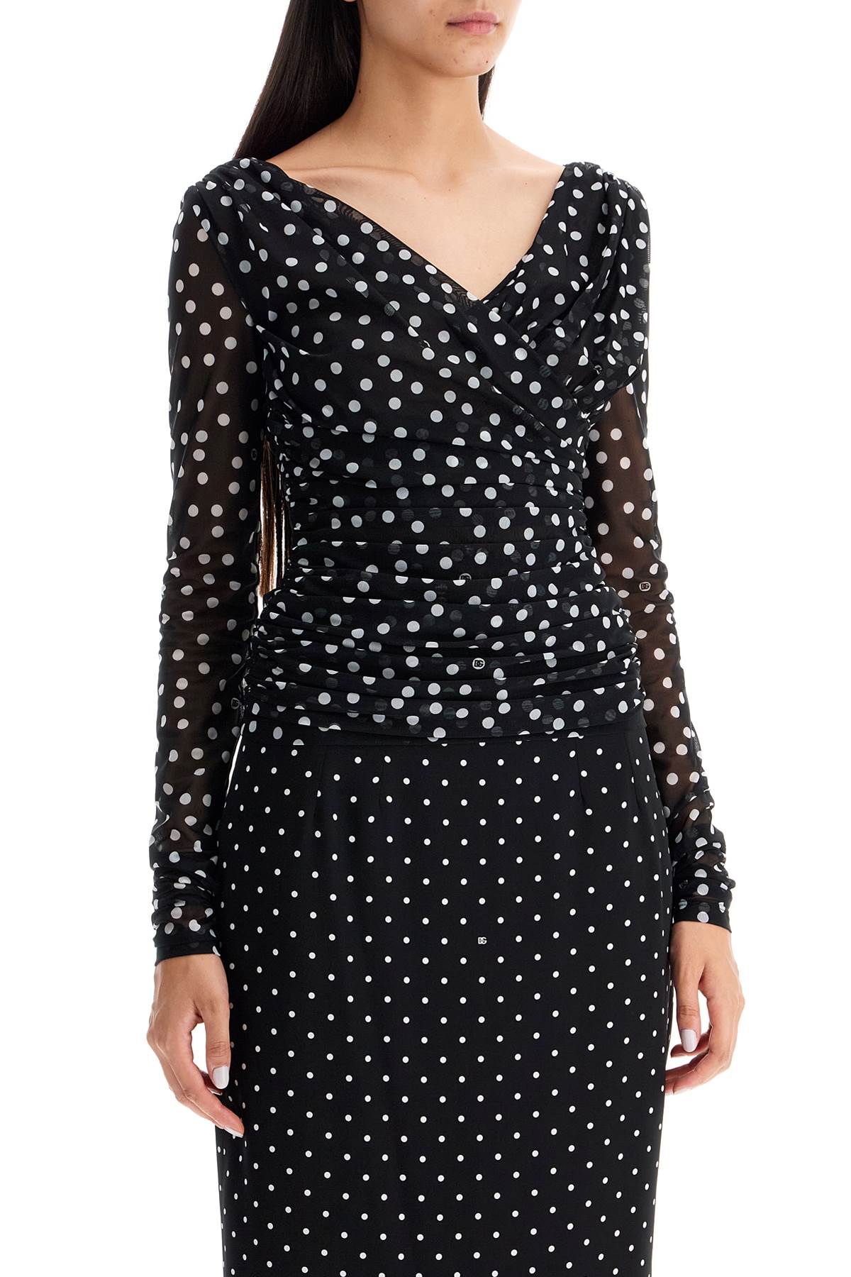 This long-sleeved top by Dolce & Gabbana is made of stretch tulle with a Polka Dot print. It stands out for its fitted and draped silhouette with a crossover neckline. Invisible zip on the back. The model is 177 cm tall and wears size IT 40.