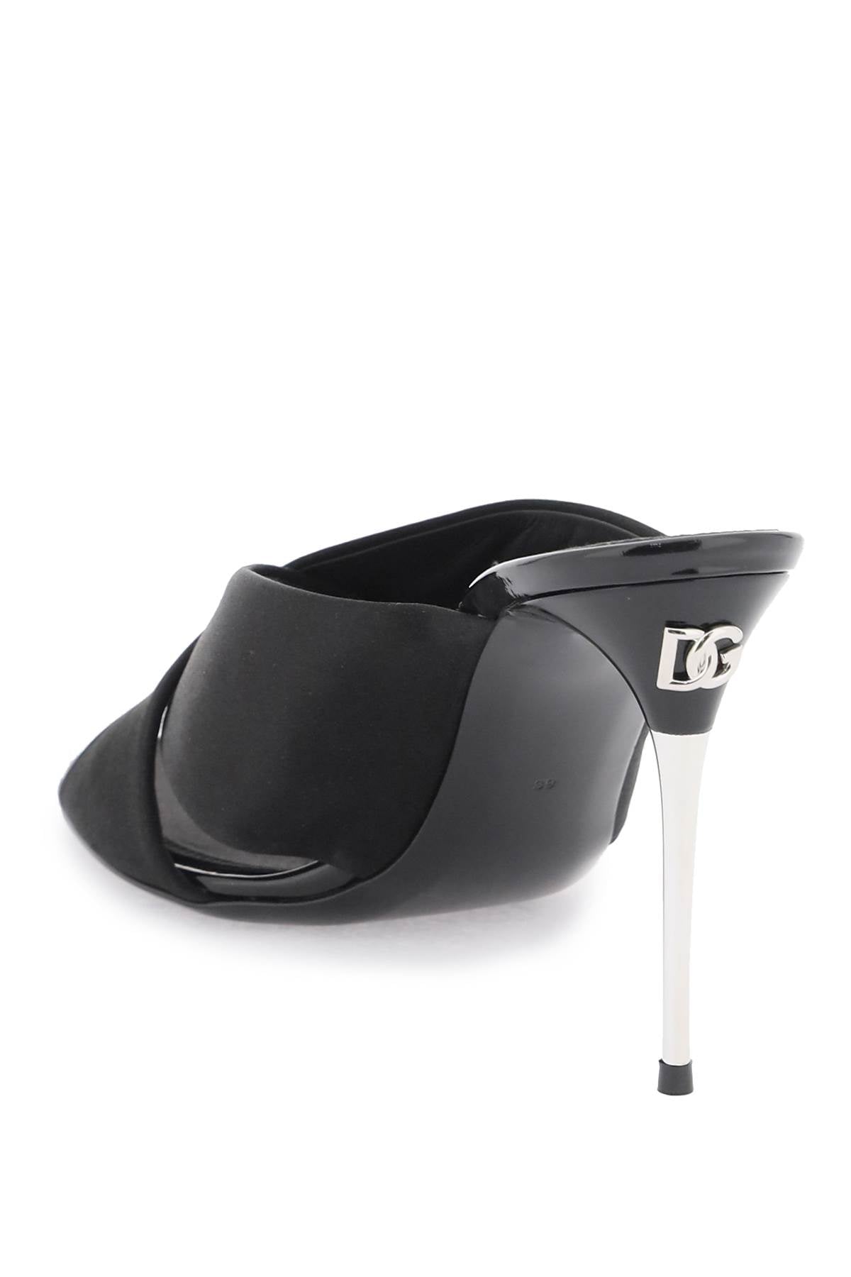These Dolce & Gabbana mules are characterized by criss-crossed bands in satin silk, lined with leather and a stiletto heel in metal with the DG logo. The insole is made of satin with patent edges and the sole is in leather. Size and Fit - Heel Height = 8,5 cm,