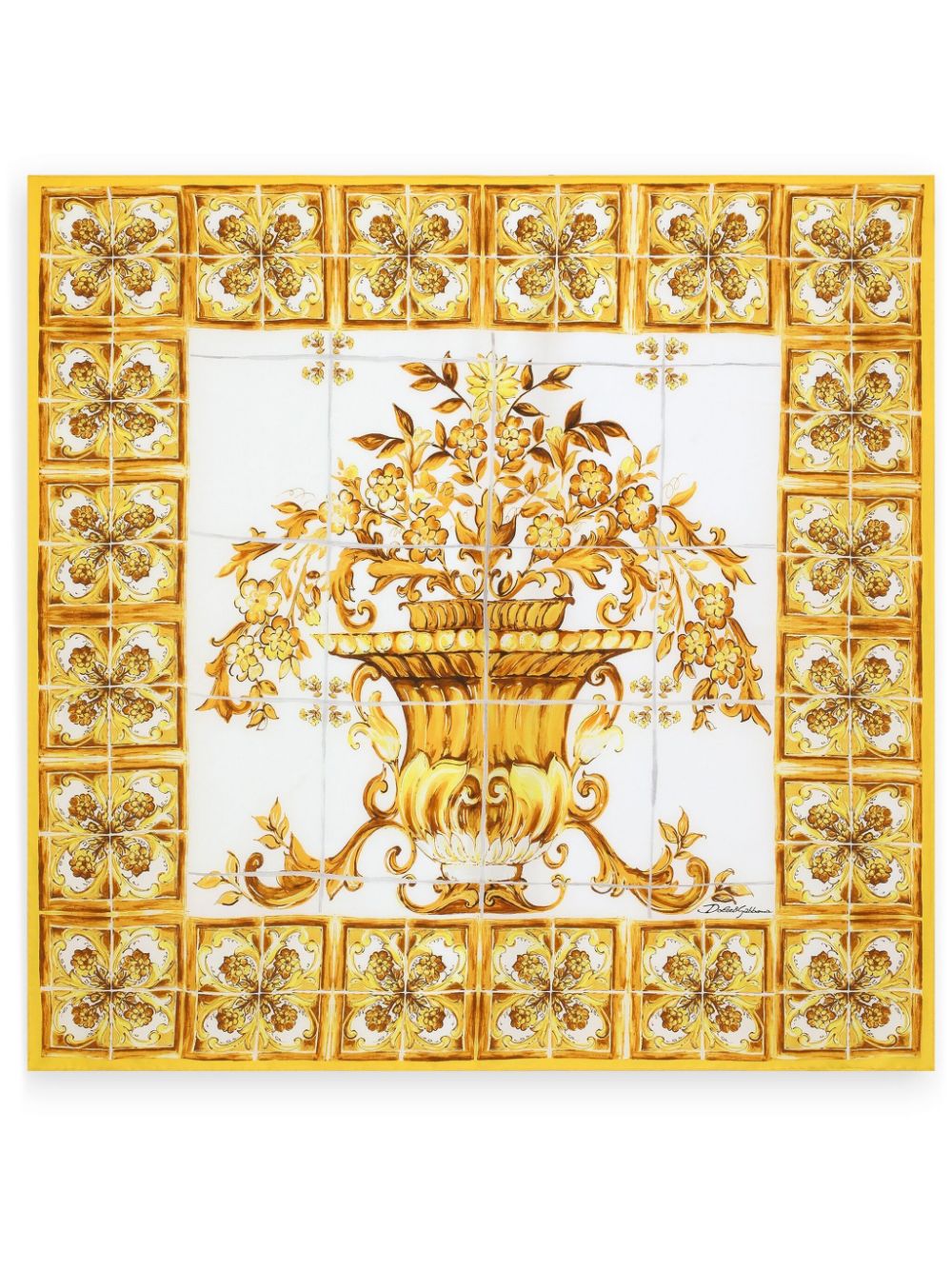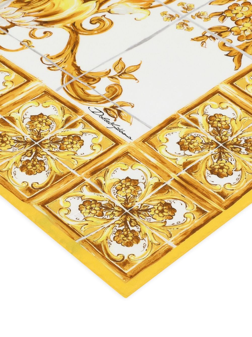 white yellow silk twill weave Majolica print square body finished edge Size and Fit - Length: 90.0 Centimetres. WIDTH: 90.0 Centimetres.