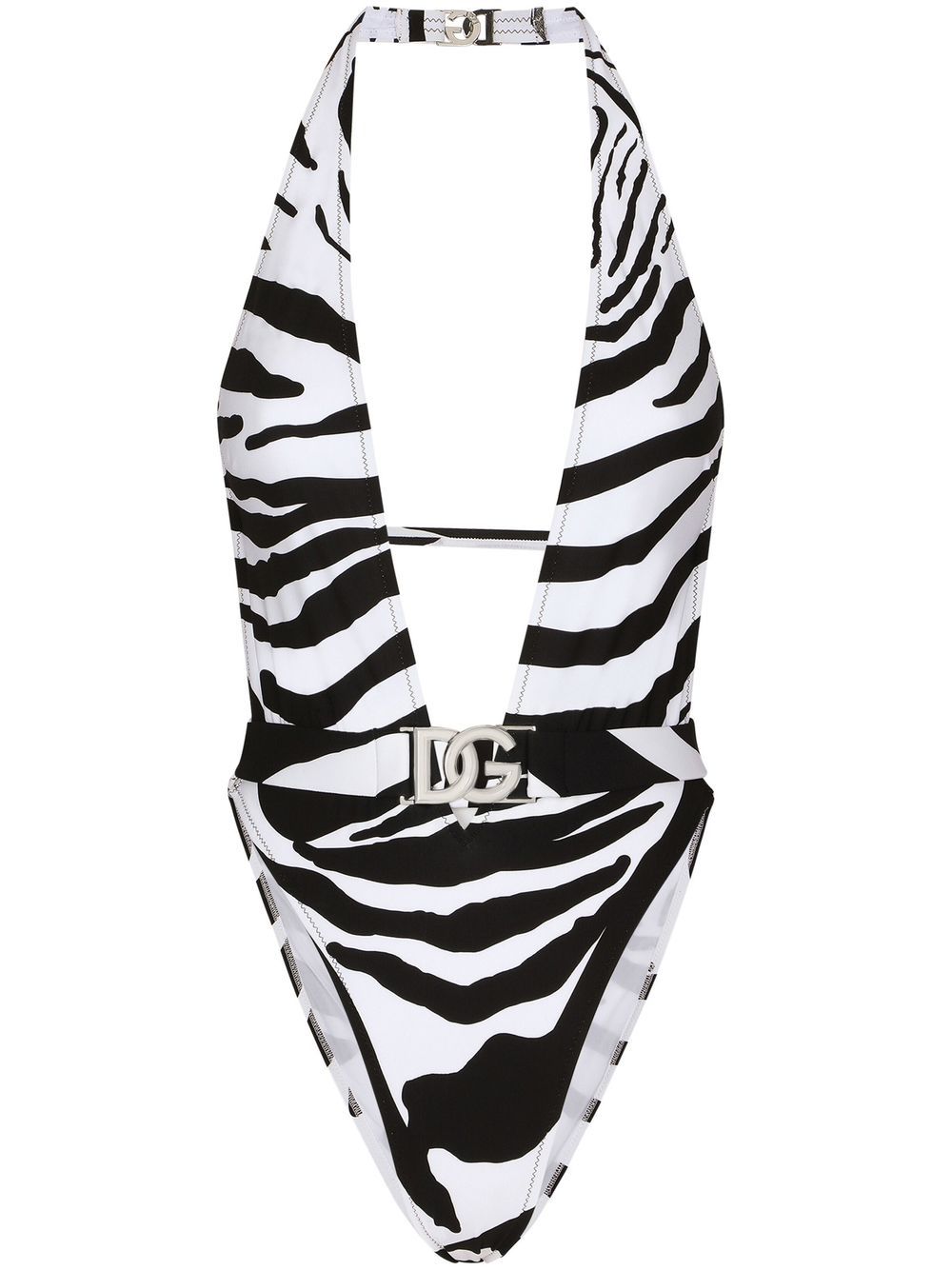 black stretch-design zebra print logo plaque halterneck plunging V-neck open back high cut Be mindful to try on swimwear over your own garments.