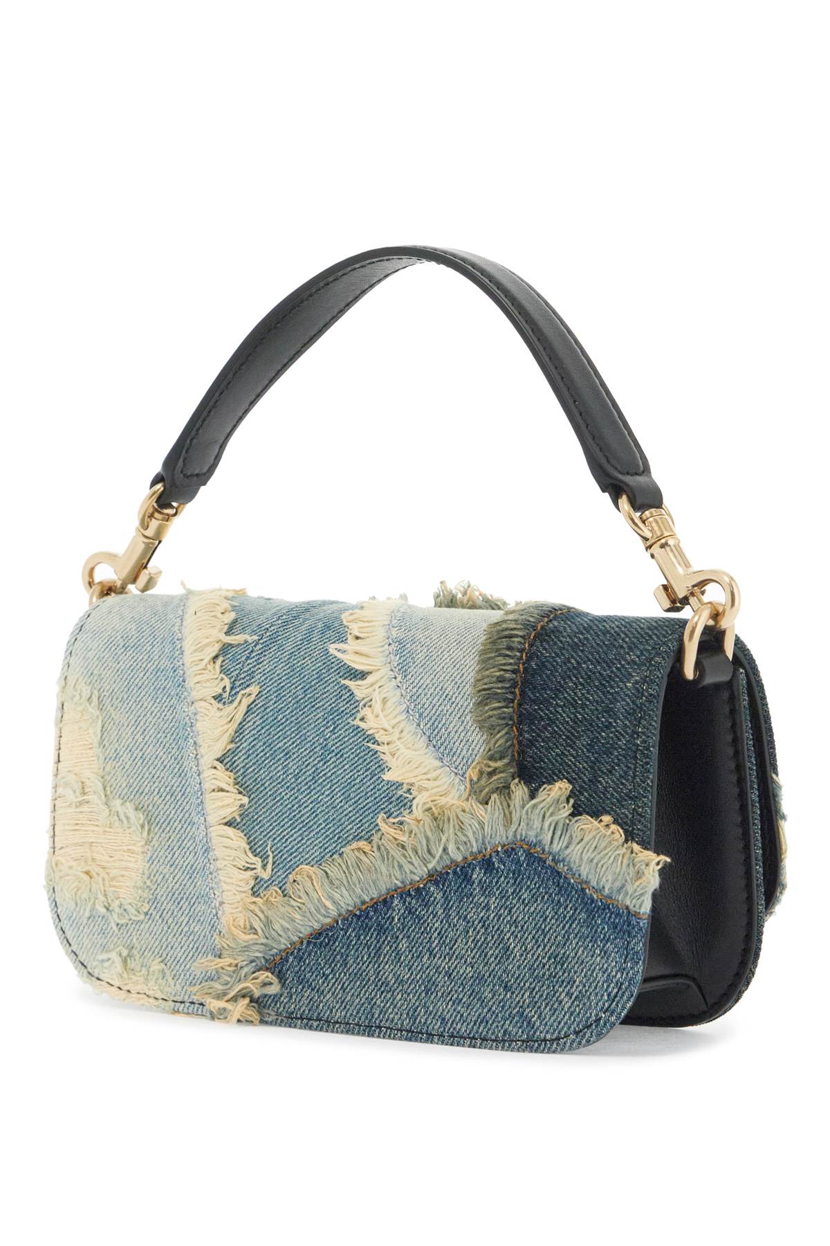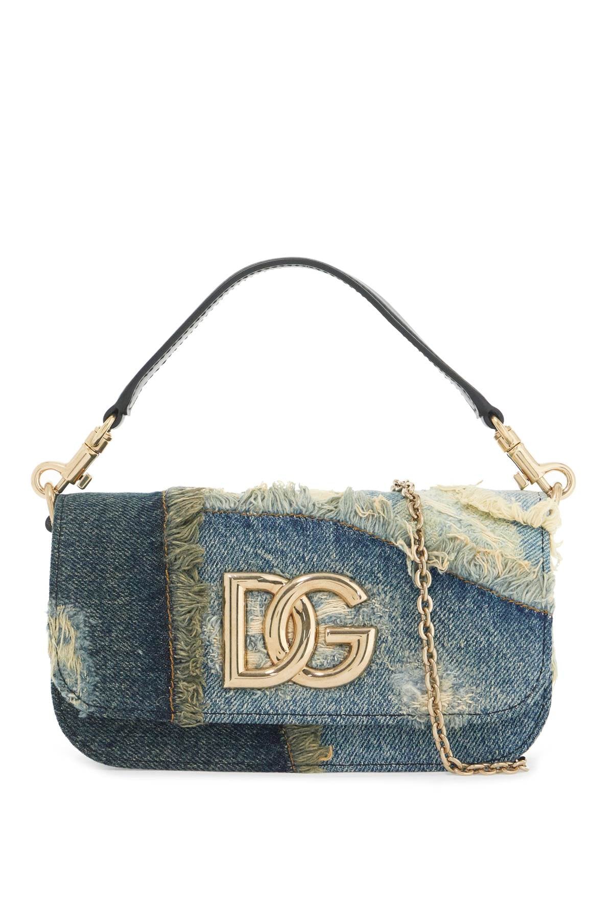 The Dolce & Gabbana 3.5 shoulder bag is made of patchwork cotton denim with distressed details and decorated with a gold metal DG logo. It features a magnetic closure, a leather-lined interior with a slip pocket, and comes with both a removable leather handle and chain strap for a crossbody or shoulder look. Size and Fit - Bag Length = 19,5 cm, Bag Height = 10 cm, Bag Weight = 5,5 cm,