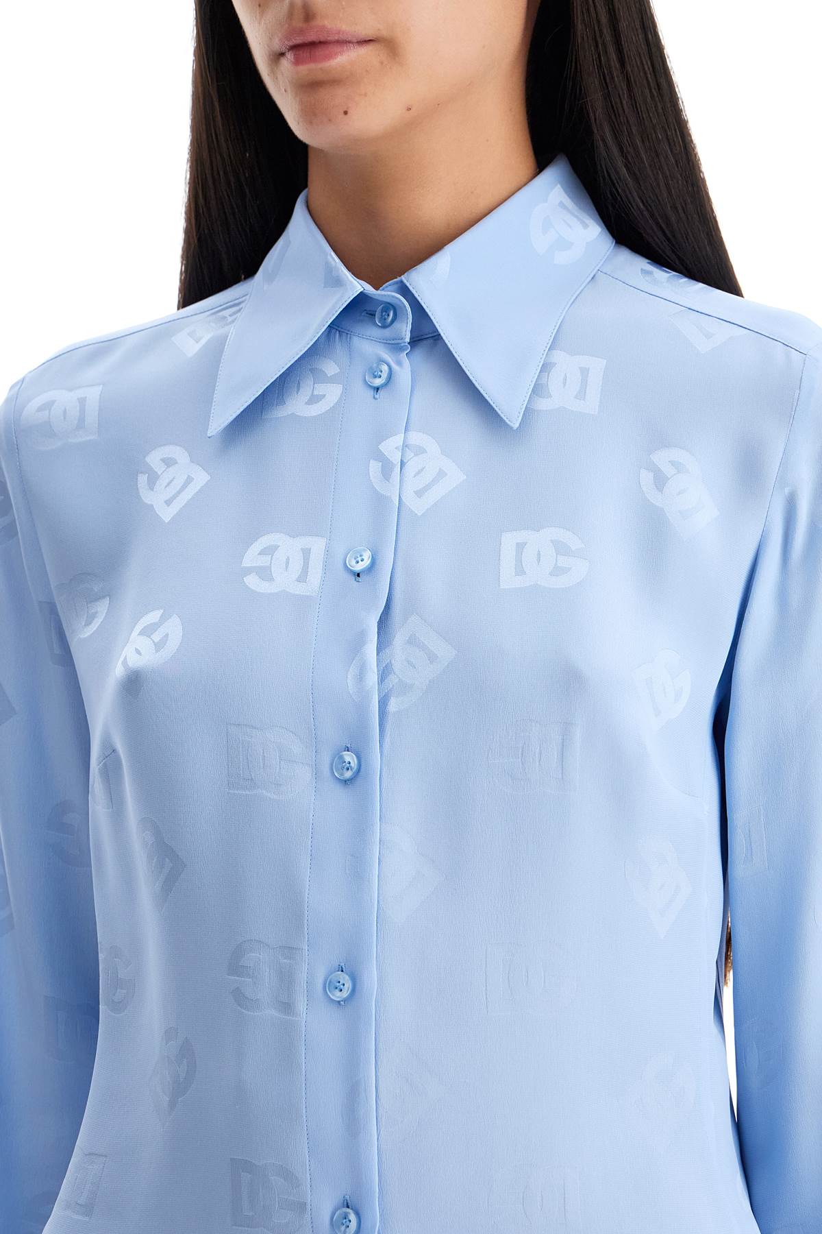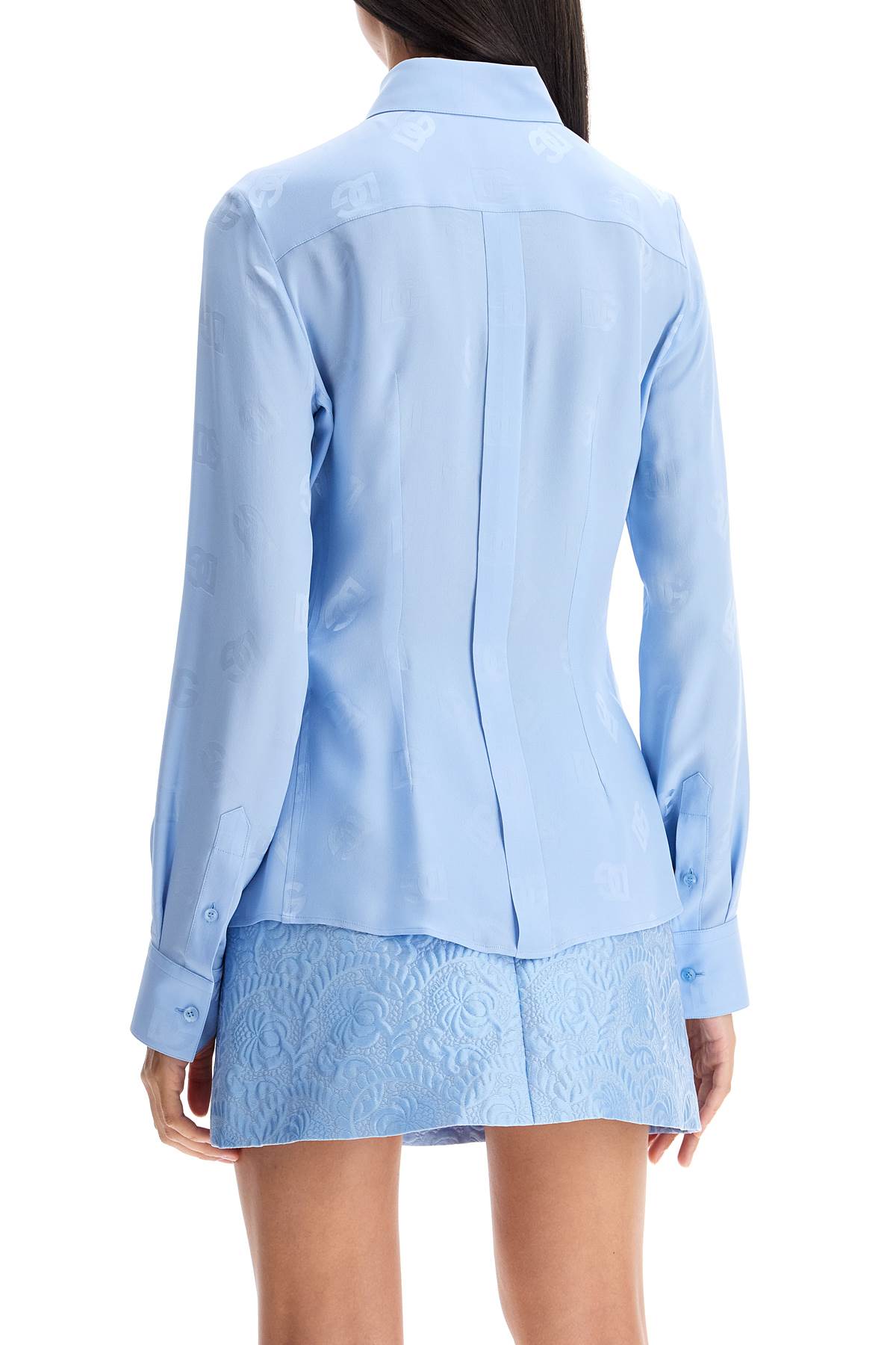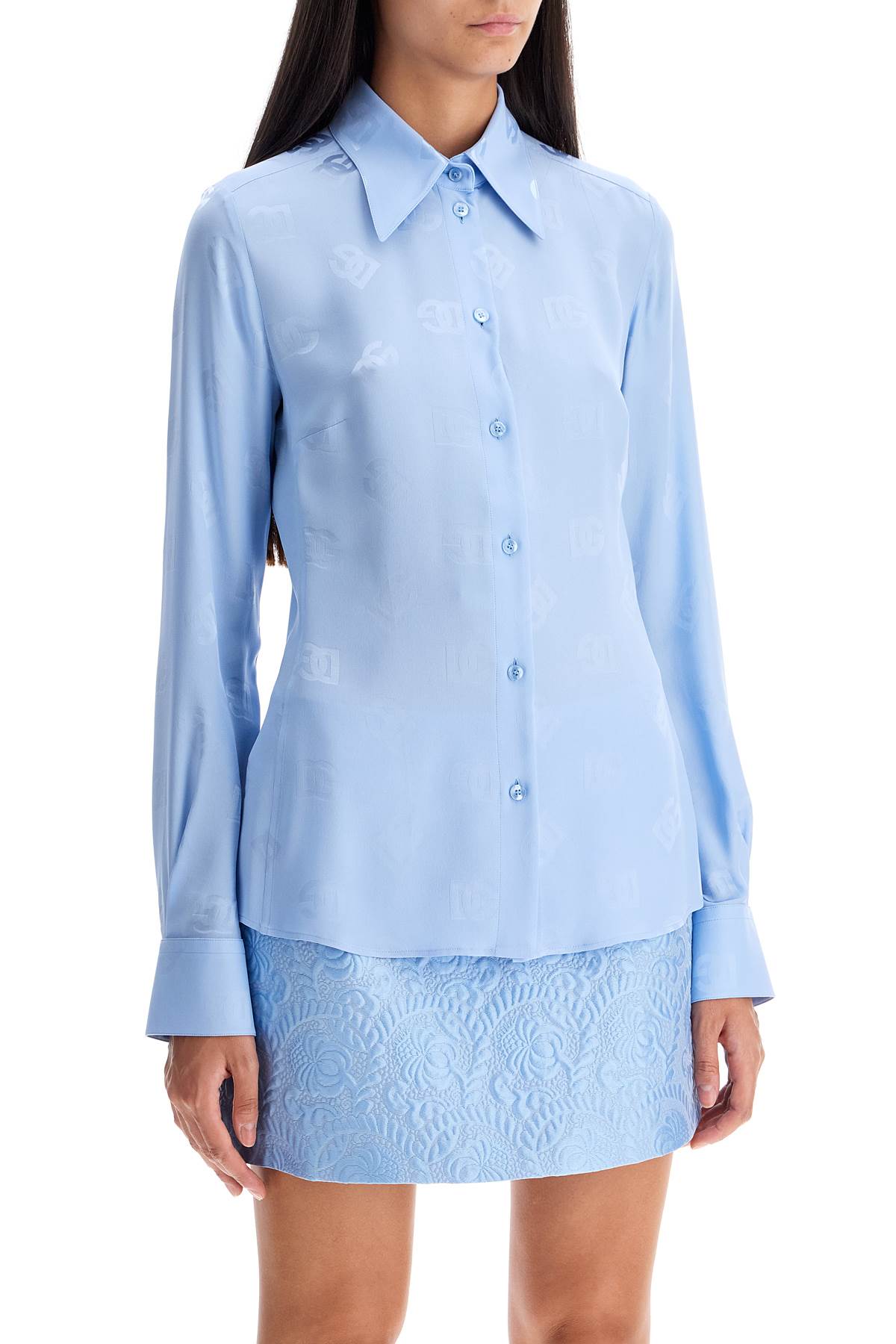 This Dolce & Gabbana long-sleeved shirt features a slim silhouette and is made of pure silk jacquard with an all-over DG logo pattern. It has a classic design with a pointed collar, front button closure, and straight cuffs. The model is 177 cm tall and wears size IT 40.