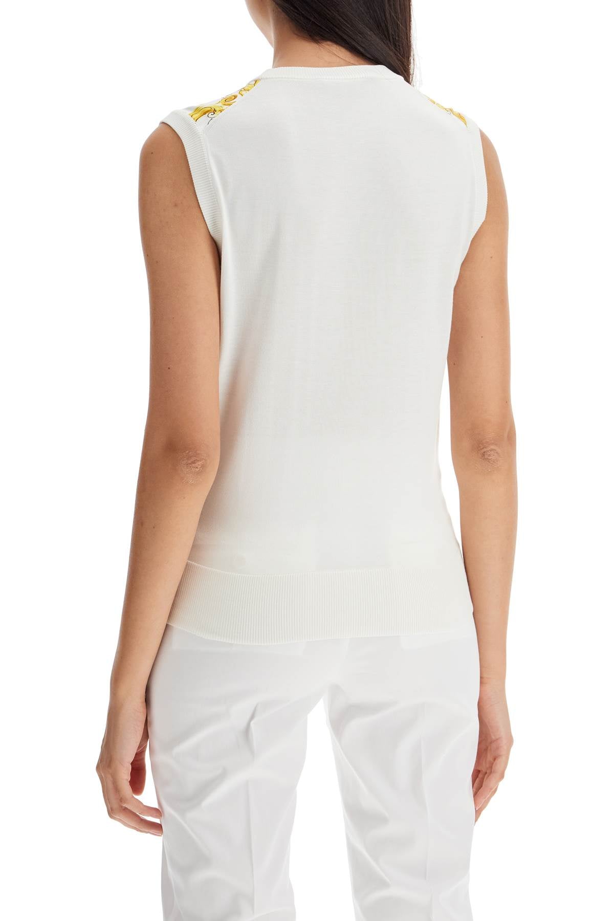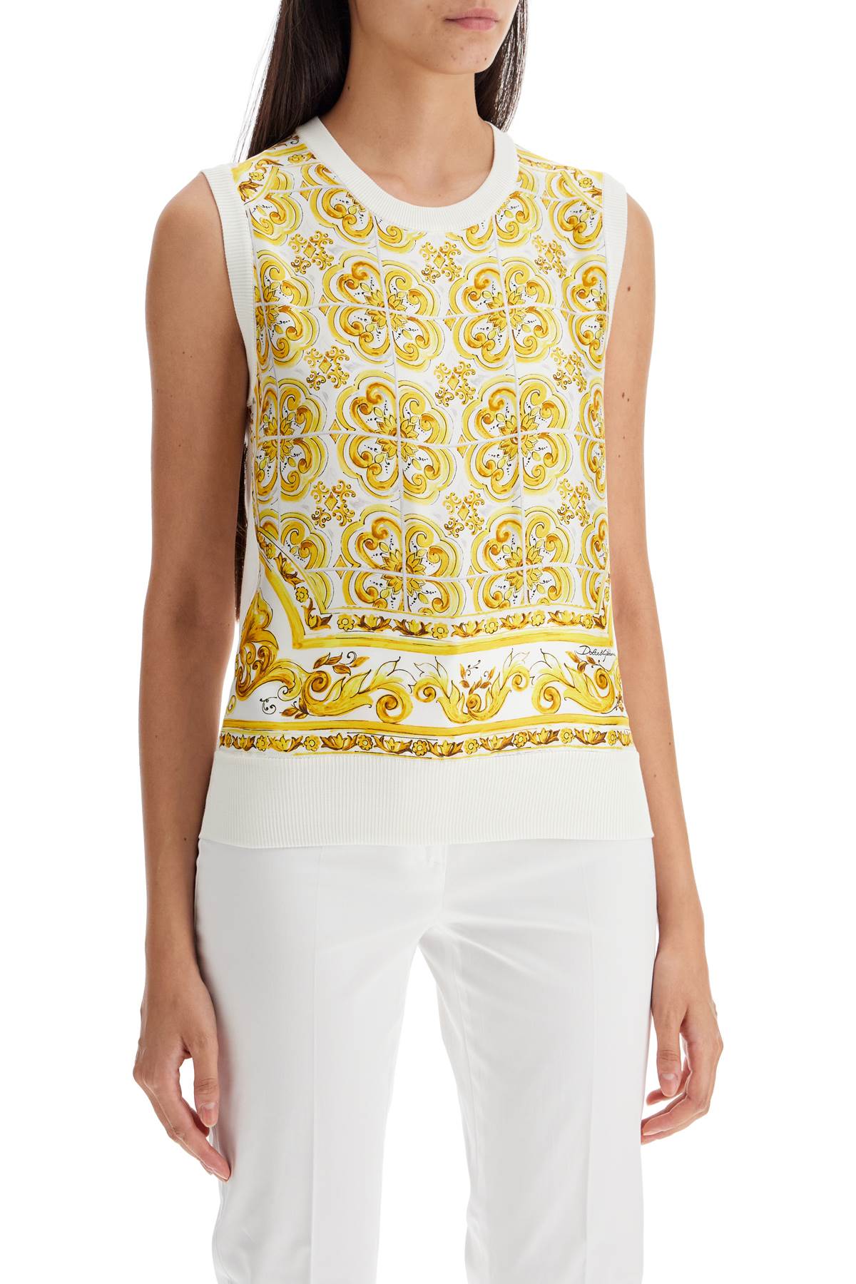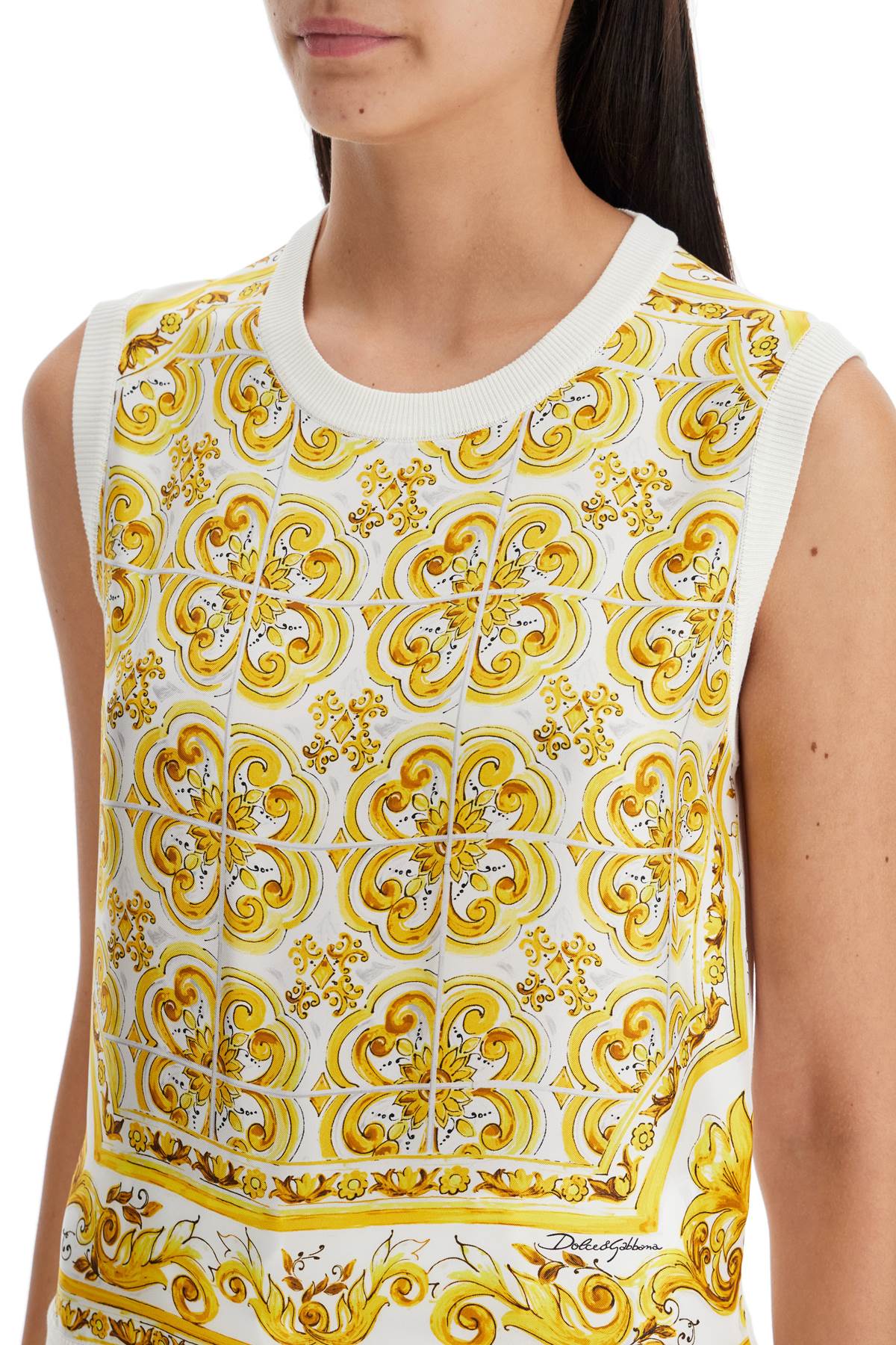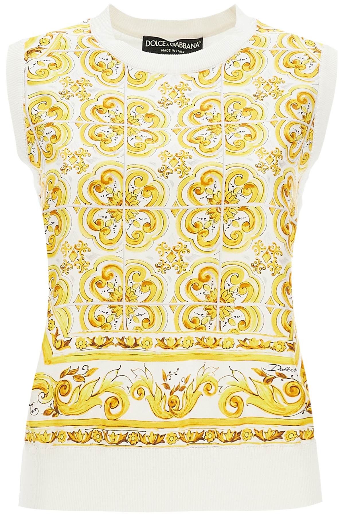 This top by Dolce & Gabbana is made of fine silk knit with a front panel in printed Maiolica silk twill. It features a round neckline with ribbed trim and has a regular fit. The model is 177 cm tall and wears an Italian size 40.