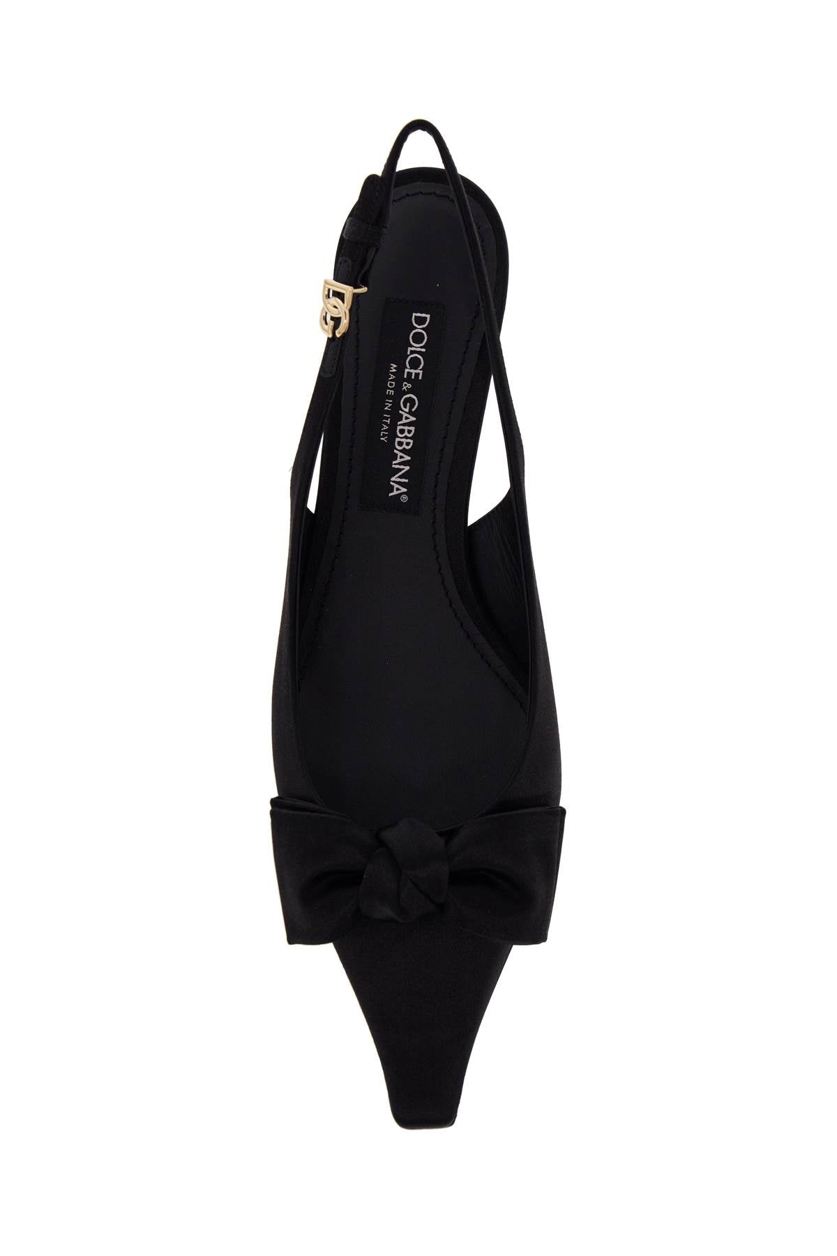 These Dolce & Gabbana slingback pumps are made of silk satin and adorned with a bow appliqué on the upper. The adjustable strap features a DG gold metal buckle, while the insole is made of leather and the sole is crafted from leather as well. Size and Fit - Heel Height = 3 cm,