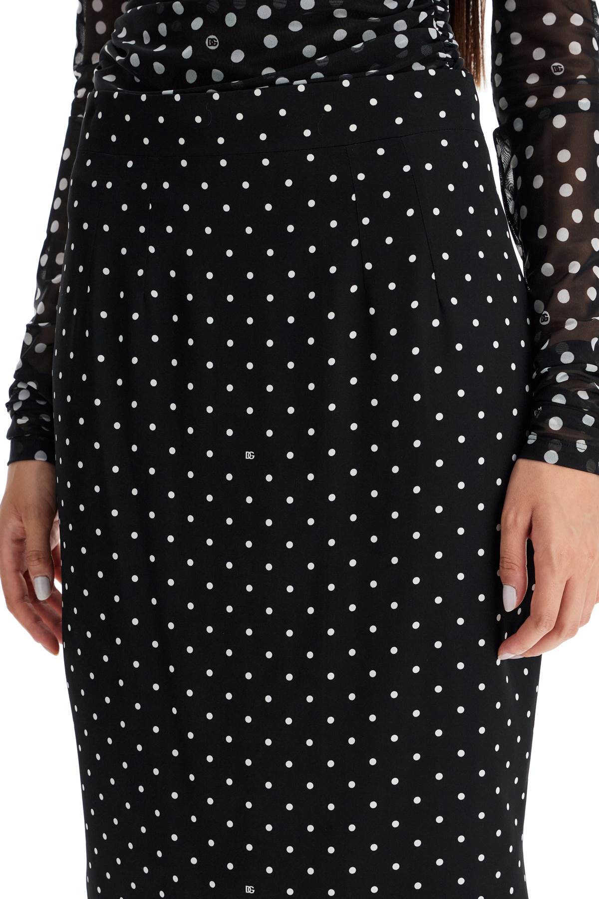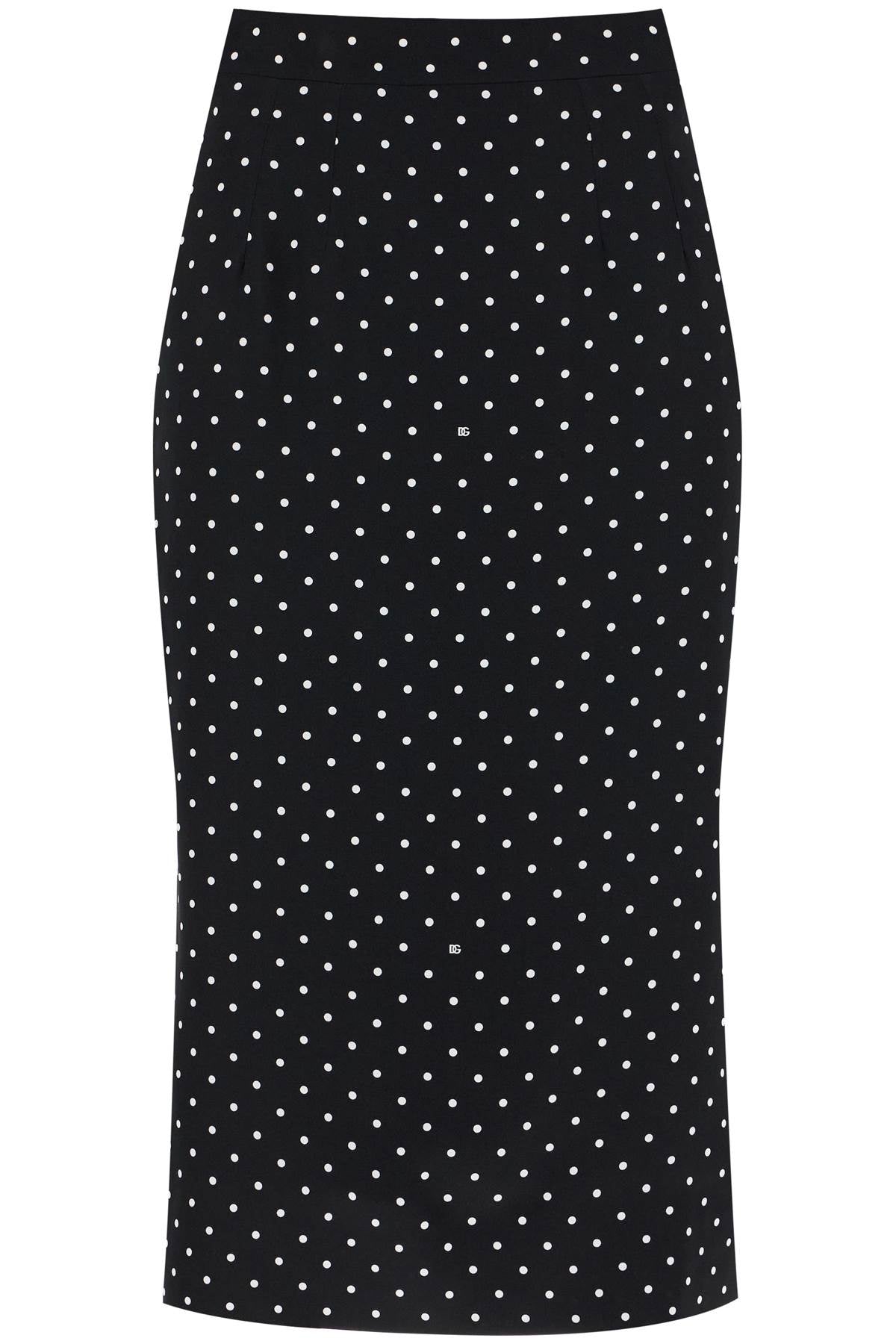 A white polka dot pattern on a black background gives a retro touch to this Dolce & Gabbana pencil skirt, made of high-quality stretch silk charmeuse. The skirt is lined and finished with a back slit. Zip closure at the back. The model is 177 cm tall and wears size IT 40.