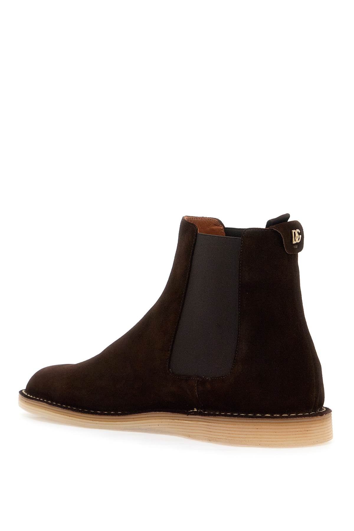 Dolce & Gabbana ankle boots from the New Florio Ideal line, made of suede and featuring a golden metal DG logo on the back. The interior is lined with leather and the sole is branded with a rubber logo. Size and Fit - Heel Height = 2 cm,