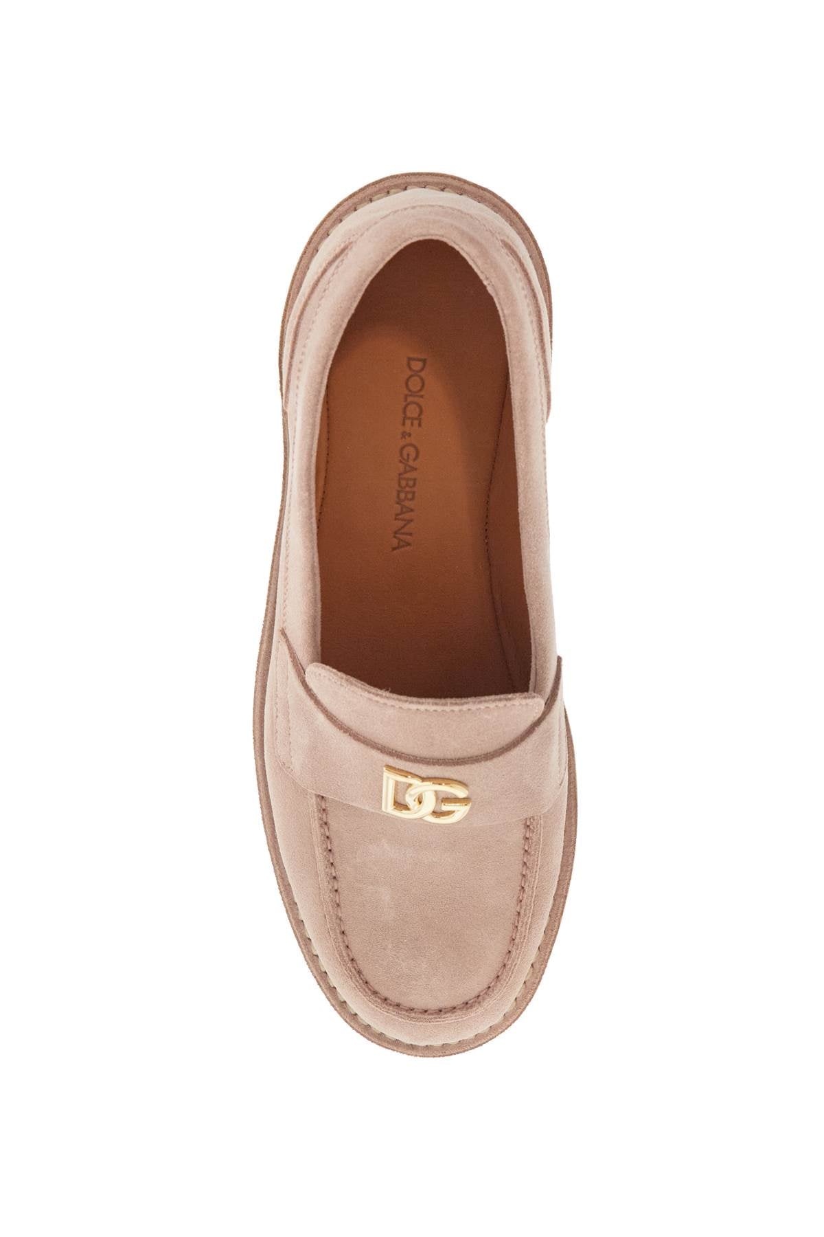 Dolce & Gabbana loafers made of suede leather and personalized with the iconic DG logo in golden metal on the vamp. Essential design with a leather interior and rubber sole. Size and Fit - Heel Height = 2 cm,