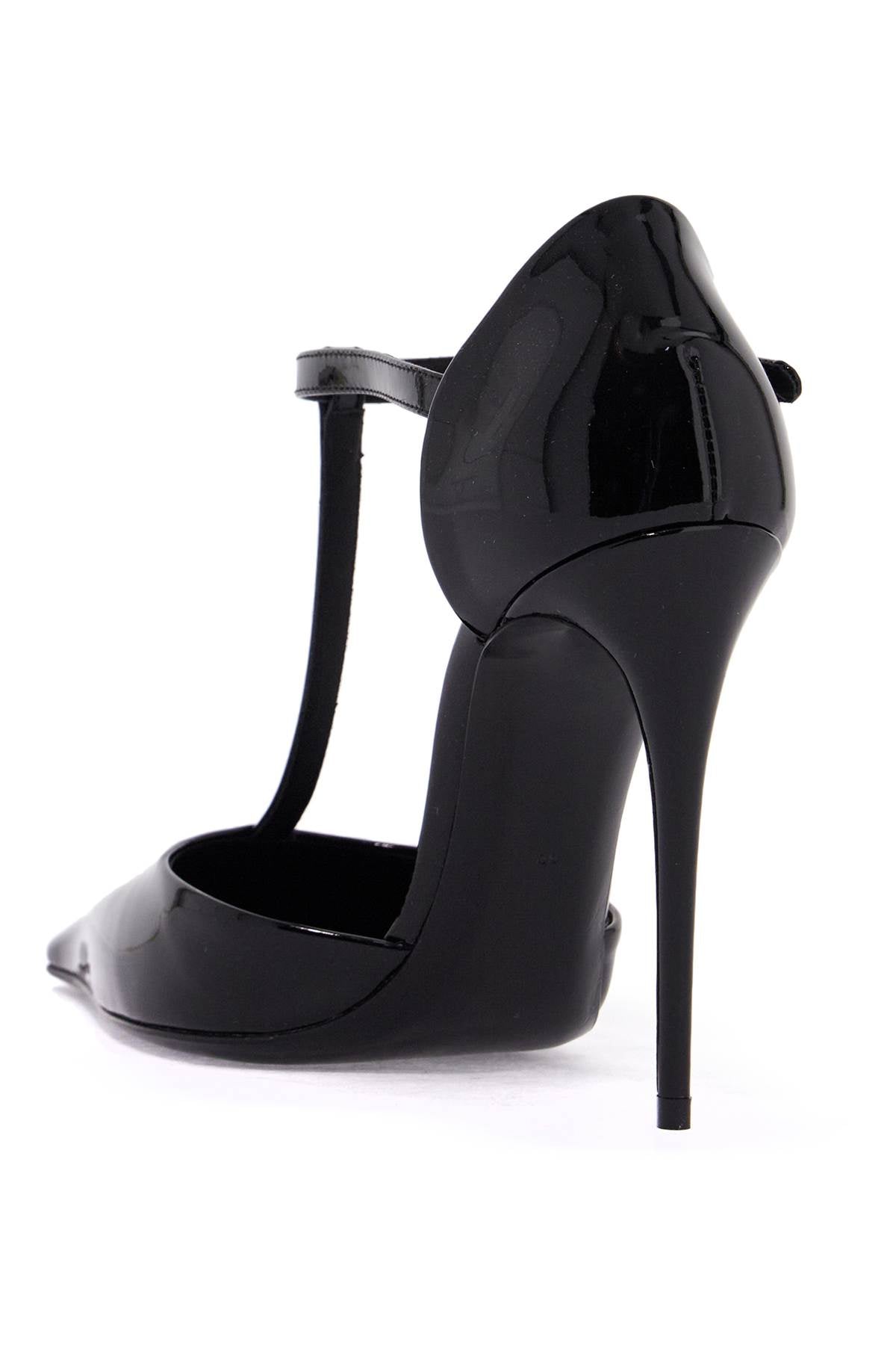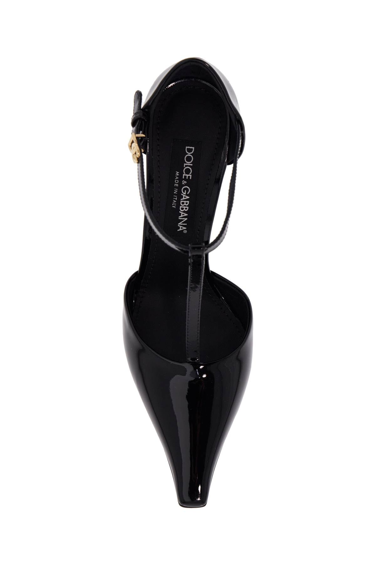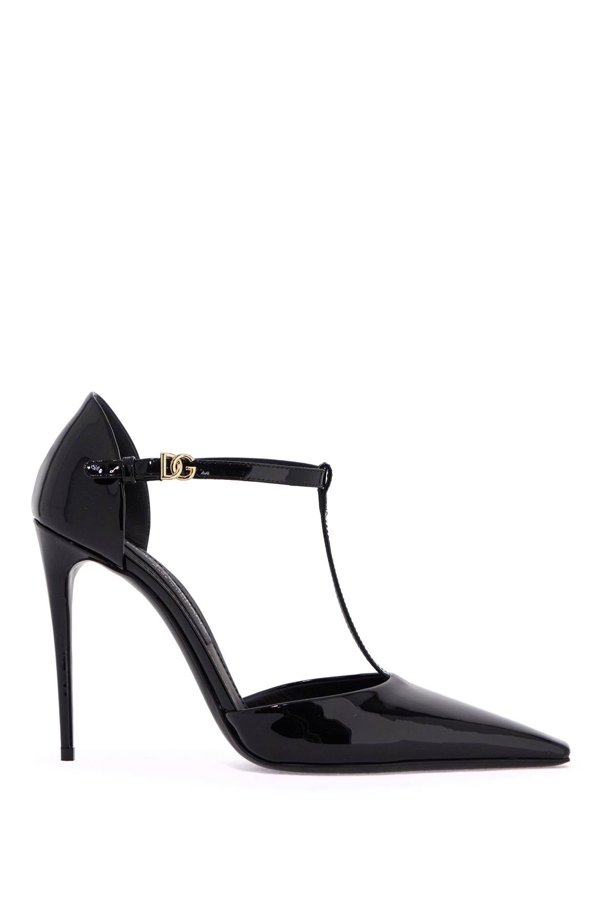 The T-bar Dé colleté by Dolce & Gabbana, from the Mun line, is made of patent leather and adorned with a golden metal DG logo on the adjustable ankle strap. The design features a pointed and squared toe and a covered stiletto heel, complete with leather lining and insole and a leather sole. Size and Fit - Heel Height = 11 cm,