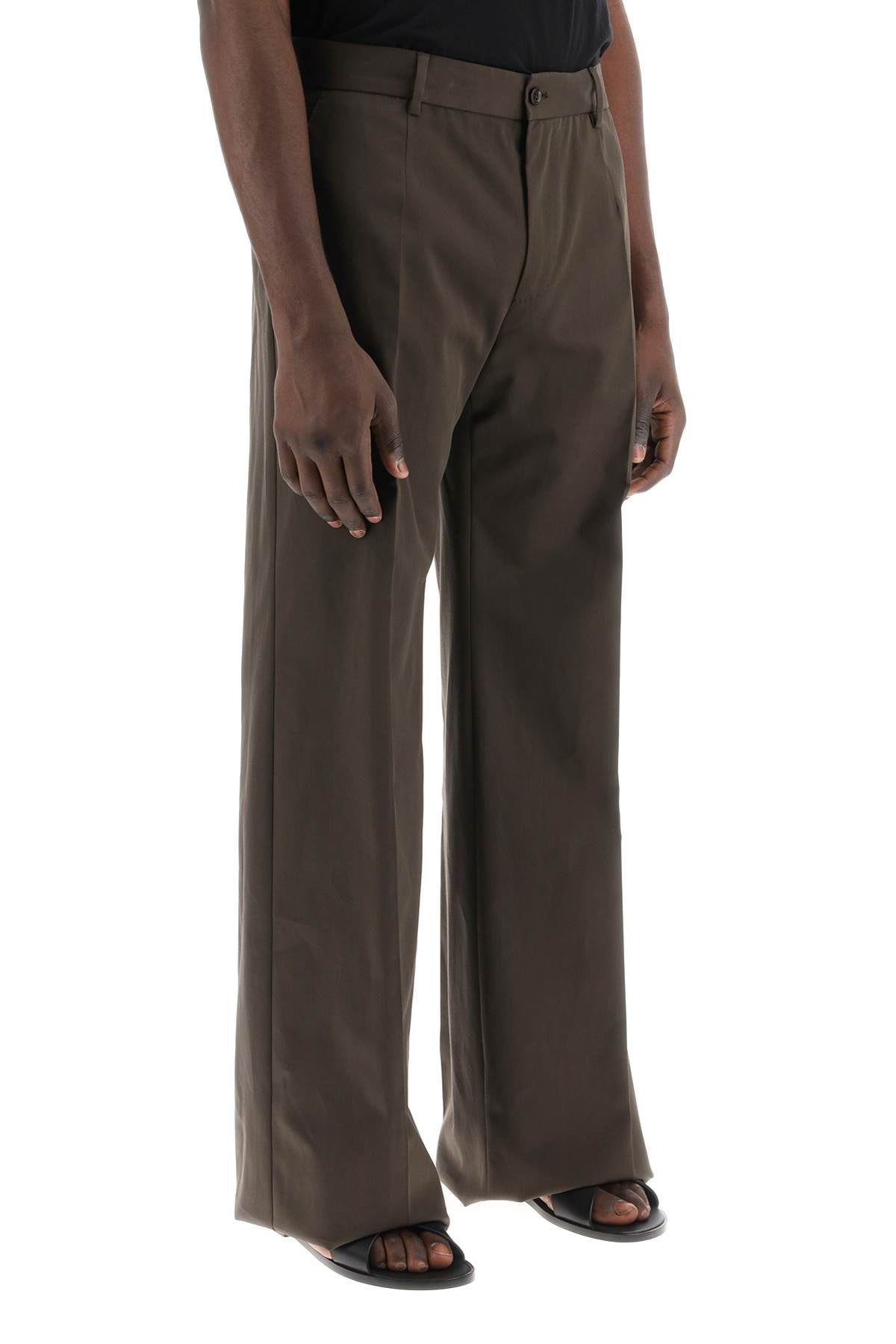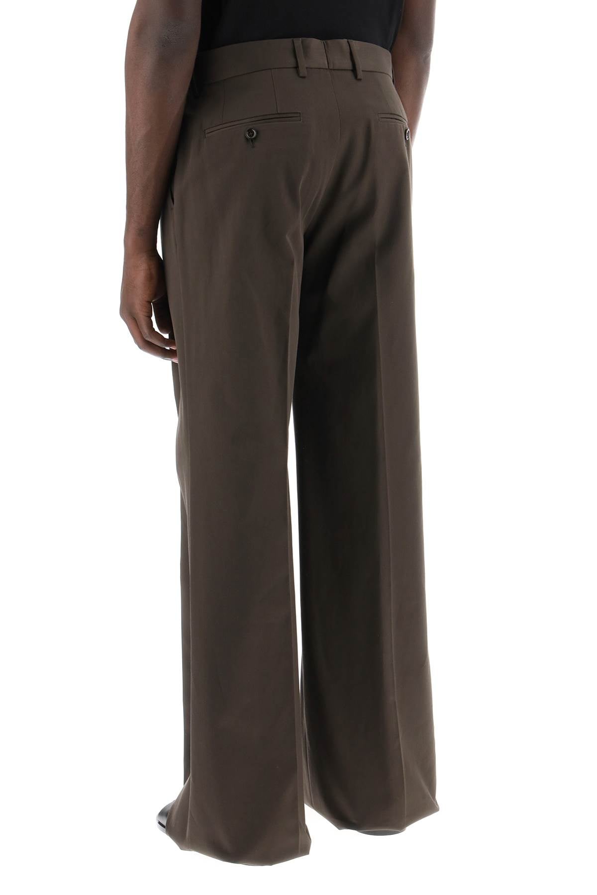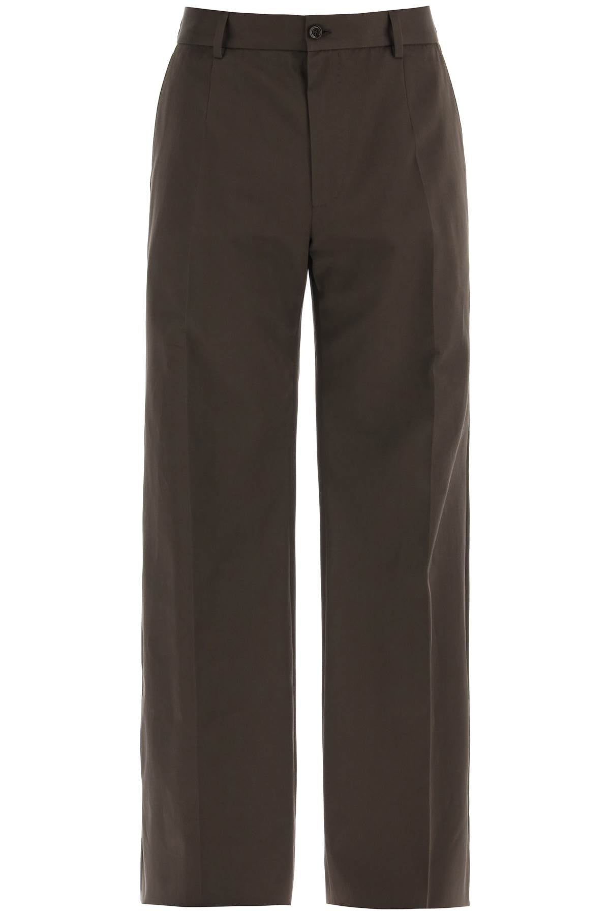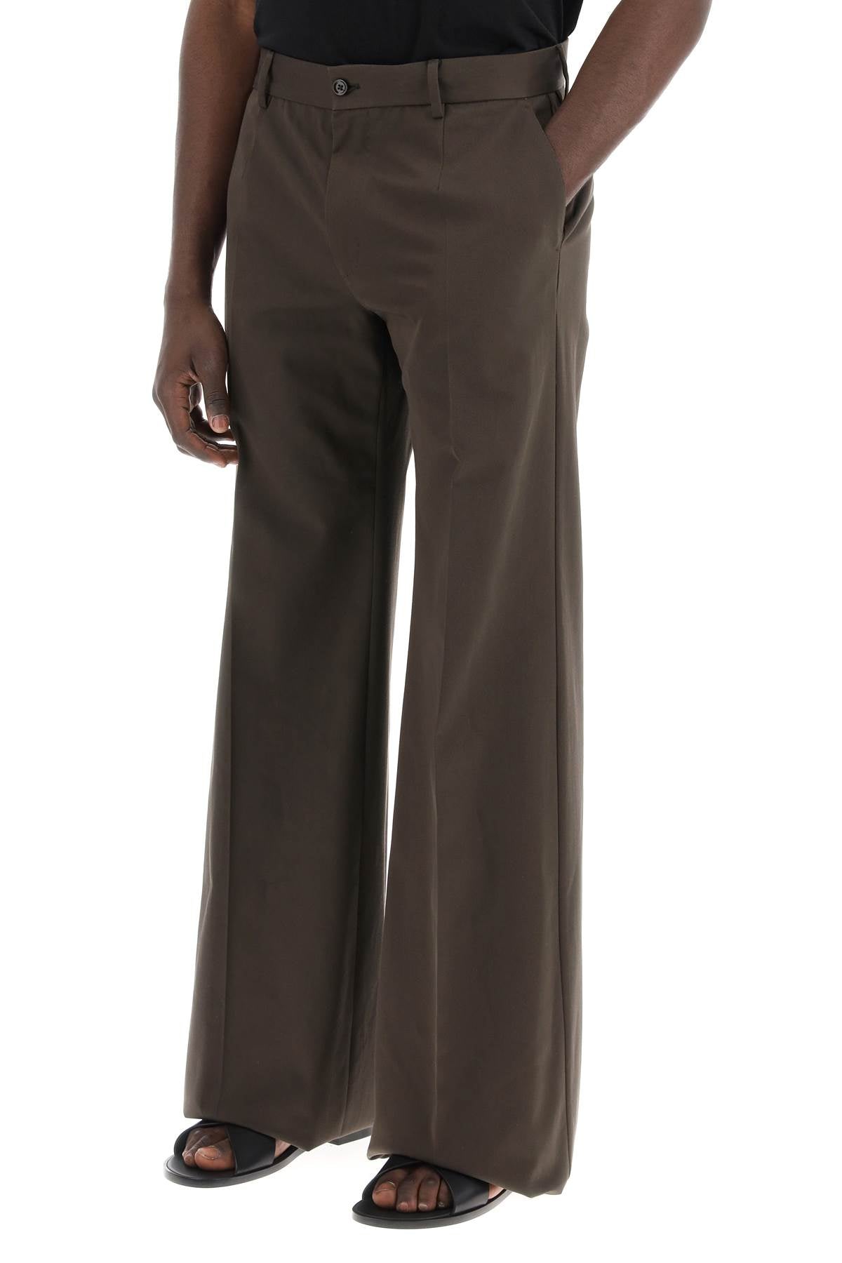These Dolce & Gabbana tailored trousers are made of pure cotton twill and feature a wide, flared leg. They have a hidden zip and button closure, French pockets, back welt pockets with buttons, and pressed creases on the front and back. The model is 187 cm tall and wears an IT size 48.