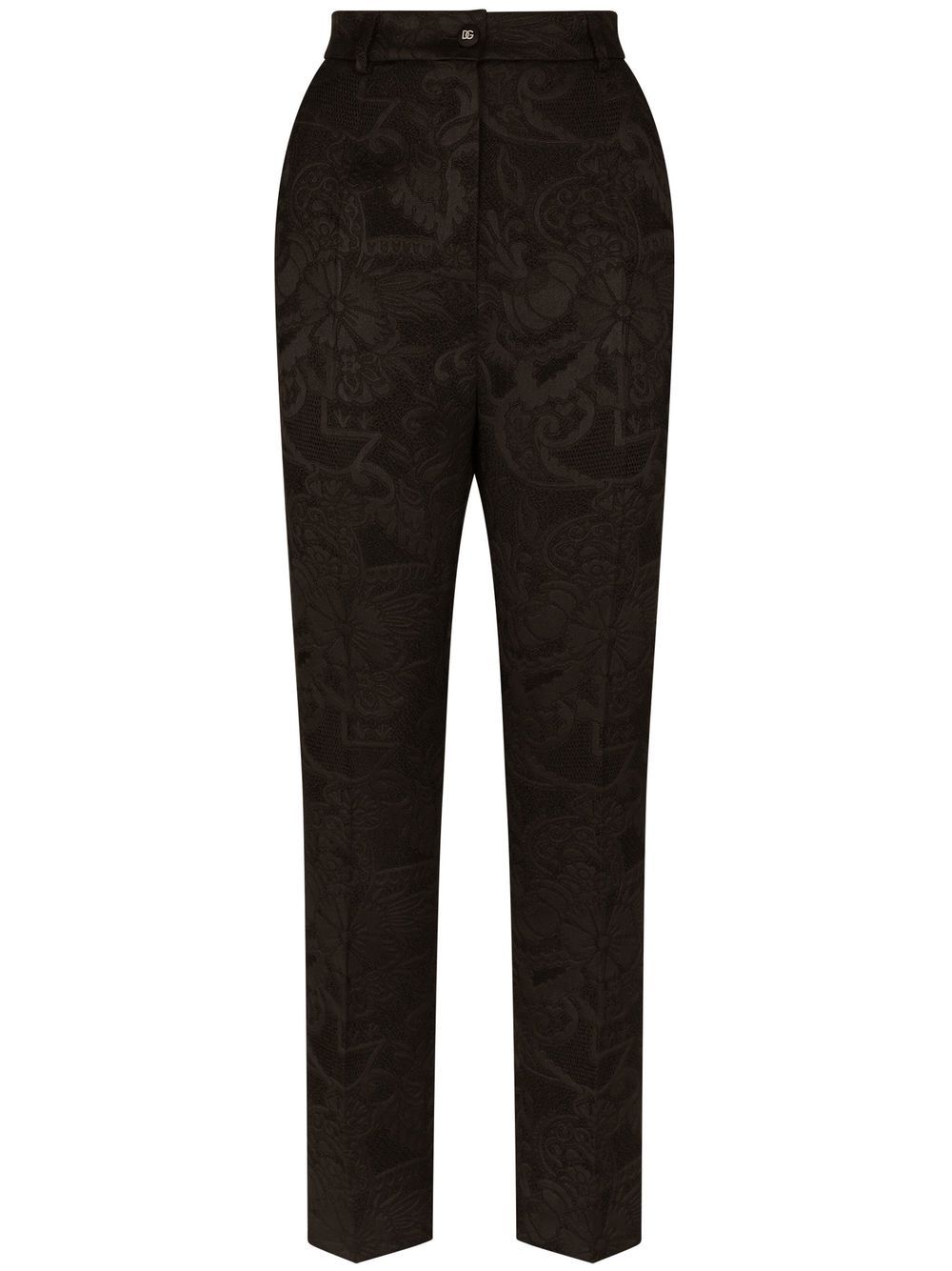 floral appliqué tapered trousers from DOLCE & GABBANA featuring black, stretch-design, floral appliqué, logo-embossed buttons, belt loops, high waist, button fly fastening, tapered leg and ankle-length. Size and Fit - This piece fits true to size. We recommend you get your regular size. Model is 1,75m / 5ft 8in wearing size 40 (IT)