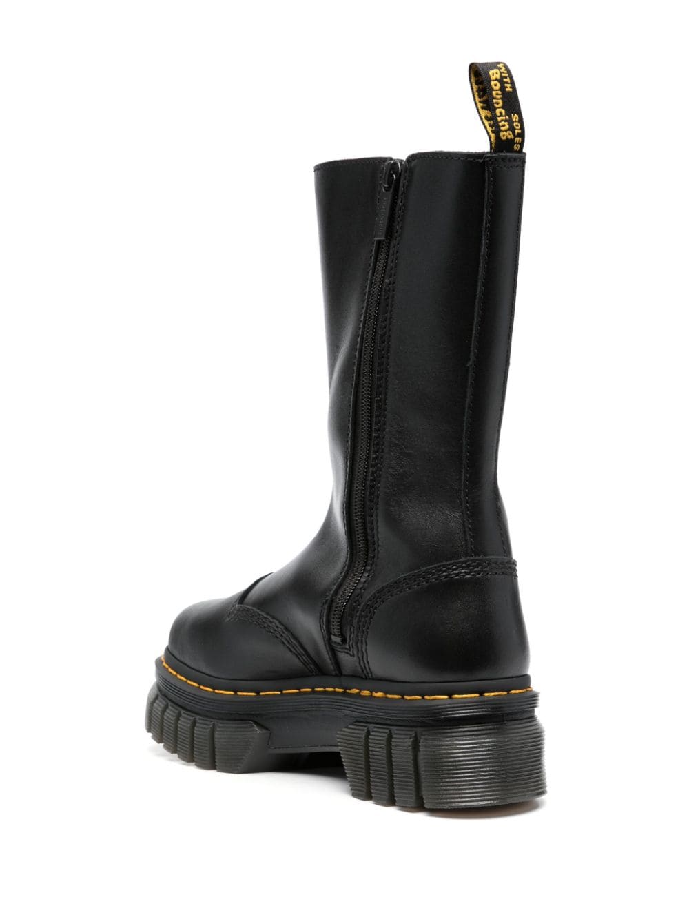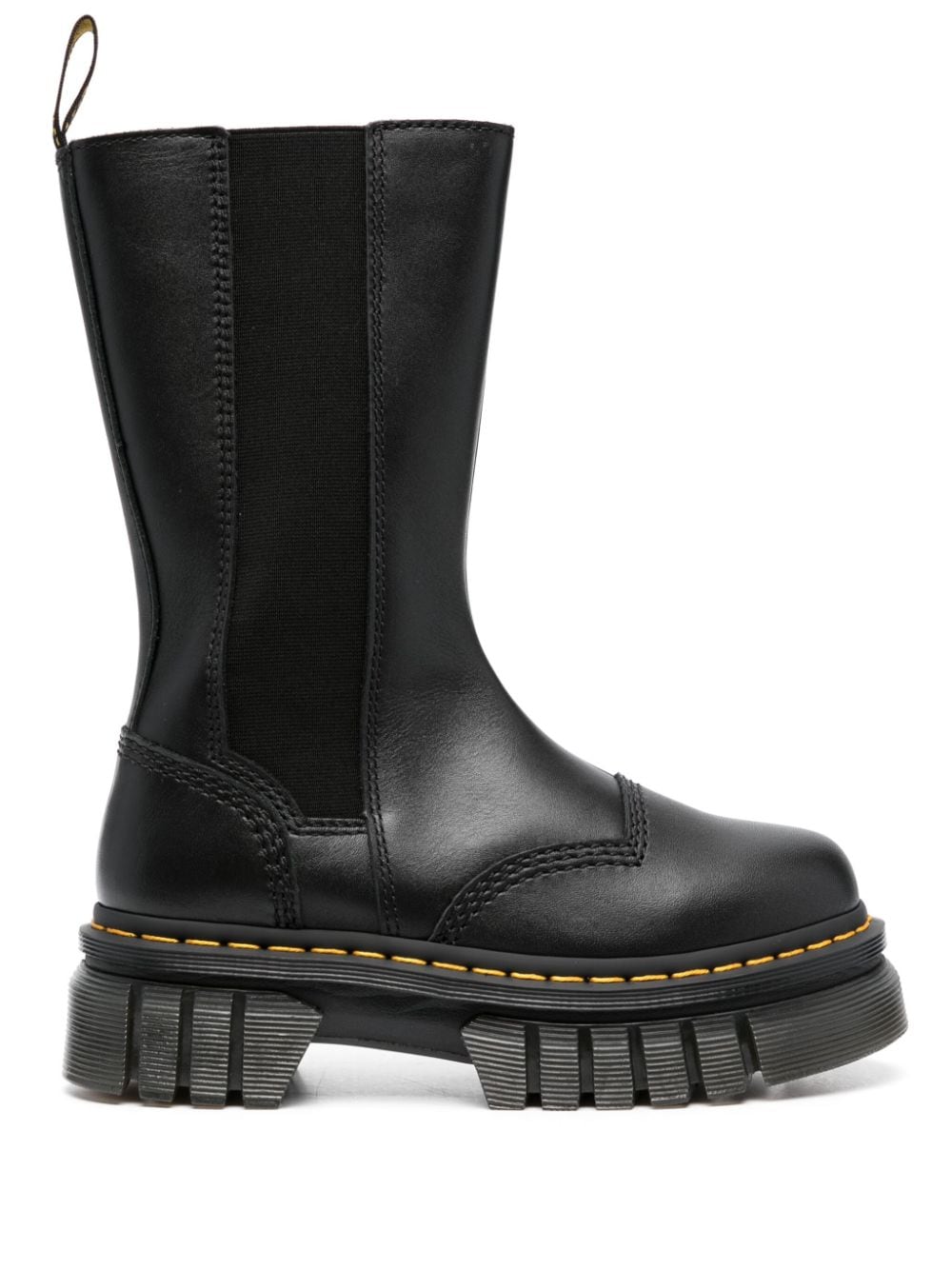 Audrick Tall nappa leather boots from DR. MARTENS featuring jet black, nappa leather, contrast stitching, elasticated side panels, logo pull-tab at the heel, round toe, short side zip fastening and rubber sole. Size and Fit - Heel 2 in / 5 cm; Platform 1,4 in / 3,5 cm