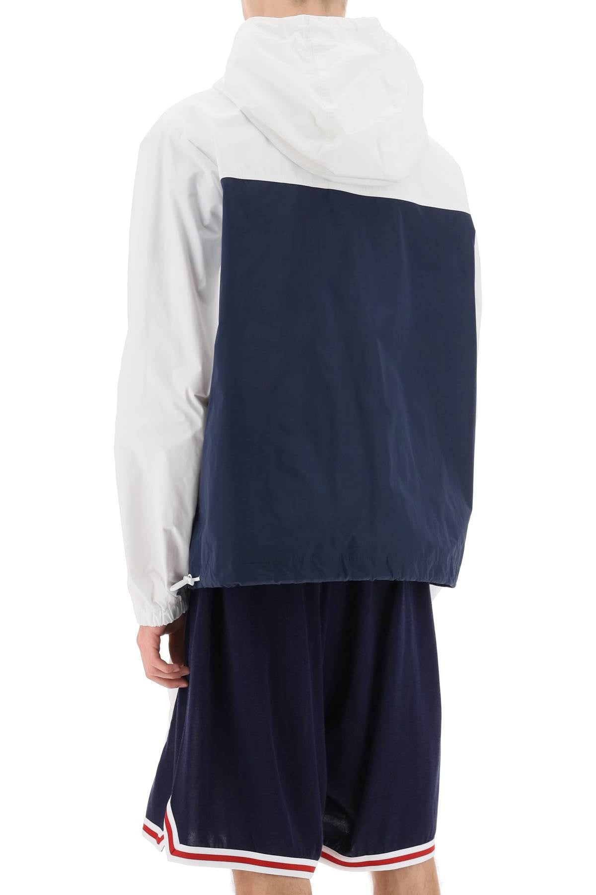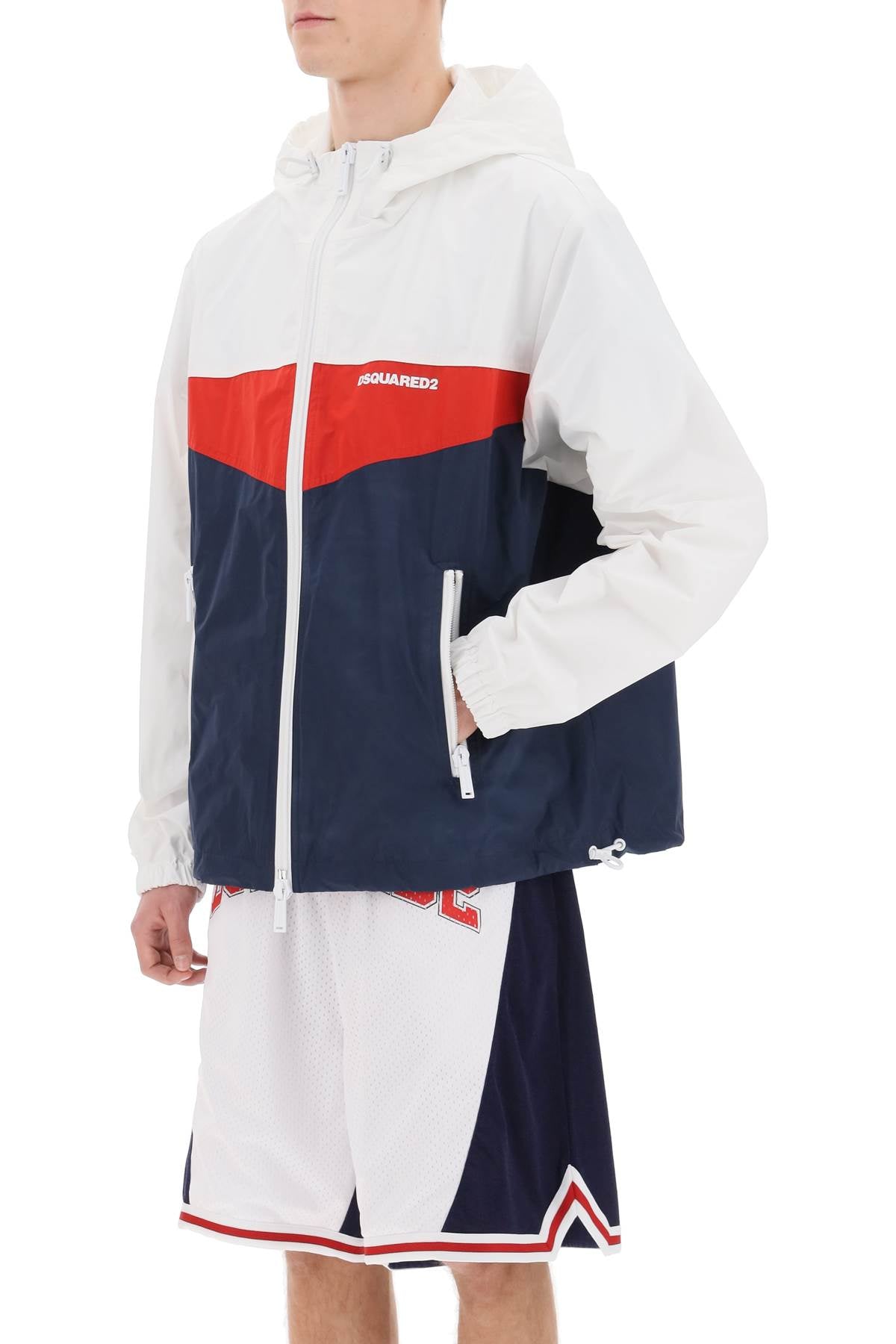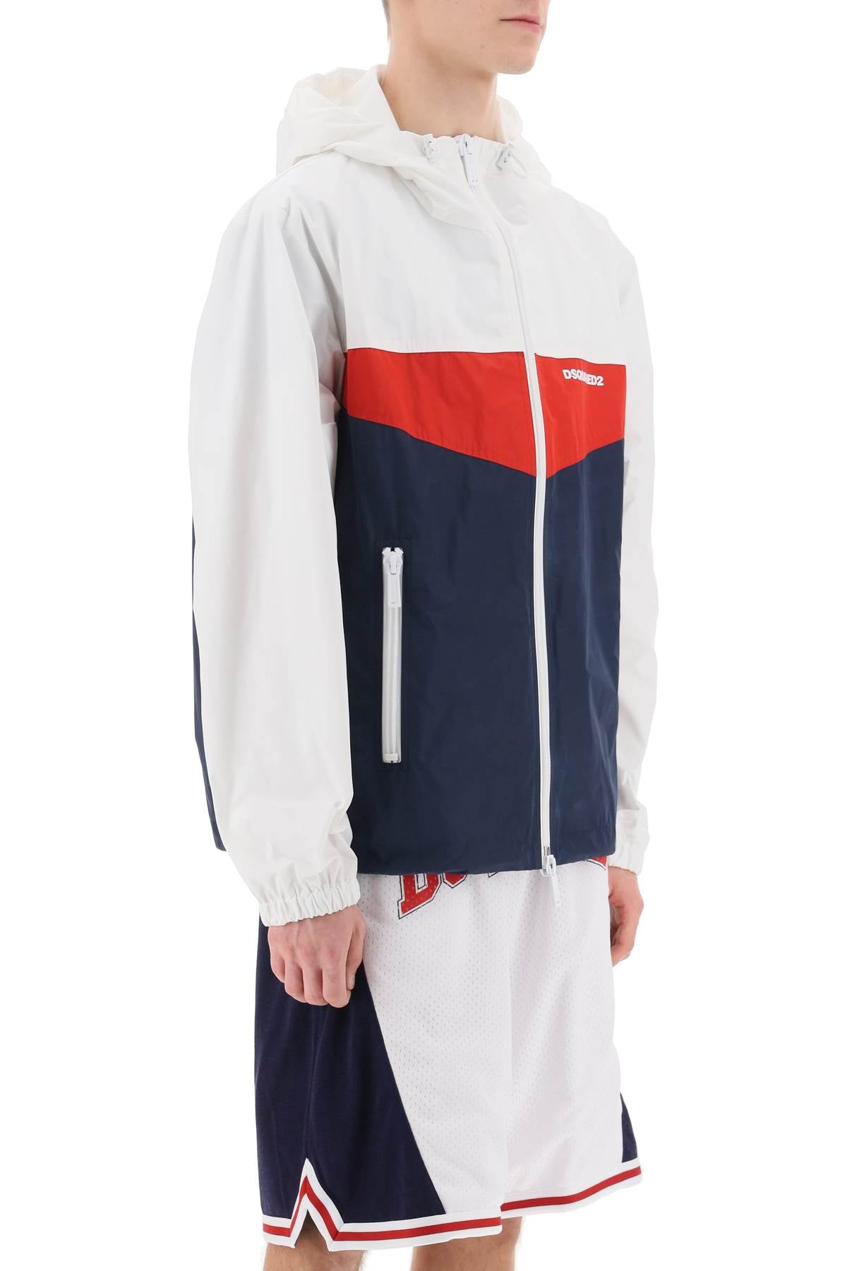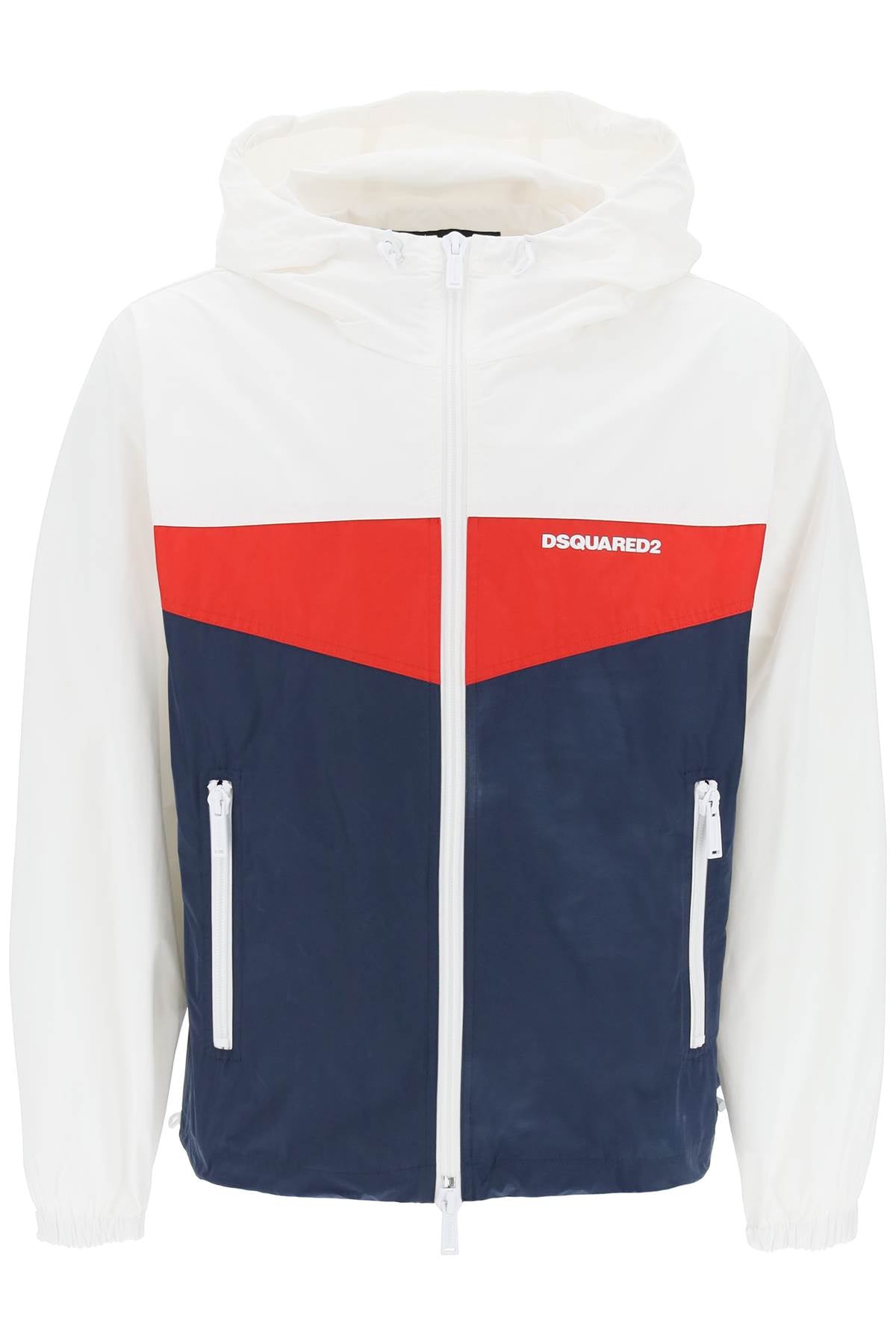 Dsquared2 windbreaker jacket crafted in techno taffeta with color block design enriched by logo print on the chest. It features adjustable hood with drawstring, two-way zipper closure, zipped welt pockets, elasticated cuffs and adjustable hem with drawstring. Lined interior. Regular fit. The model is 187 cm tall and wears size L.