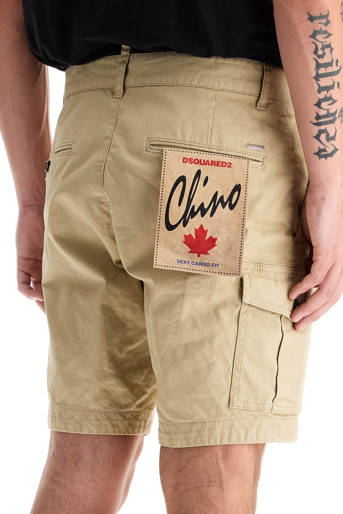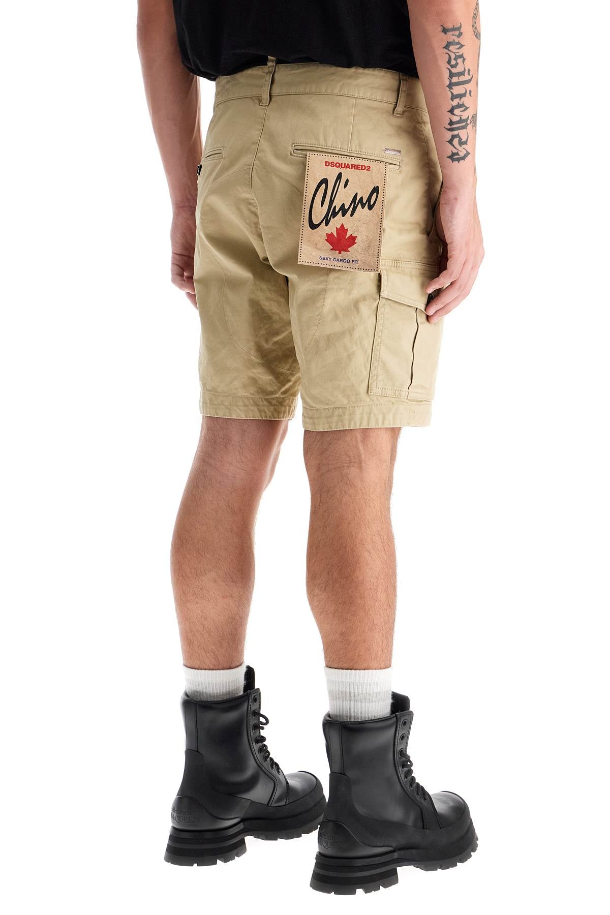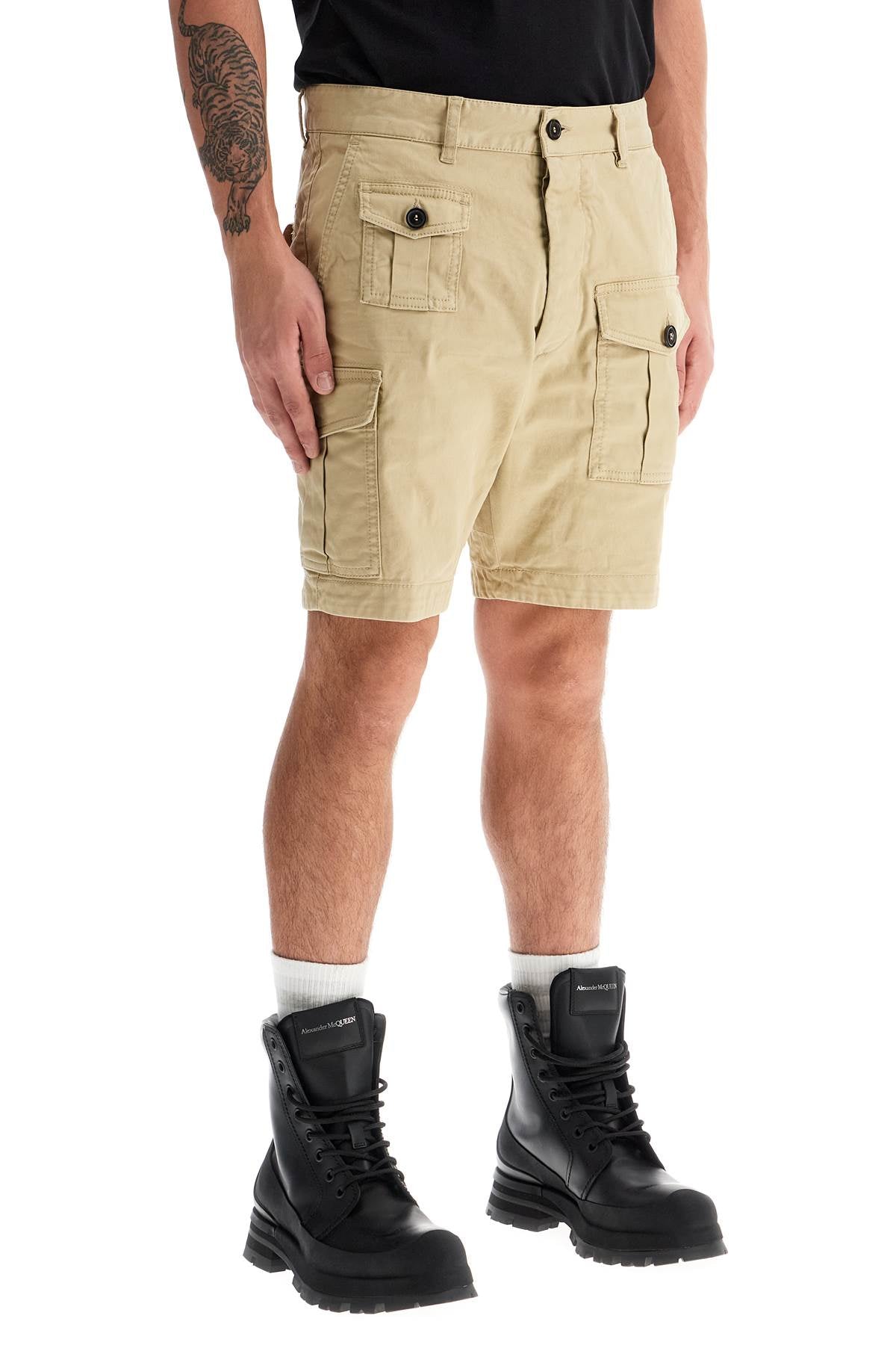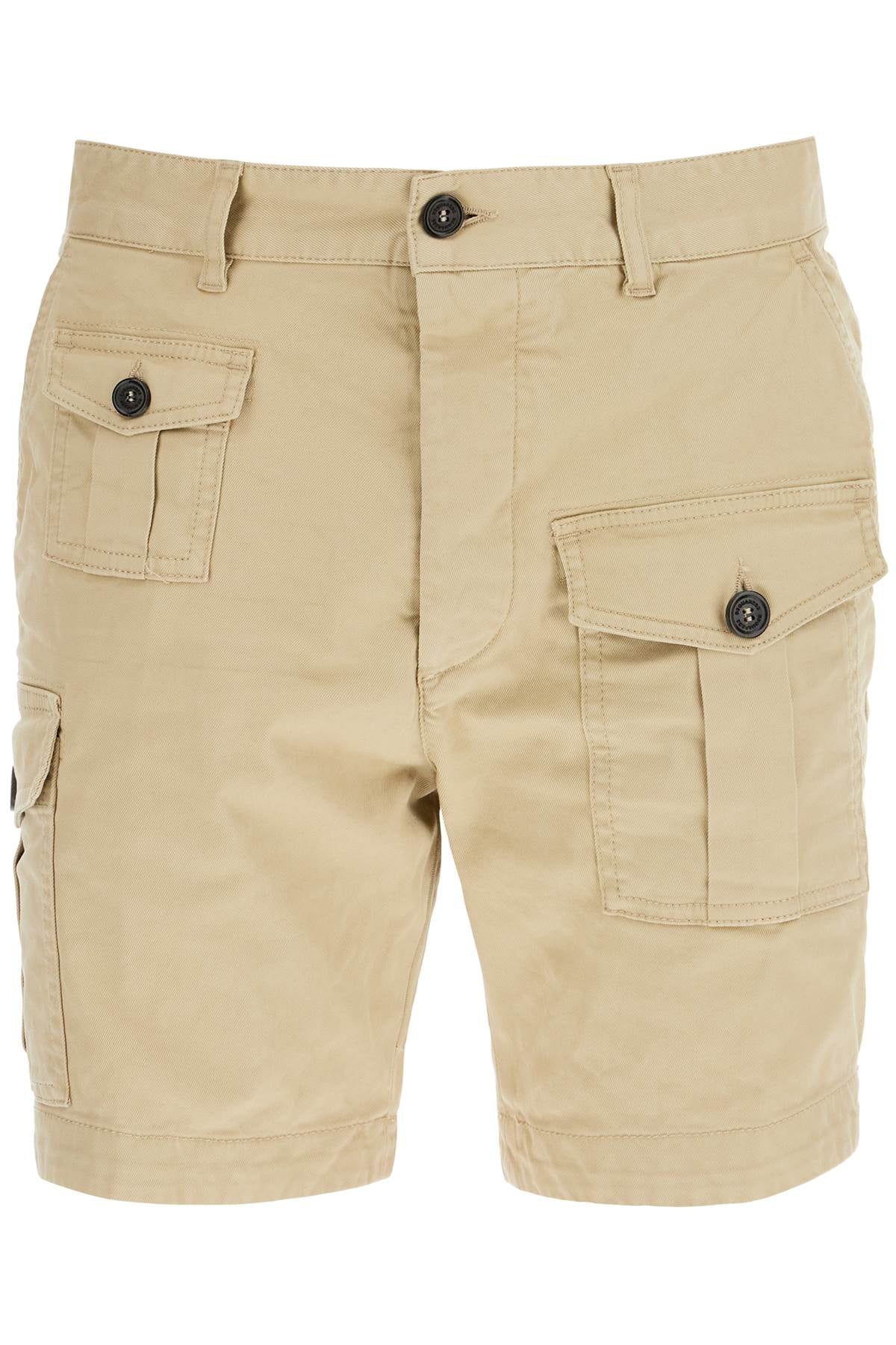 These Dsquared2 Bermuda shorts are made of stretch cotton twill, featuring a cargo-style design with flap pockets on the legs. They have hidden logo buttons for closure, French side pockets, belt loops, and back welt pockets with a button. The slim fit has a tapered Sexy Cargo cut. The model is 182 cm tall and wears an IT size 46.