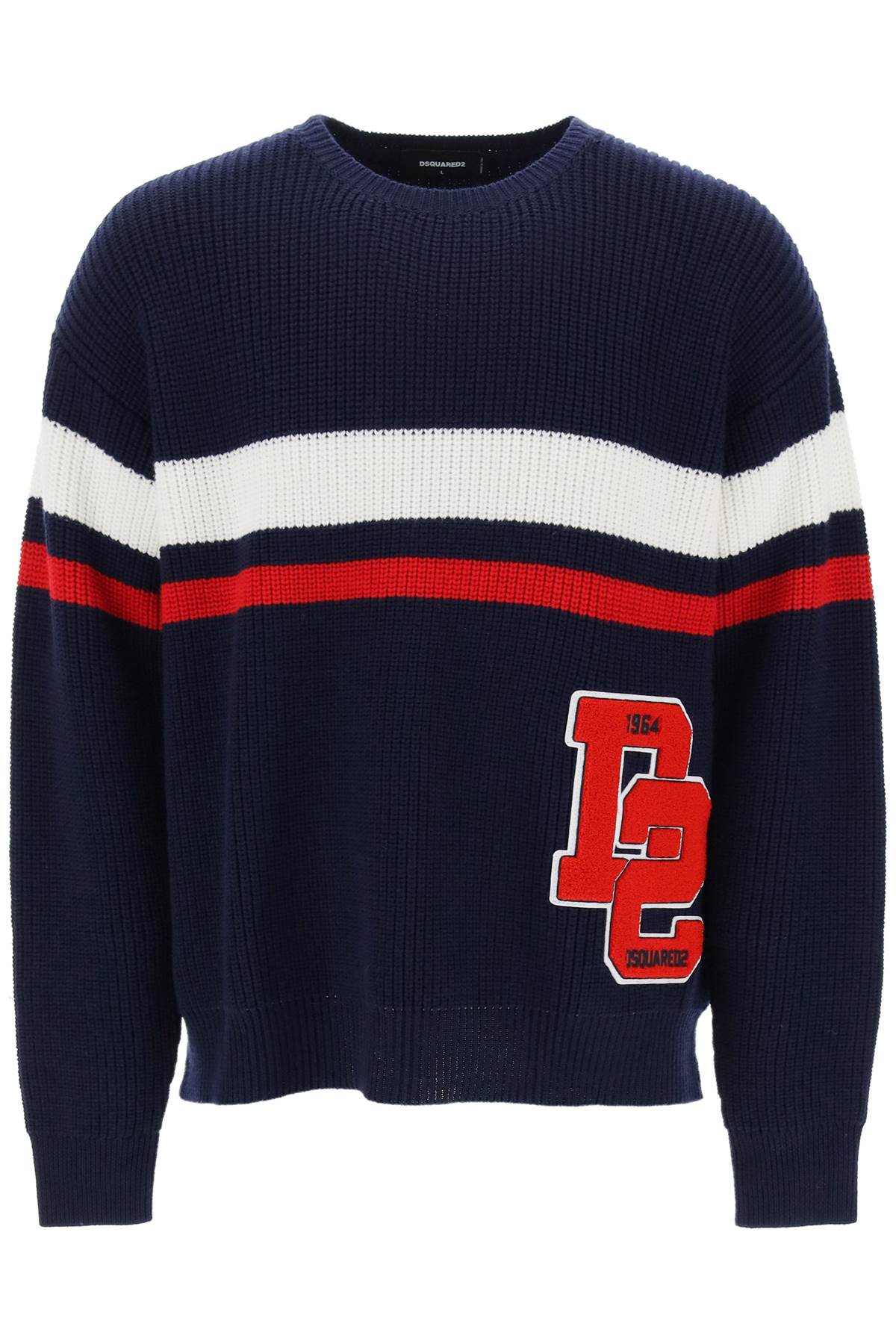 Rib knitted from soft pure wool to an oversized fit, this Dsquared2 crew-neck sweater features a striped motif and a varsity-style terry logo patch. The model is 187 cm tall and wears a size L.