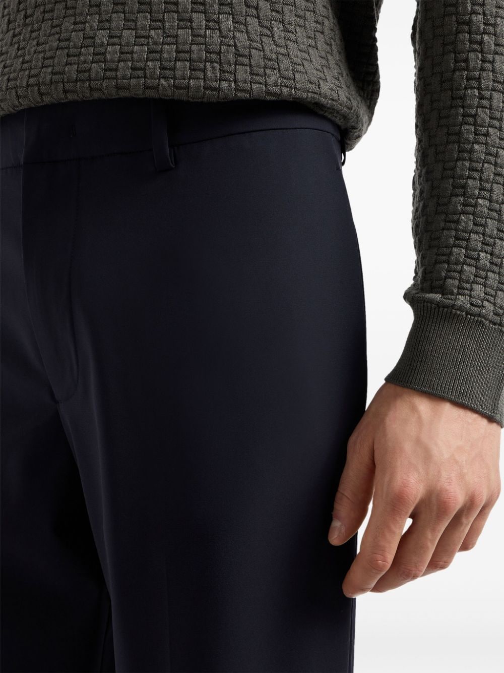 navy blue fluid slip pockets to the sides rear welt pocket lightweight concealed front button, hook and zip fastening Size and Fit - This piece fits true to size. We recommend you get your regular size. Model is 1,84m / 6ft 1in wearing size 48 (IT)