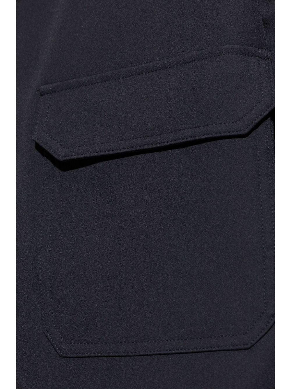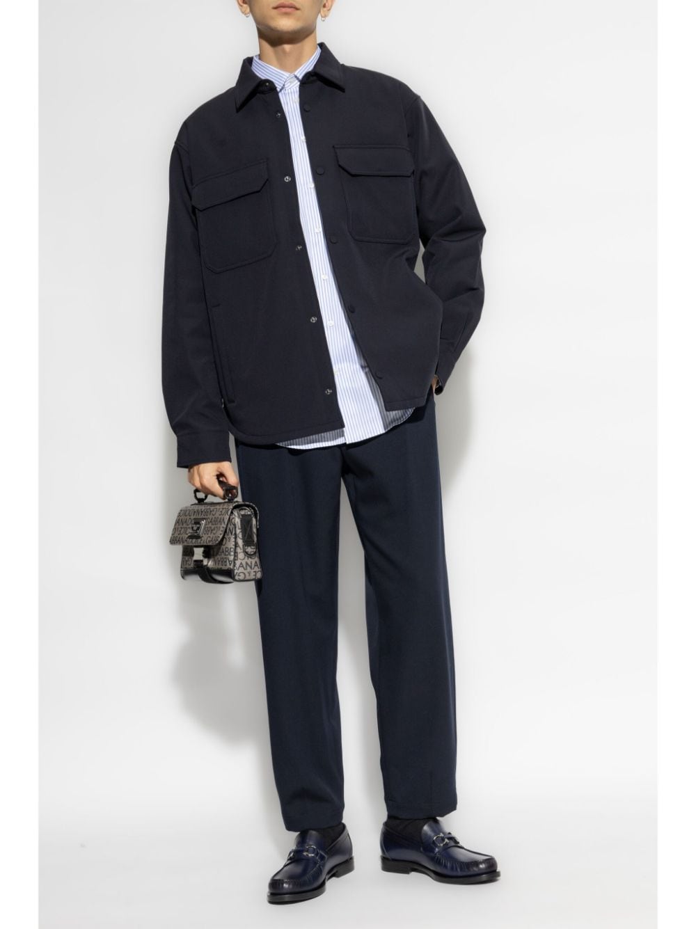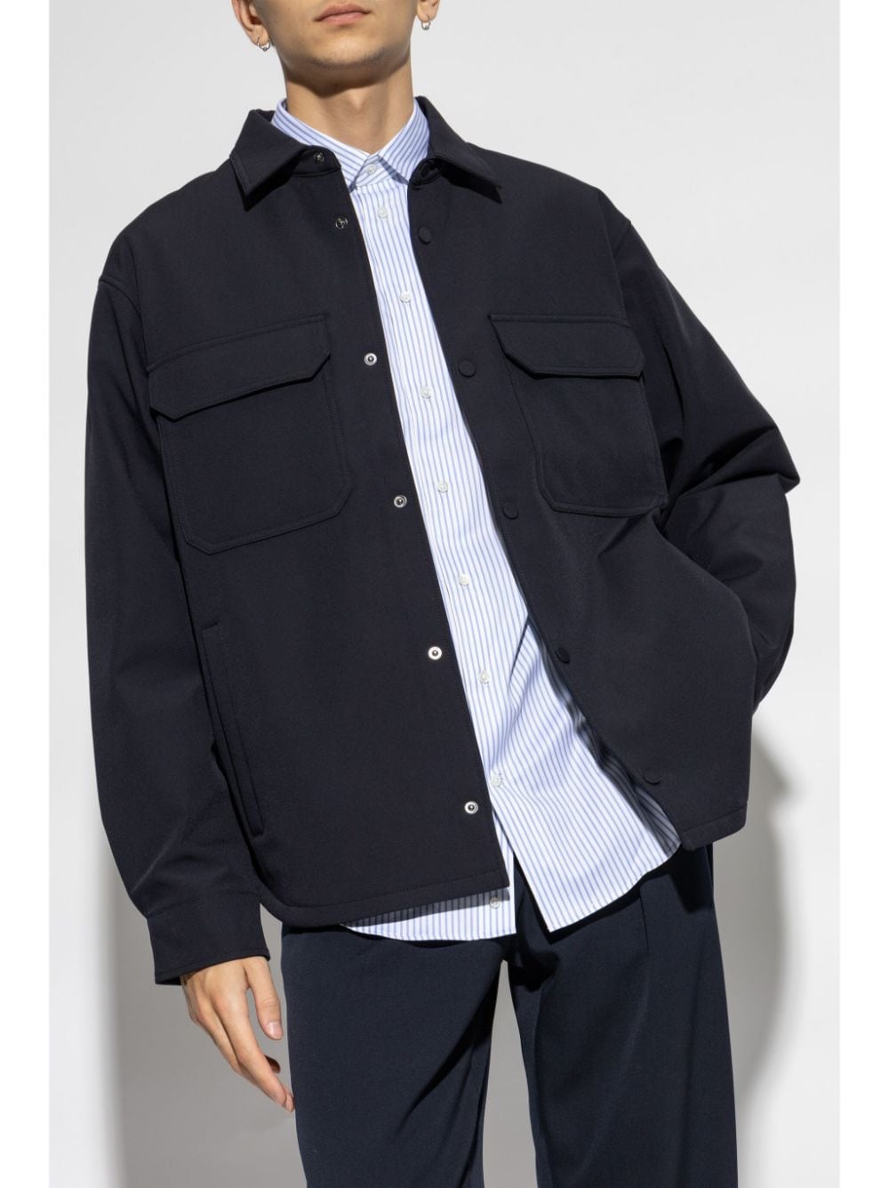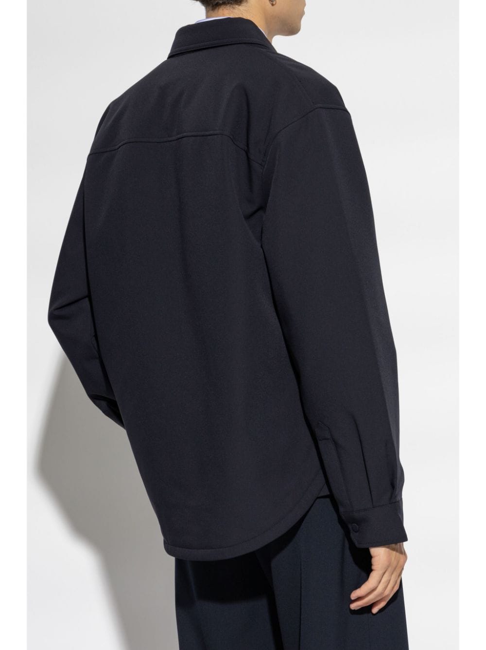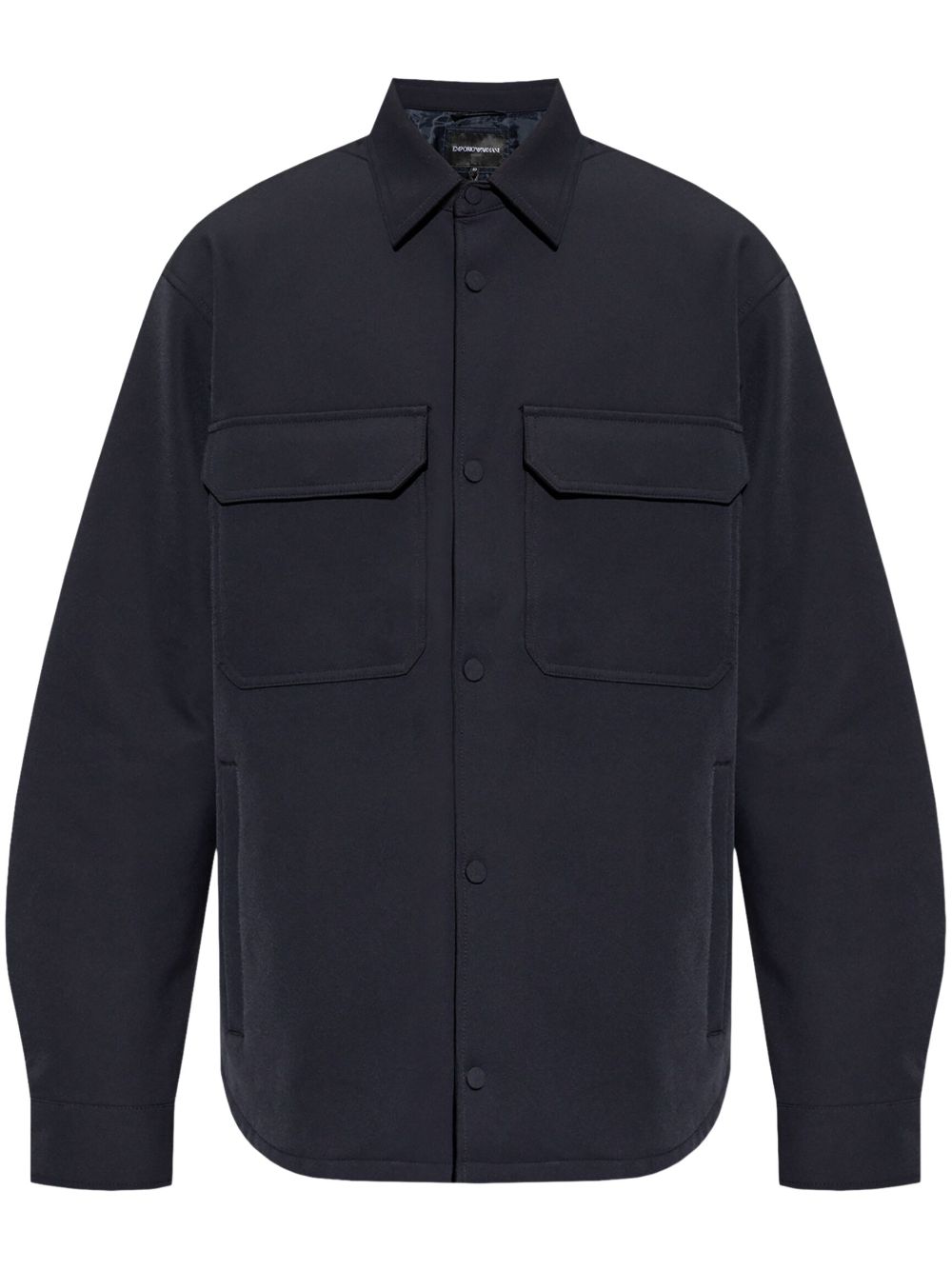 navy blue classic collar button fastening two chest flap pockets long sleeves rear curved hem buttoned cuffs Size and Fit - This piece fits true to size. We recommend you get your regular size. Model is 1,84m / 6ft 1in wearing size 48 (IT)