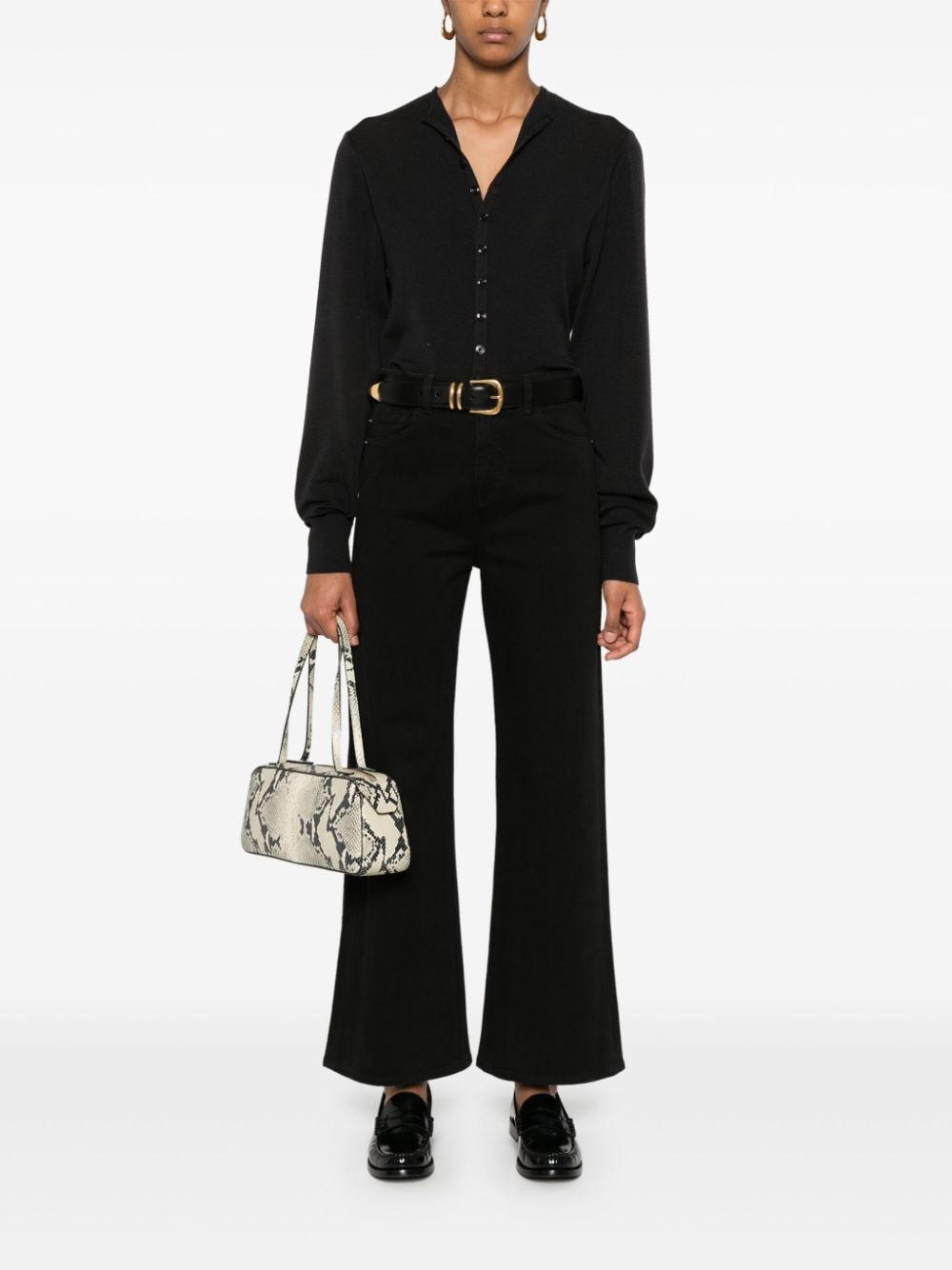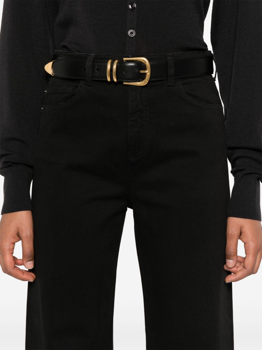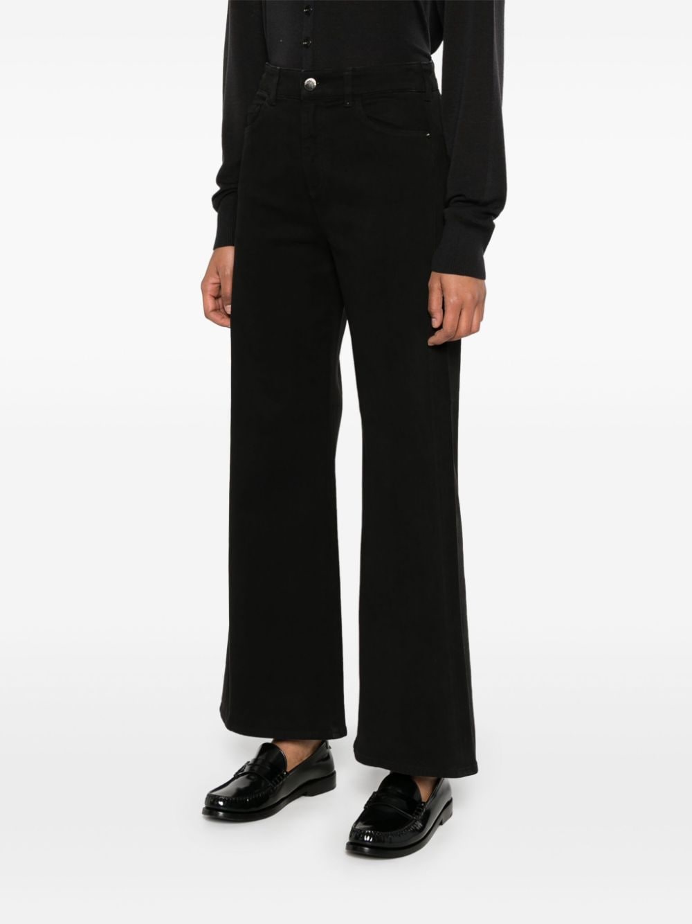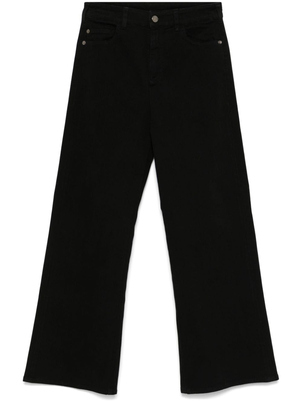 black stretch-cotton denim concealed fly and button fastening mid-rise belt loops classic five pockets leather tag logo plaque flared Size and Fit - This piece fits true to size. We recommend you get your regular size. Model is 1,75m / 5ft 8in wearing size 27 (WAIST CM)